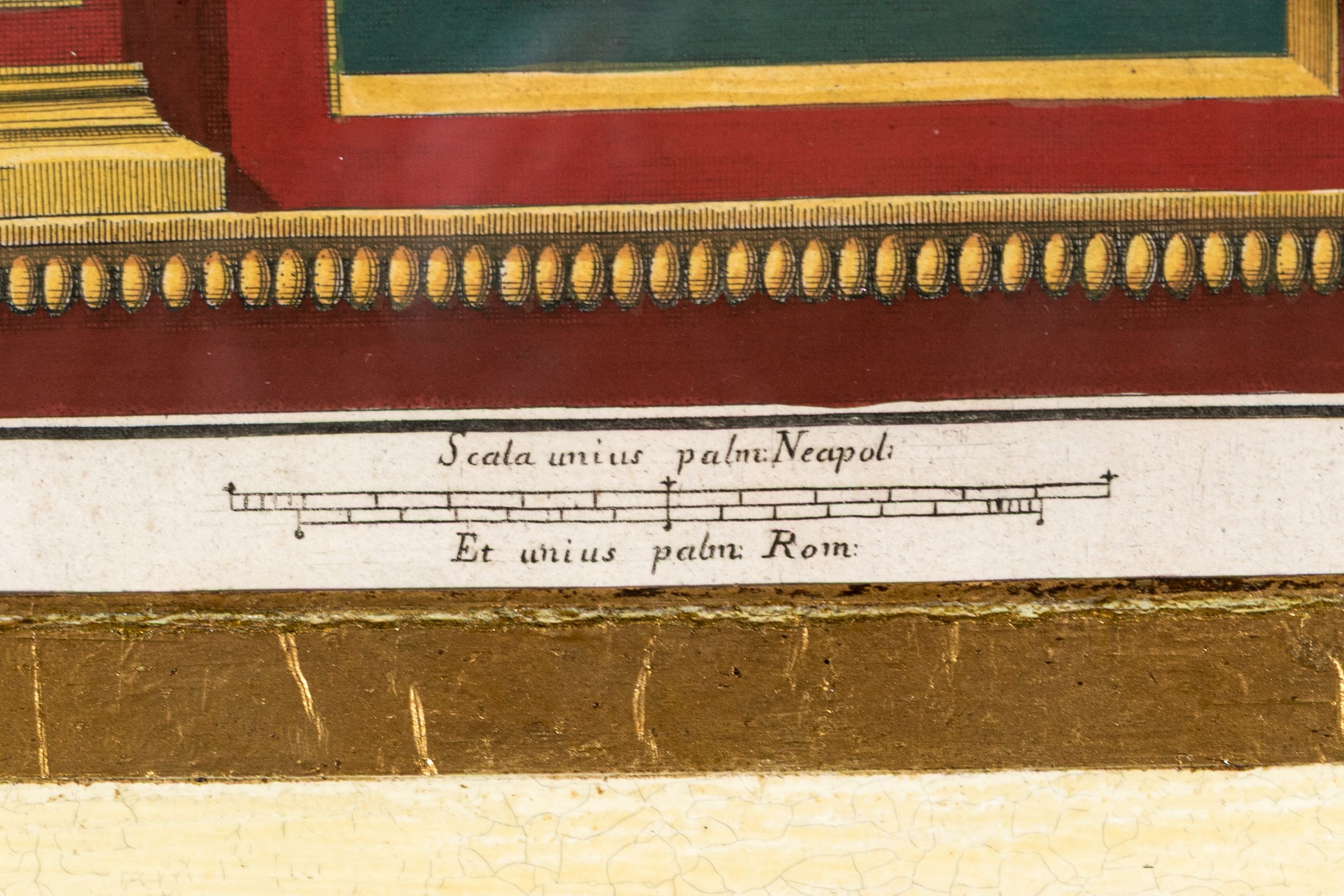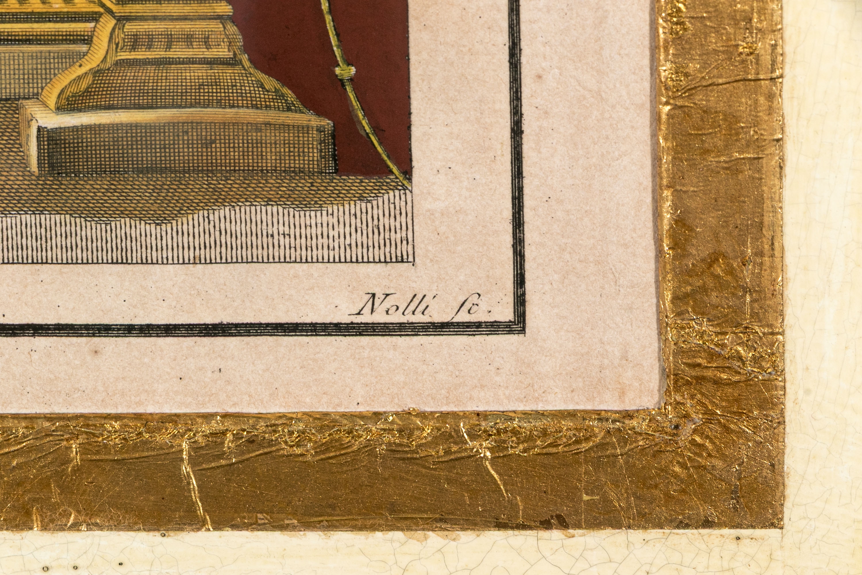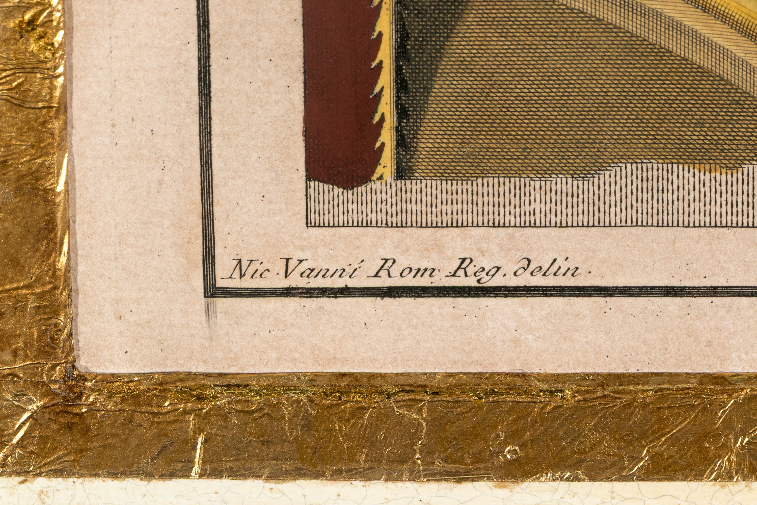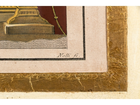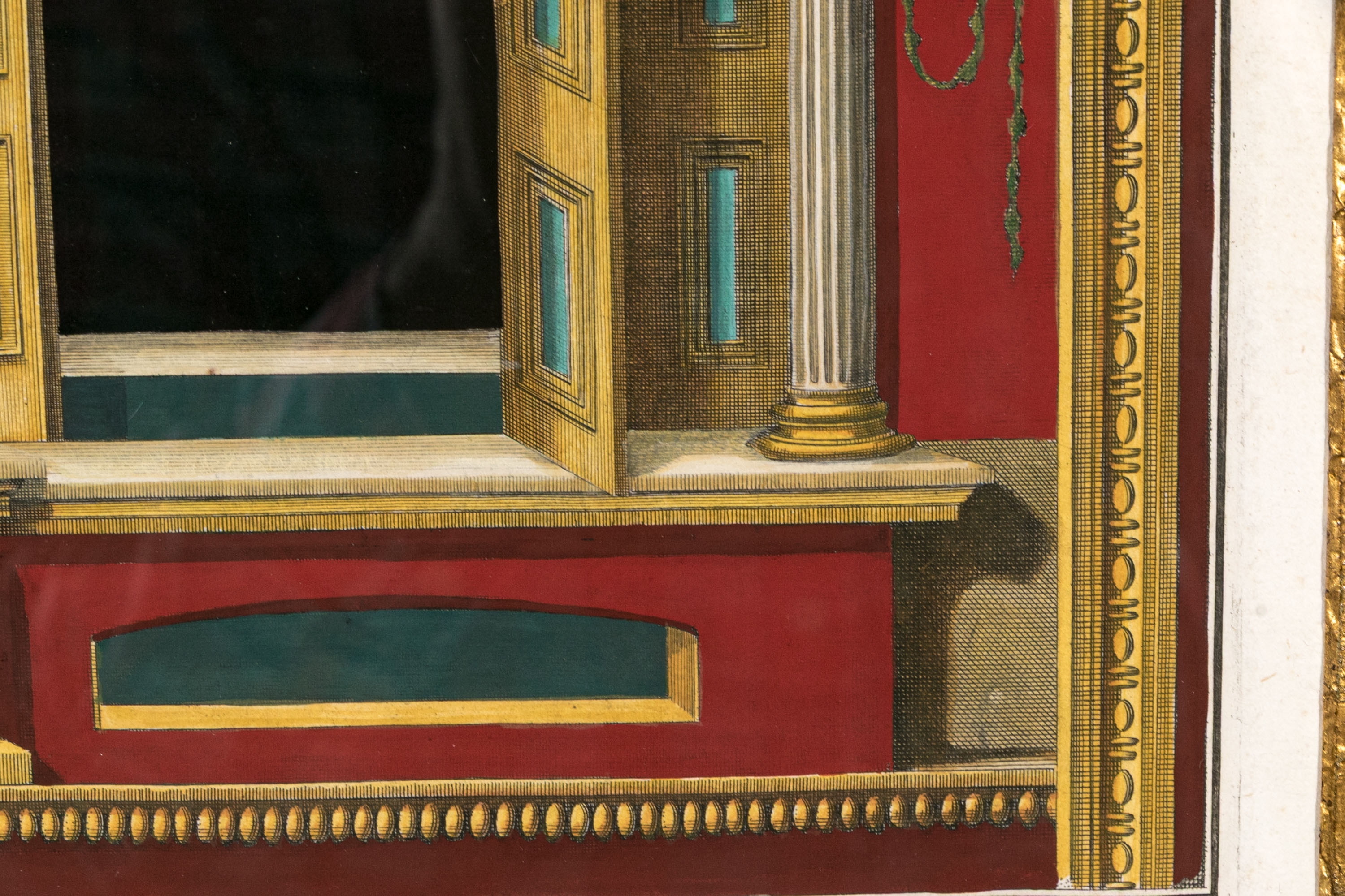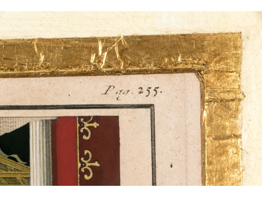An exceptionally custom framed set of two hand-colored 18th C. engravings on paper. The hand-colored prints depict architectural interior scenes, marked Nic Vanni Rom Reg. delin lower left. The two book plate prints include plates number Pag 255, and Pag 221.