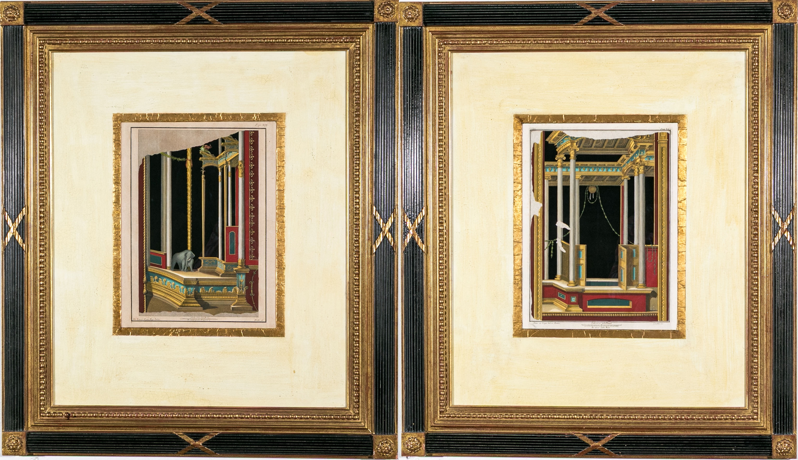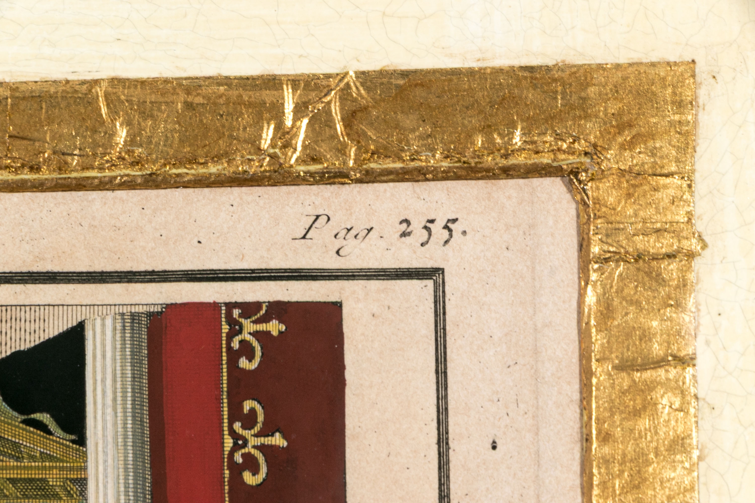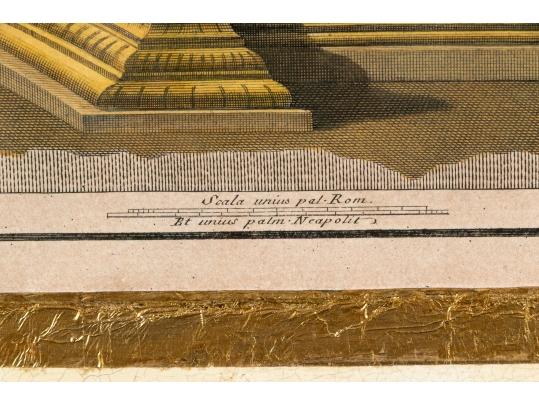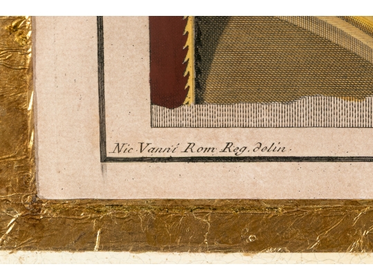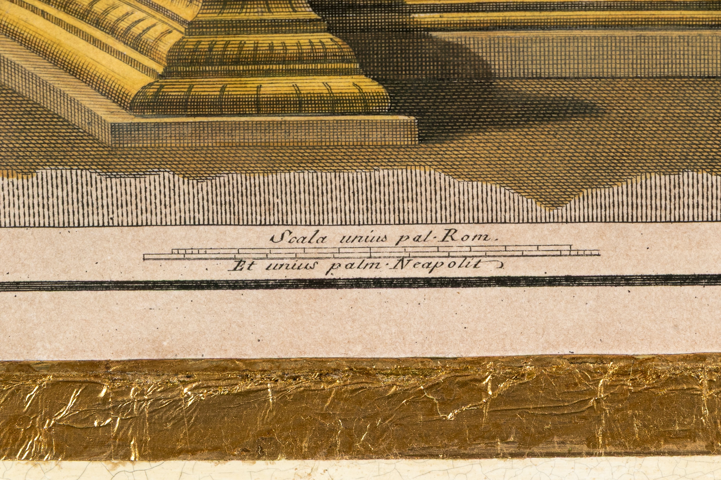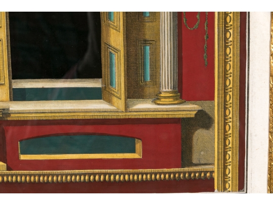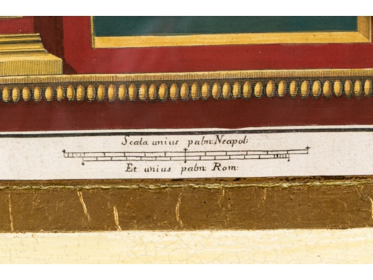 An exceptionally custom framed set of two hand-colored 18th C. engravings on paper. The hand-colored prints depict architectural interior scenes, marked Nic Vanni Rom Reg. delin lower left. The two book plate prints include plates number Pag 255, and Pag 221.