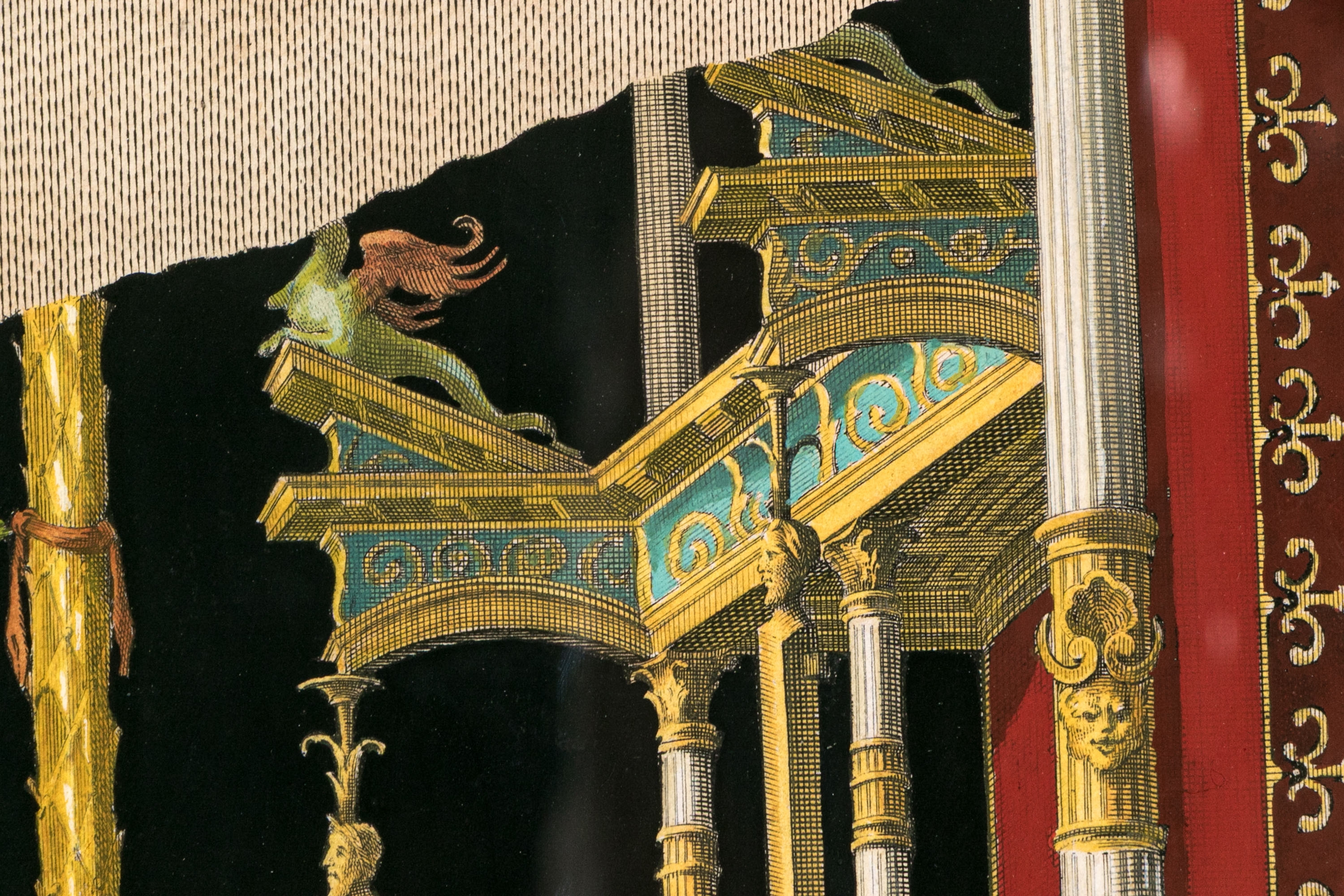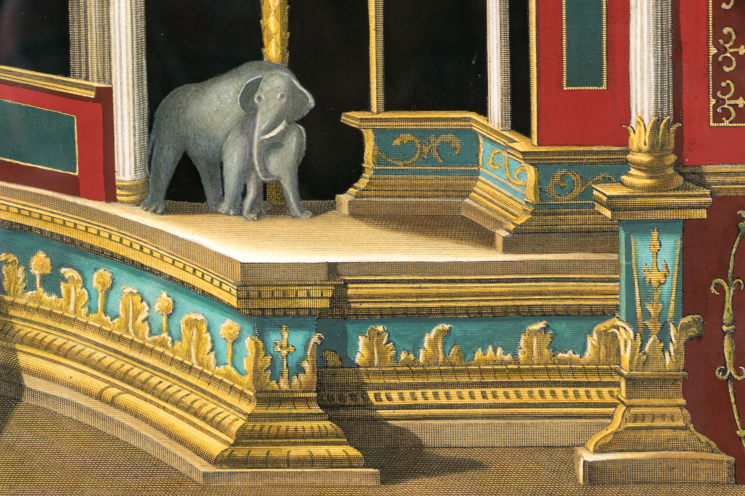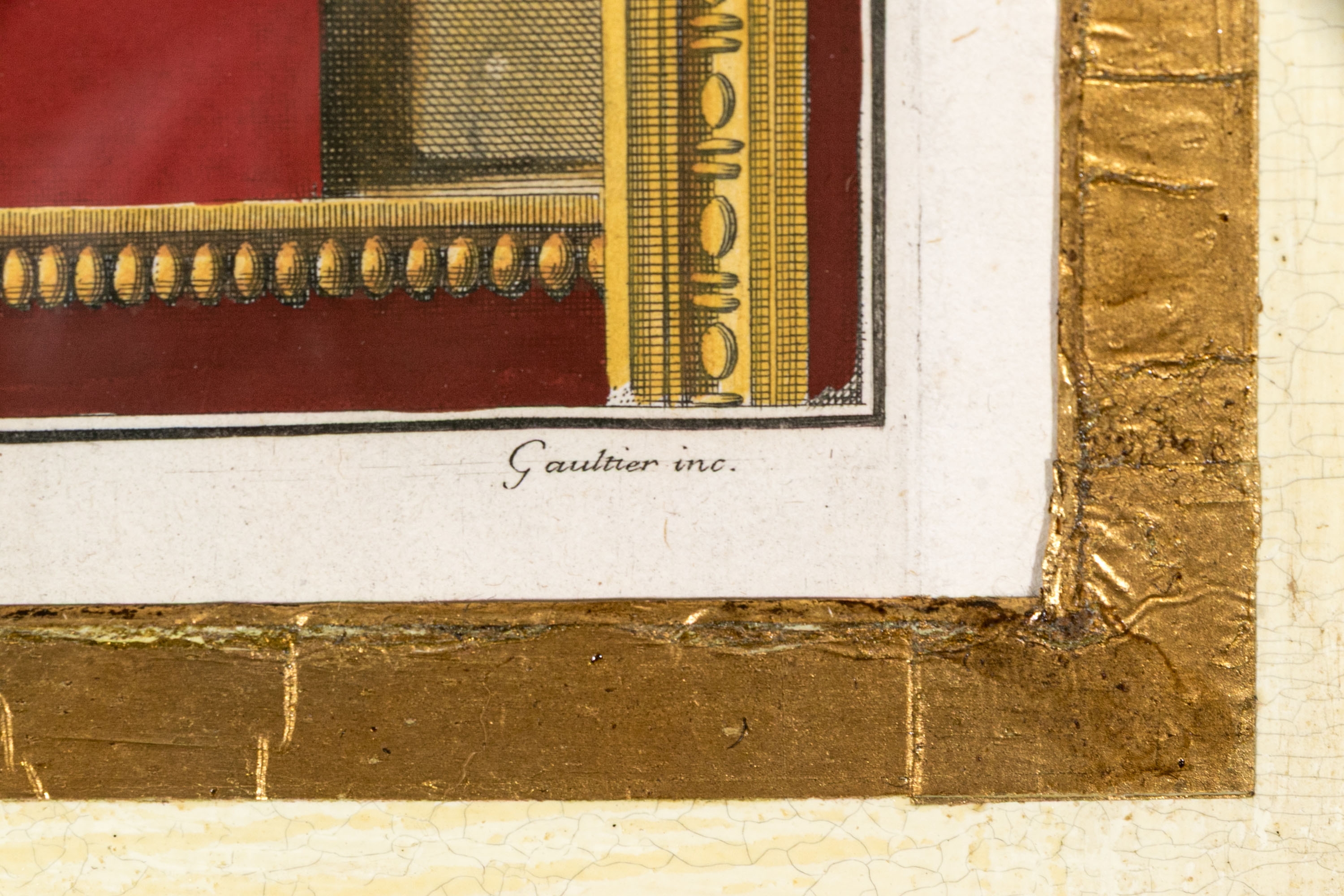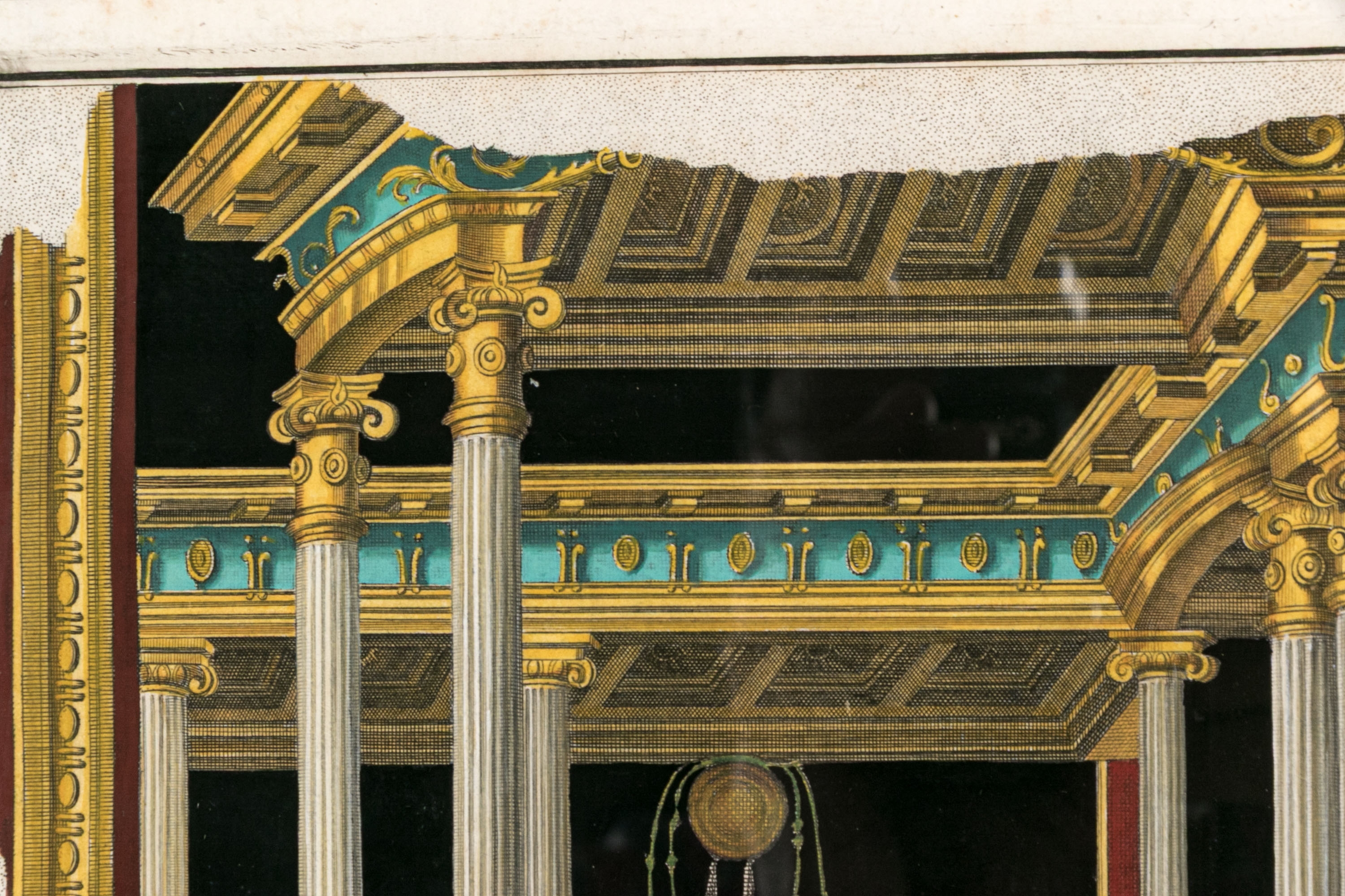 An exceptionally custom framed set of two hand-colored 18th C. engravings on paper. The hand-colored prints depict architectural interior scenes, marked Nic Vanni Rom Reg. delin lower left. The two book plate prints include plates number Pag 255, and Pag 221.