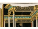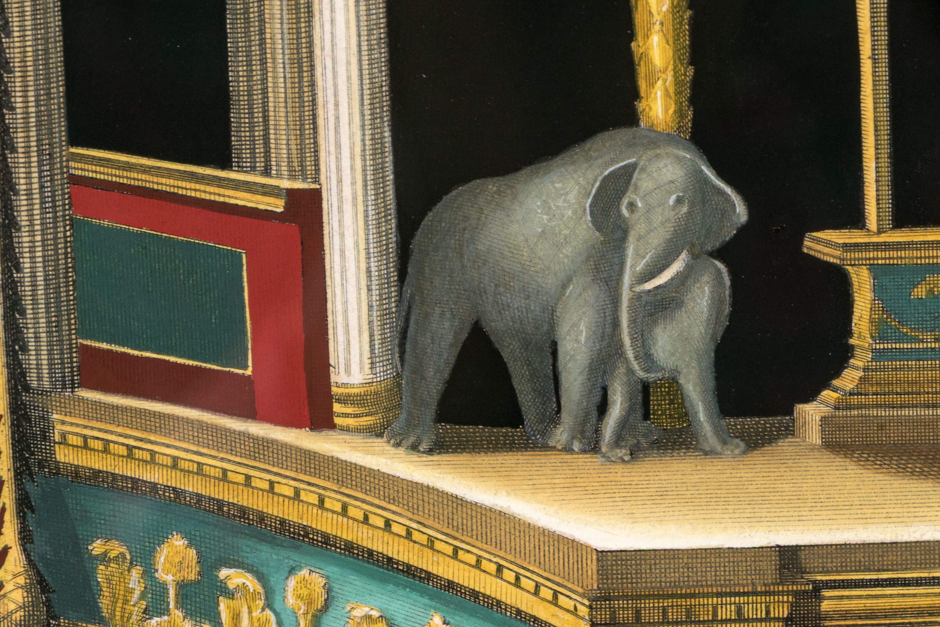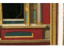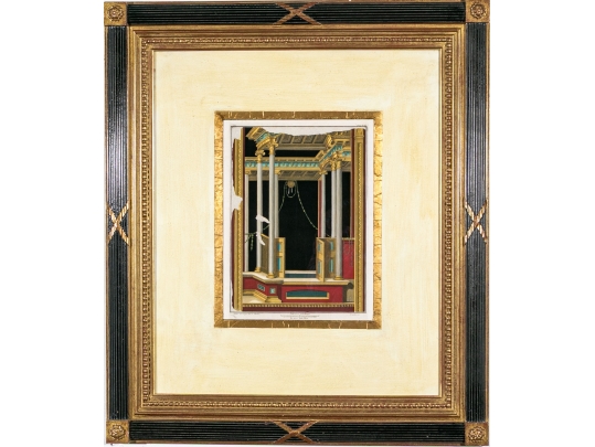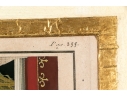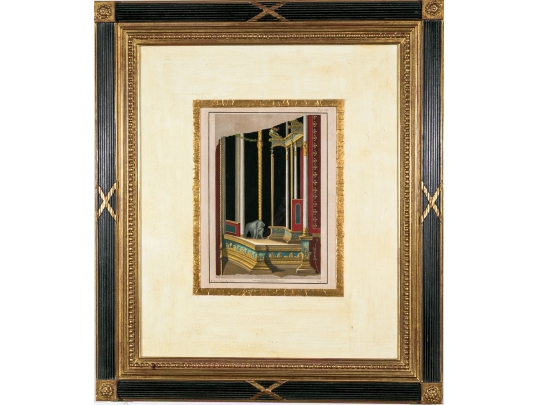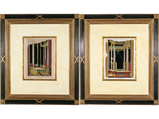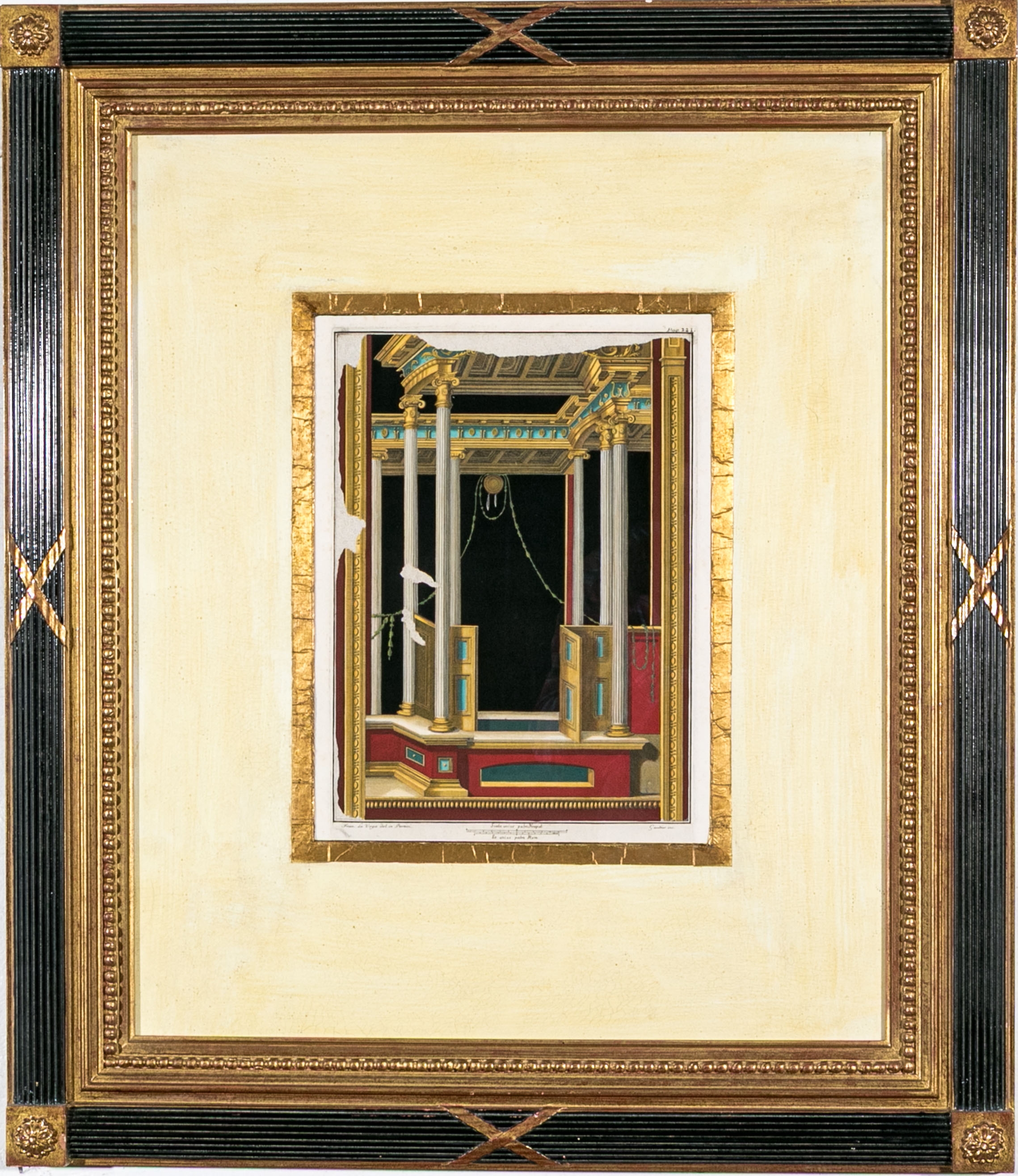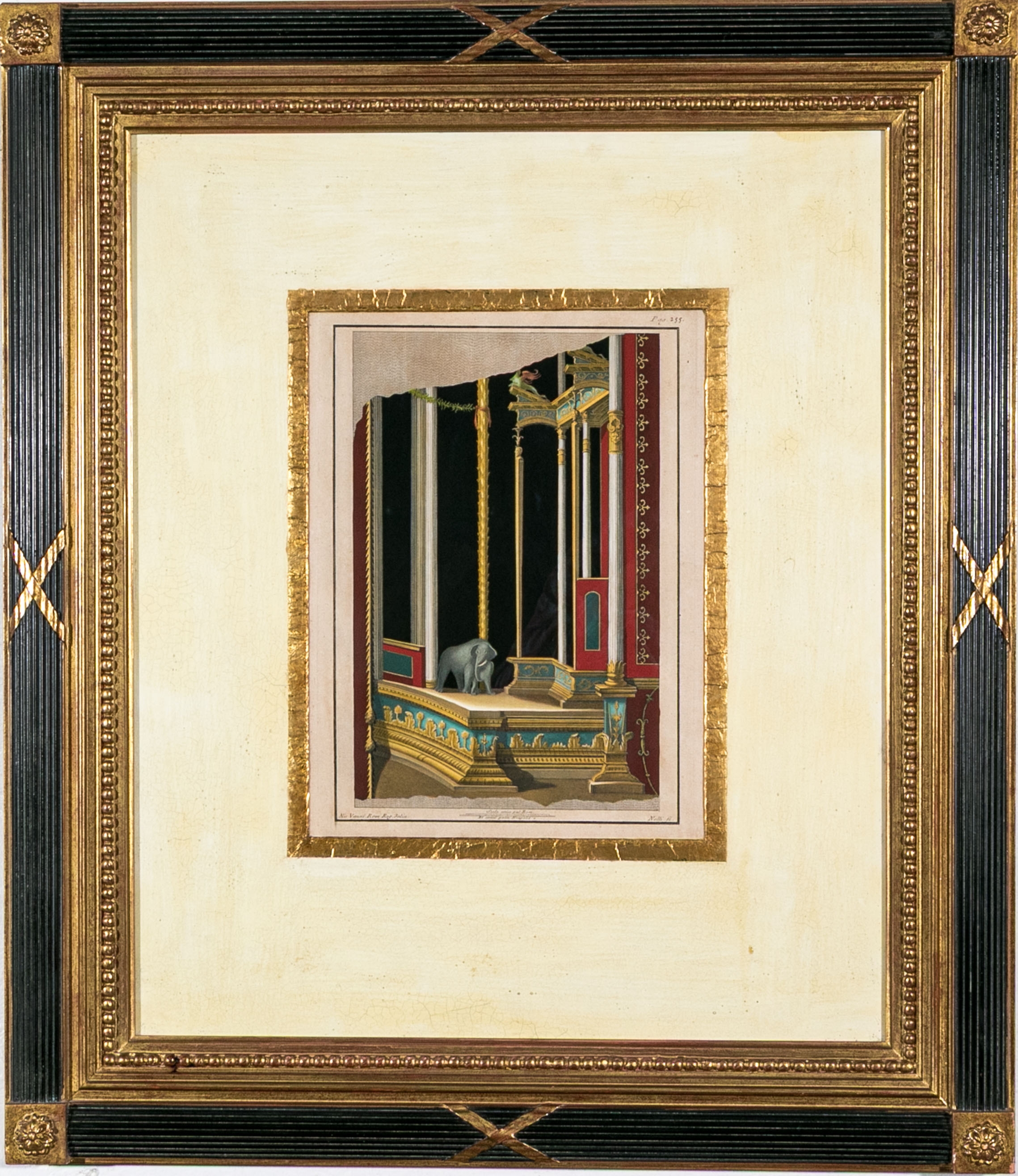 Each of the antique hand-colored engravings are exceptionally custom framed. presented with gold leaf borders surrounding the artwork, with hand-painted mats, in fabulously carved wood and gesso frames with gilt and ebonized finishes having neoclassical columns in ebonized finish with interior beaded and carved gilt finish. Additionally each corner of the frame with gilt finish and carved medallions seen in relief.