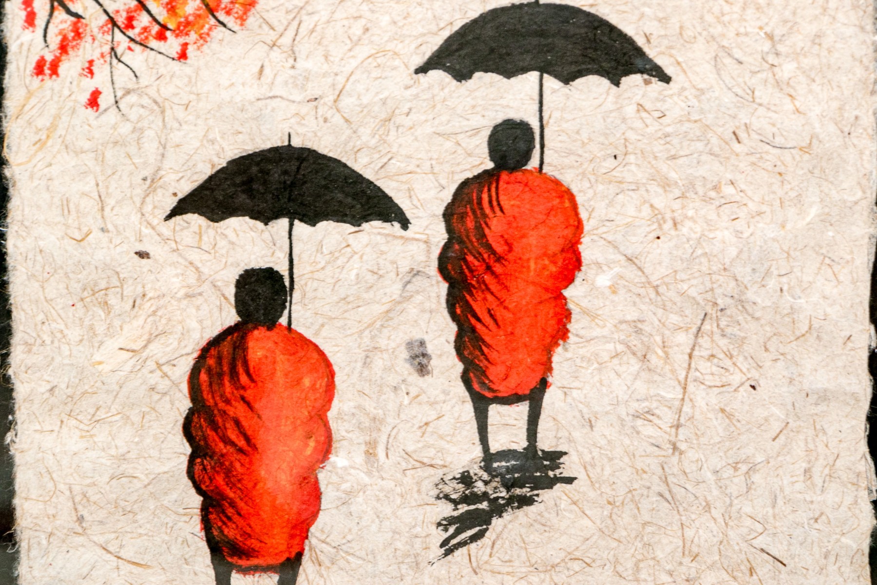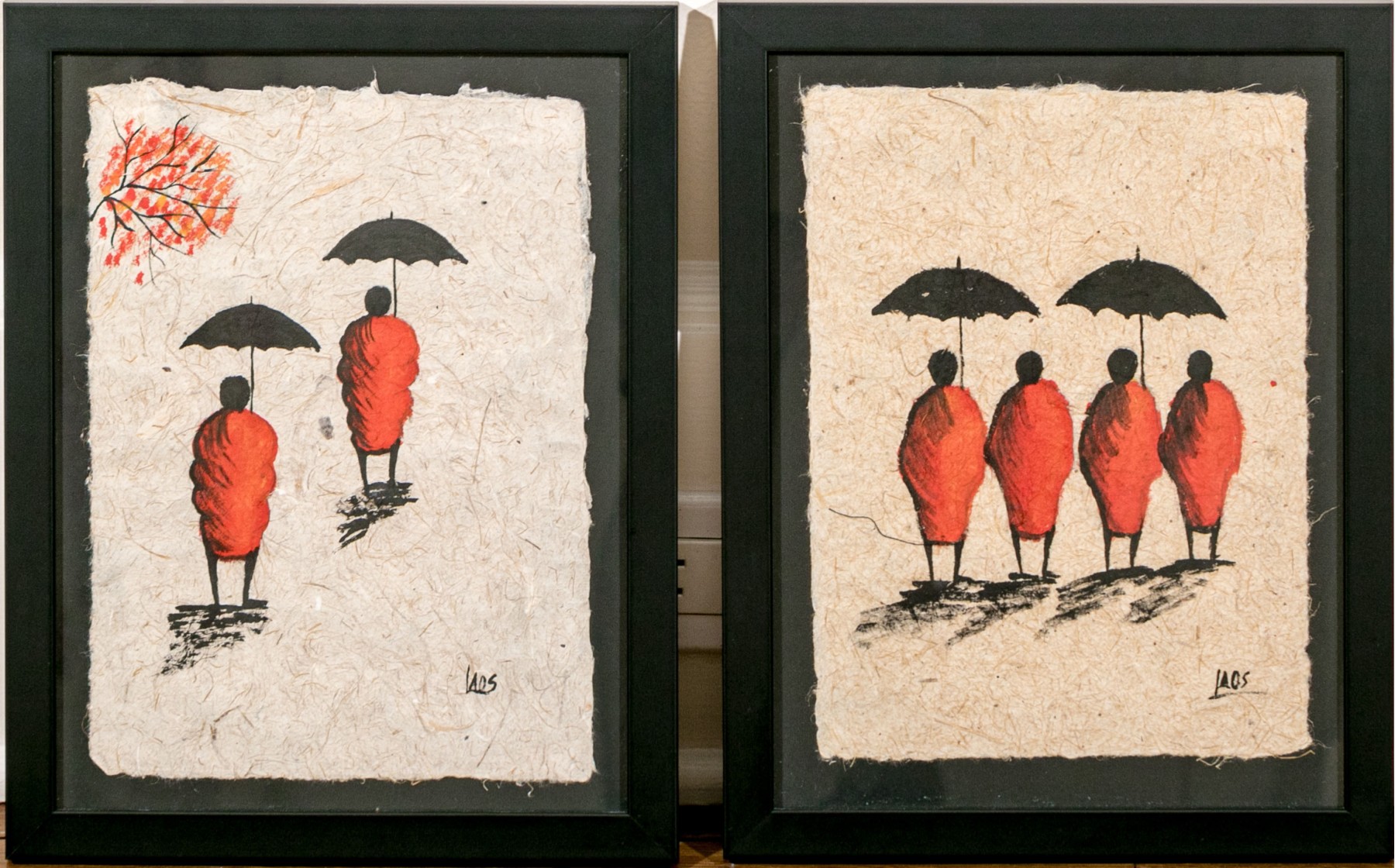 Both paintings are likely oil on mulberry paper and depict figures wearing traditional red robes with umbrellas over head.