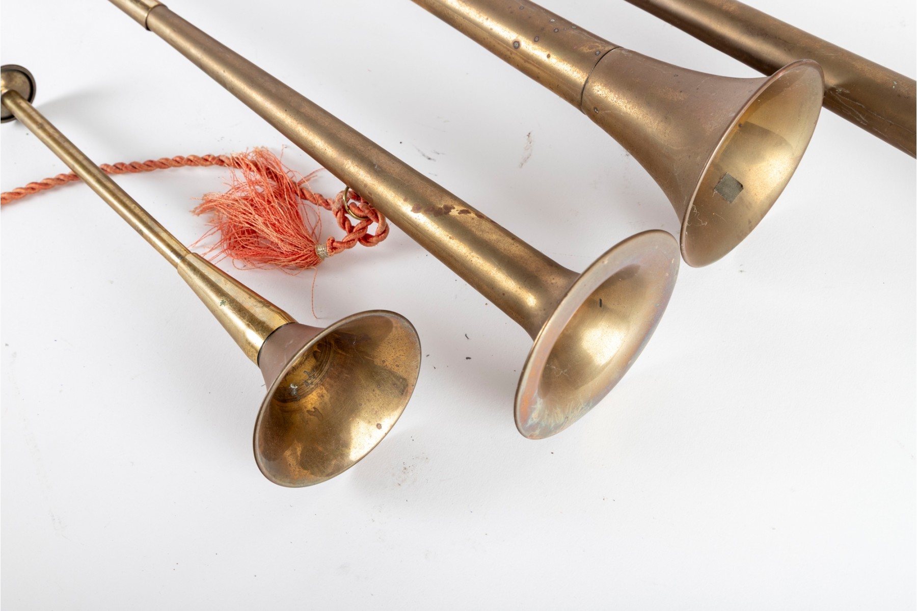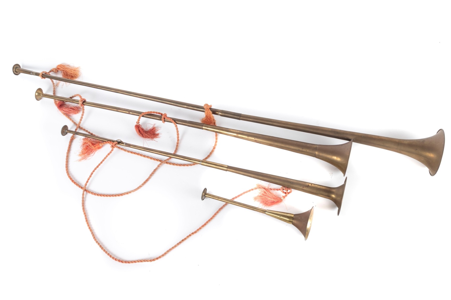 A striking ensemble of four vintage brass herald trumpets, each featuring elongated straight tubing and flared bells. Graduating sizes.