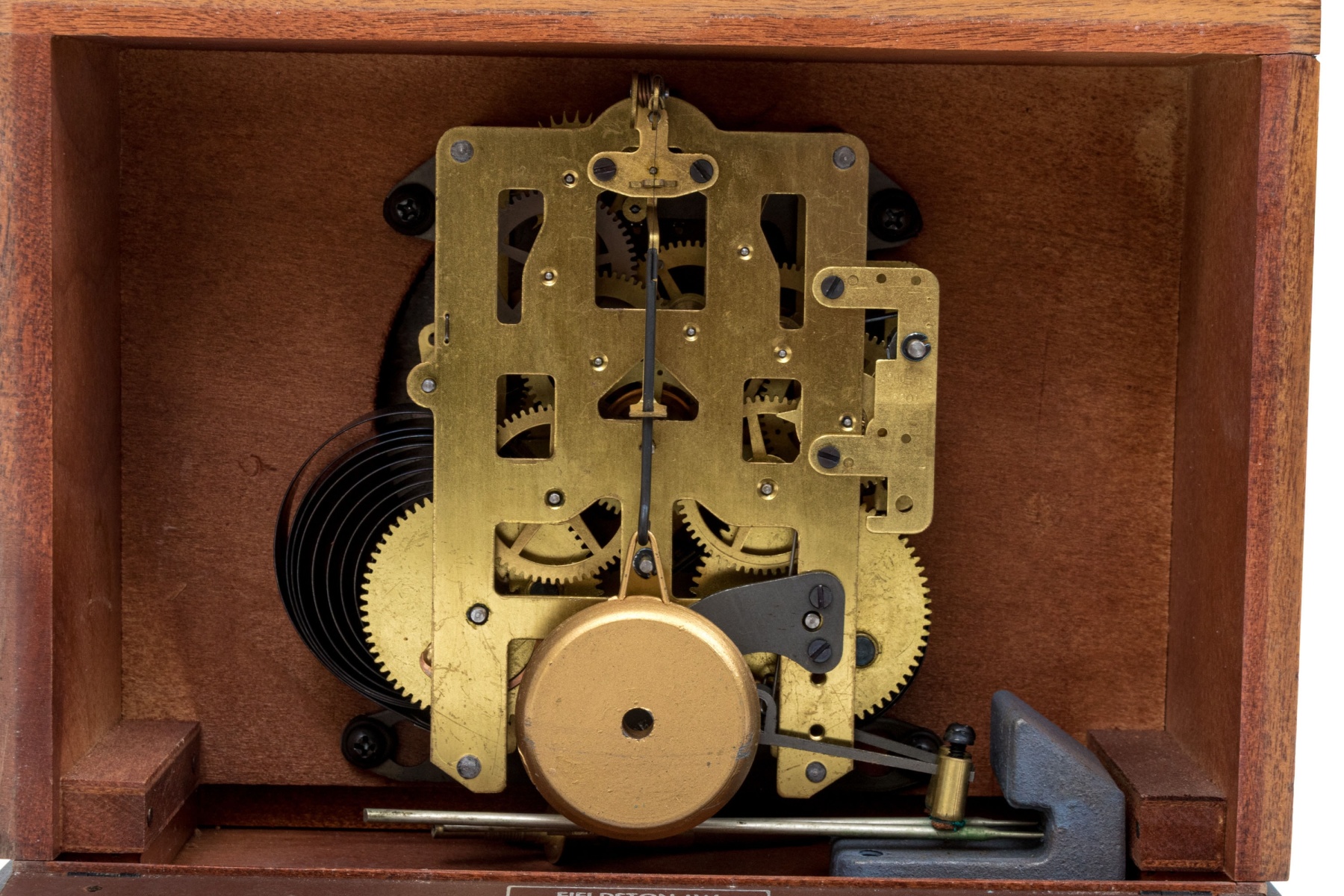 Raised on a base, the rectangular case with clock face on front of one side. Hinged glass paneled front with wooden surround with brass Arabic Numerals with hour and minute hand. No key is present with the clock.