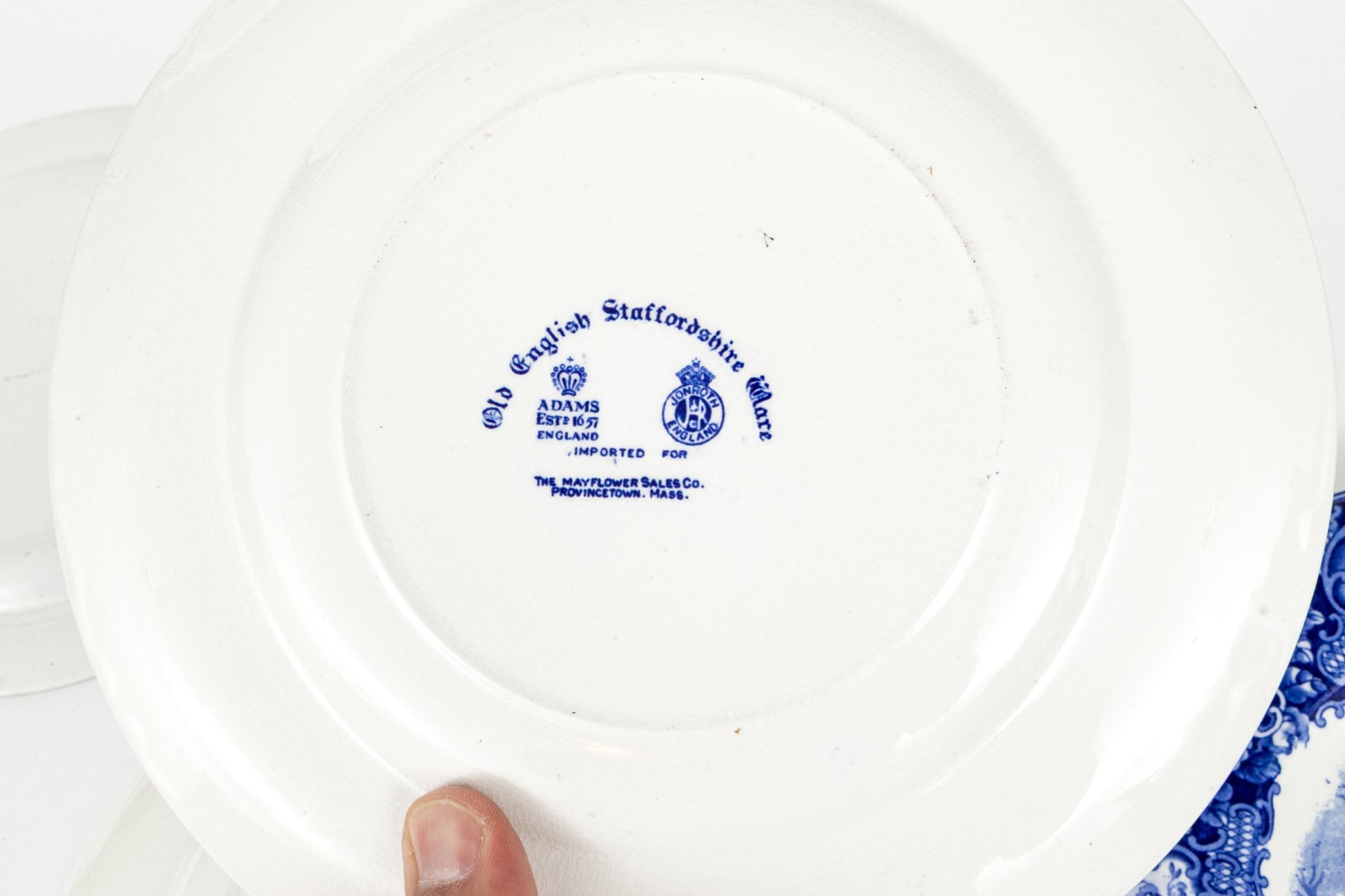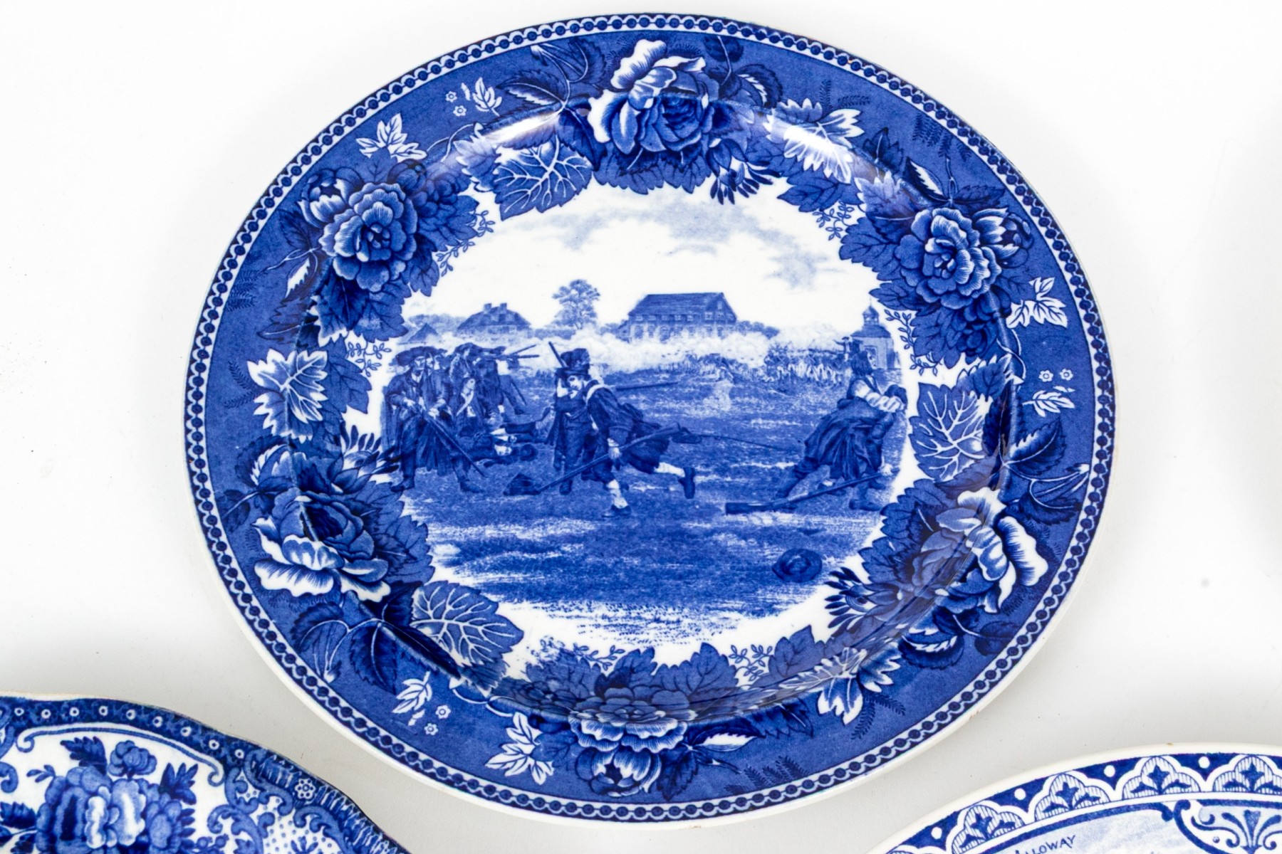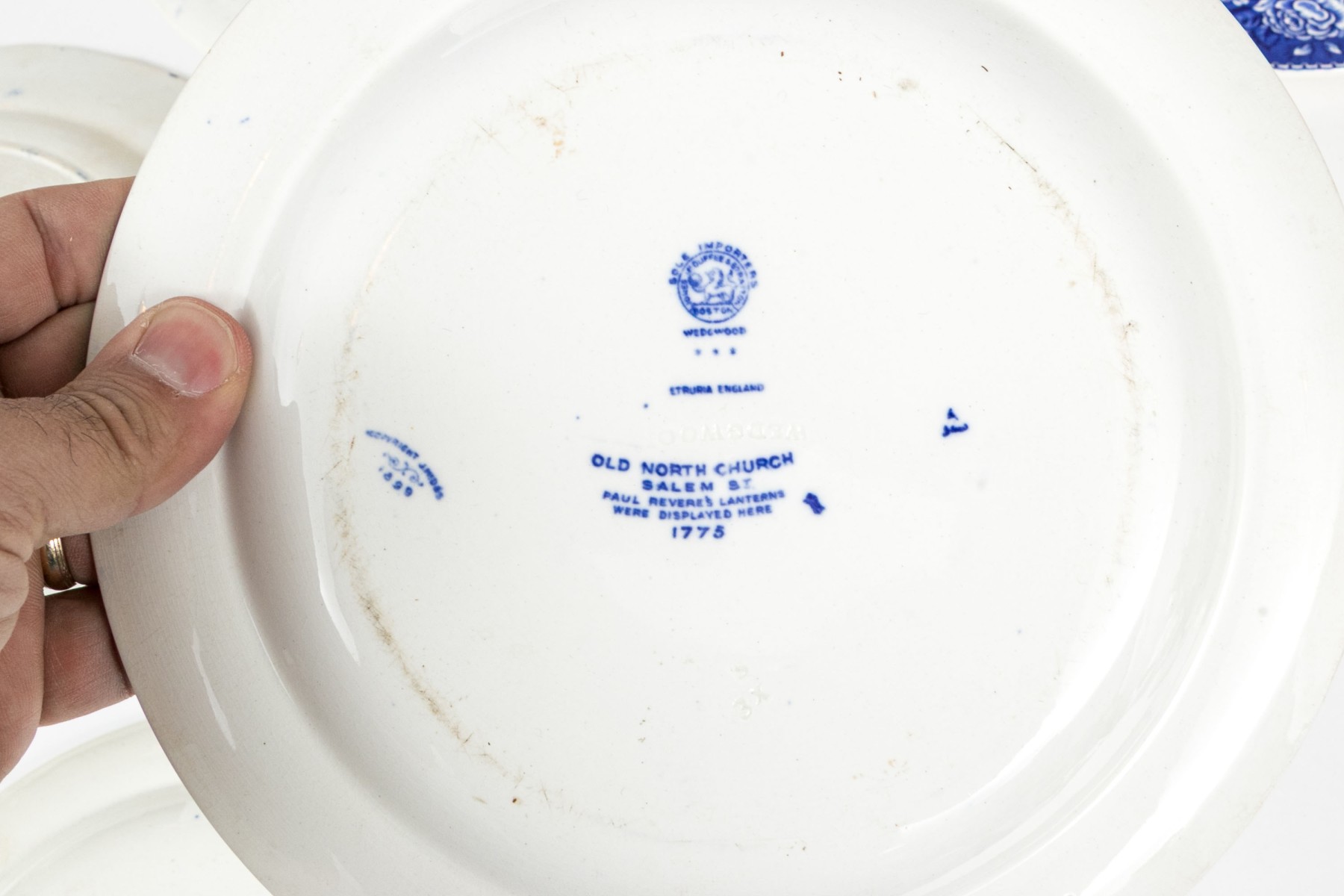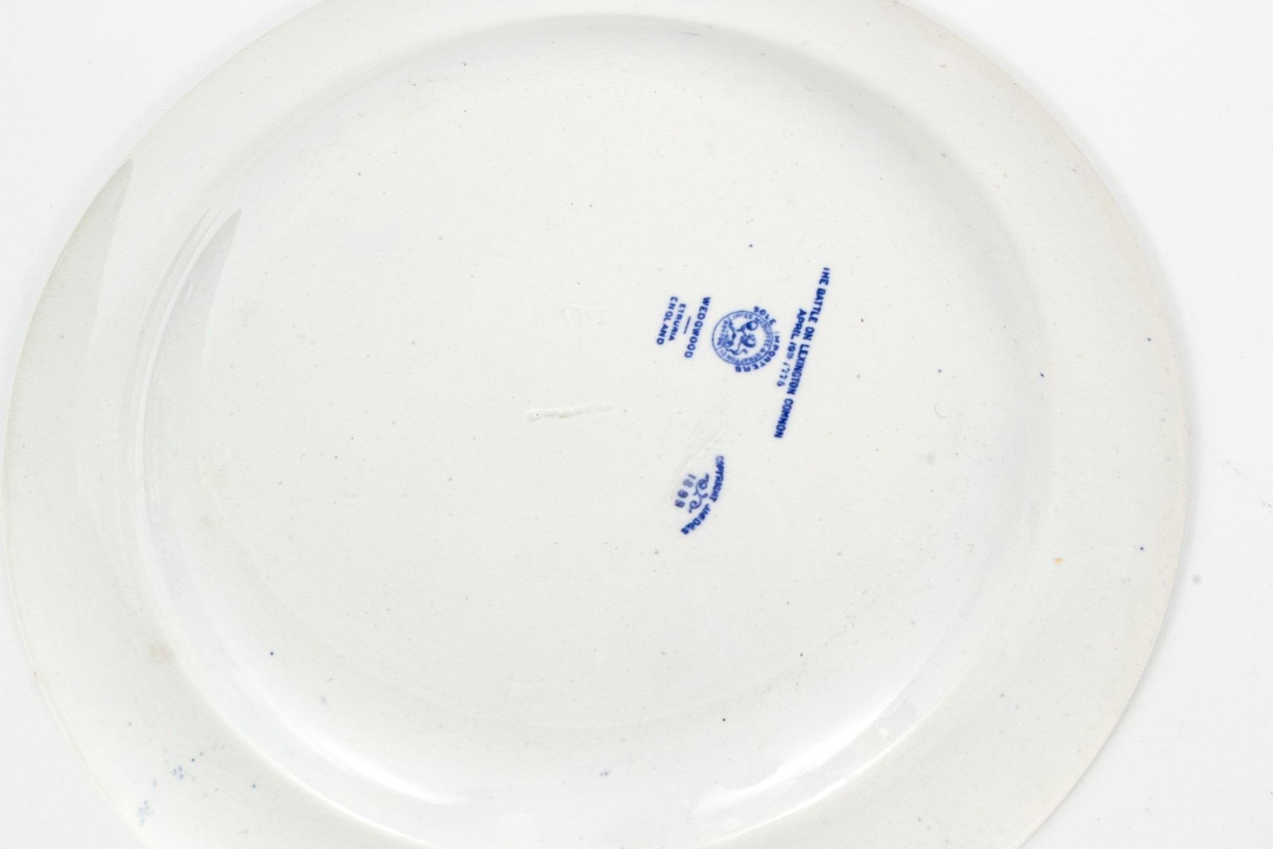 A wonderful collection of seven English ceramic plates including Wedgwood and Adams, all decorated with beautifully detailed monochromatic blue and white transferware scenes of figures, architecture, and nature. Each marked underfoot.