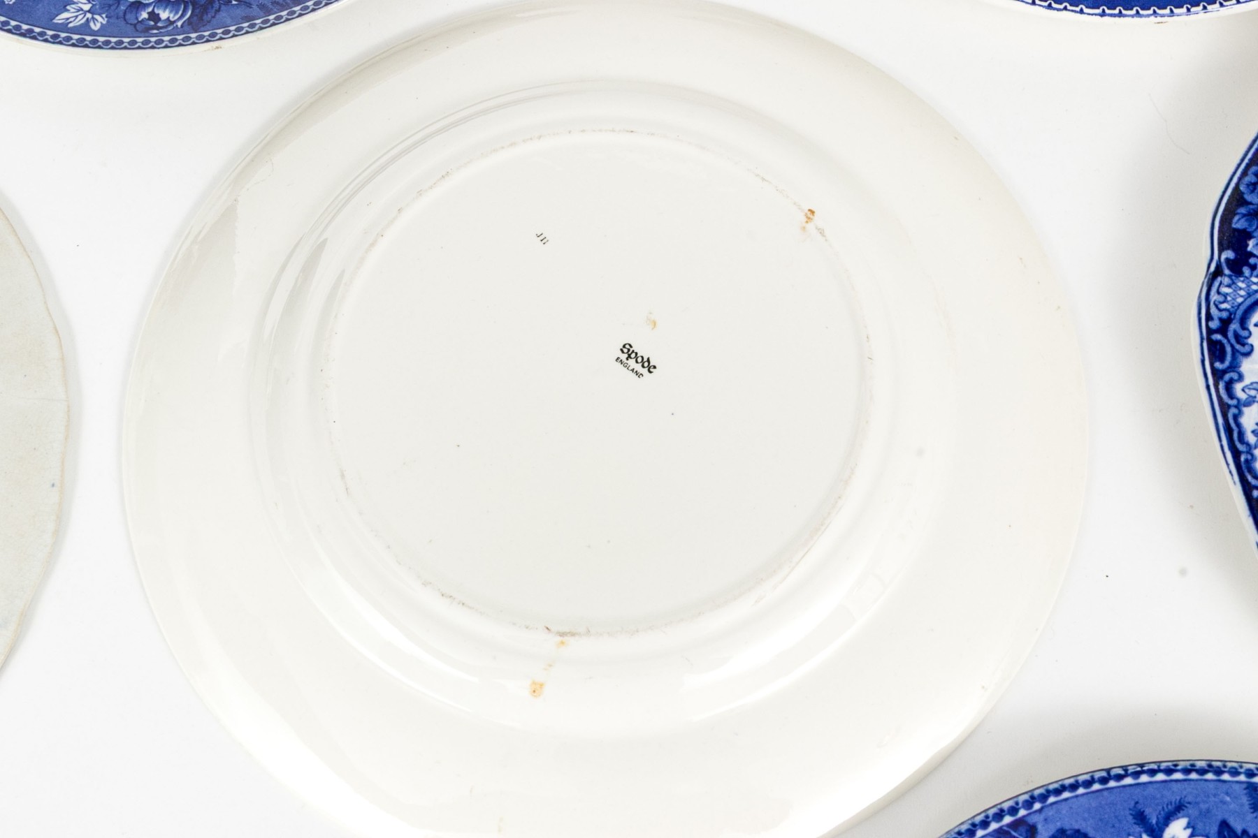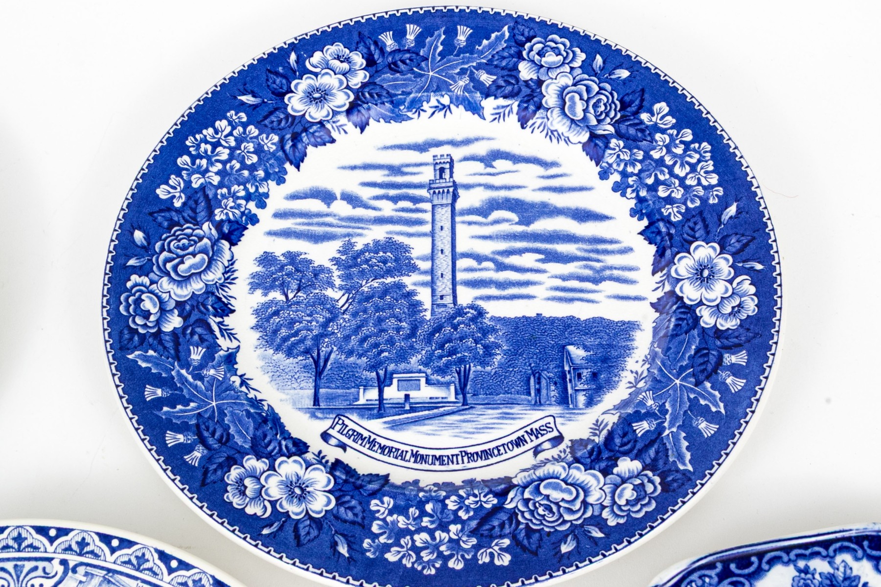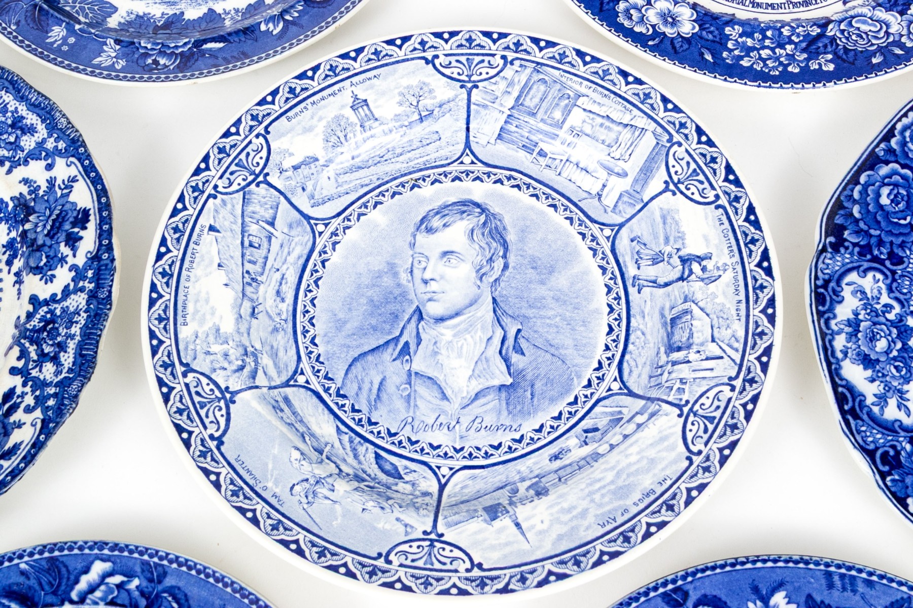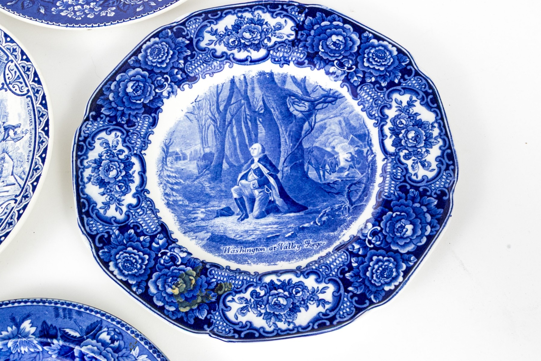 A wonderful collection of seven English ceramic plates including Wedgwood and Adams, all decorated with beautifully detailed monochromatic blue and white transferware scenes of figures, architecture, and nature. Each marked underfoot.