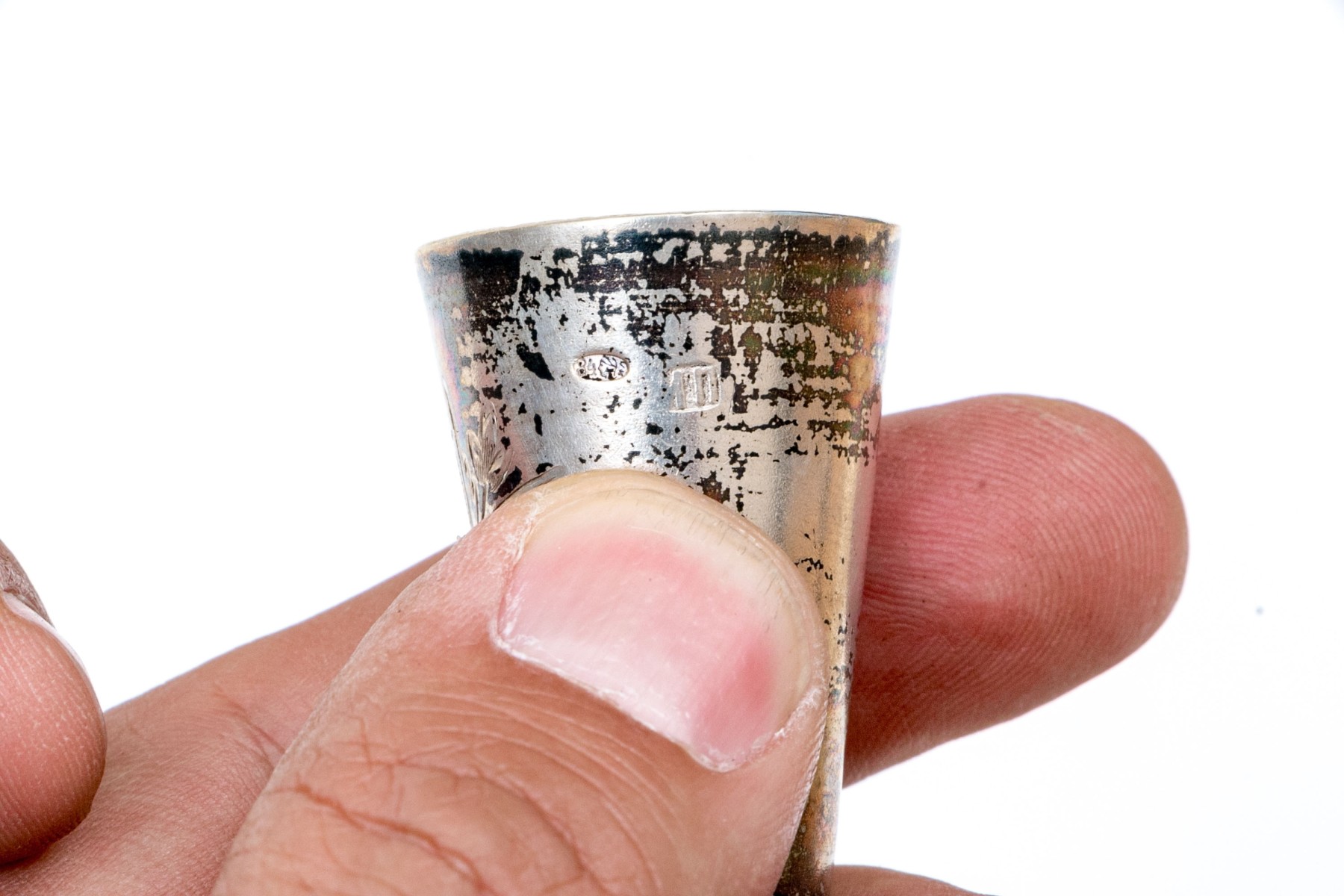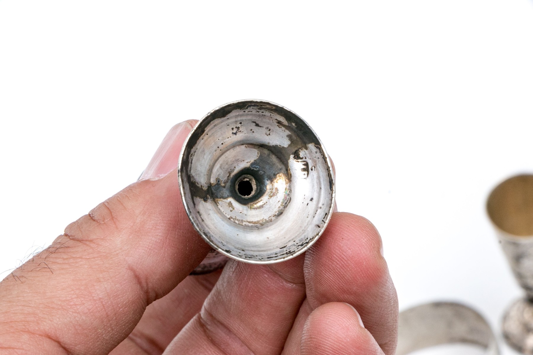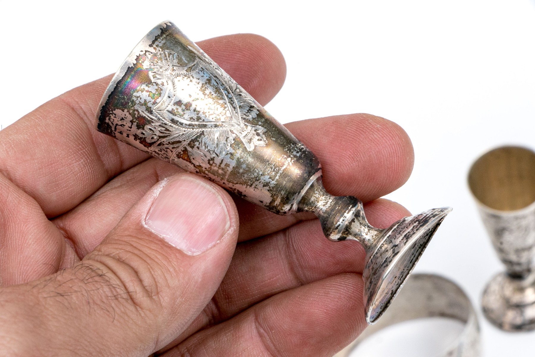 There are bends and wear to two of the cups that dont sit properly on their feet. Other slight bends and all are heavily tarnished and in need of polishing if to be used.