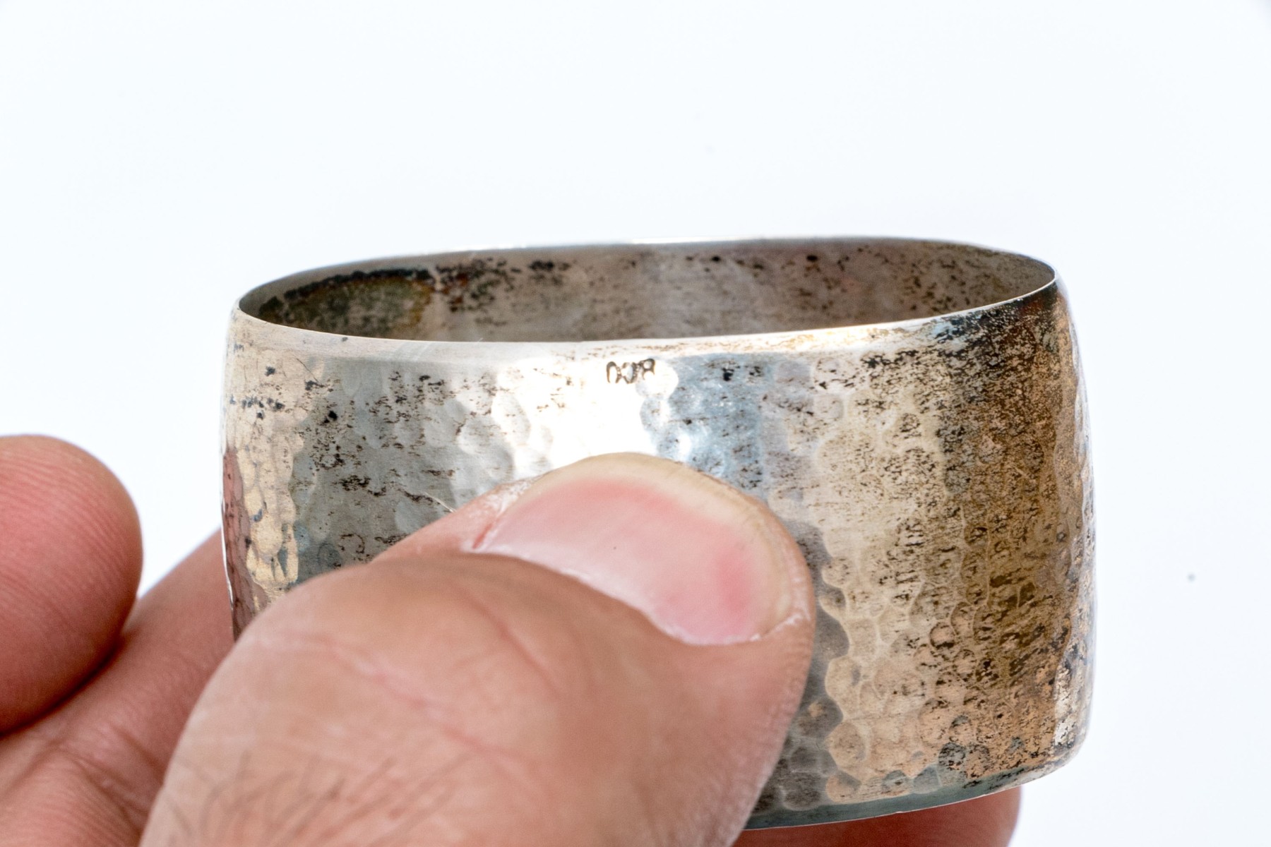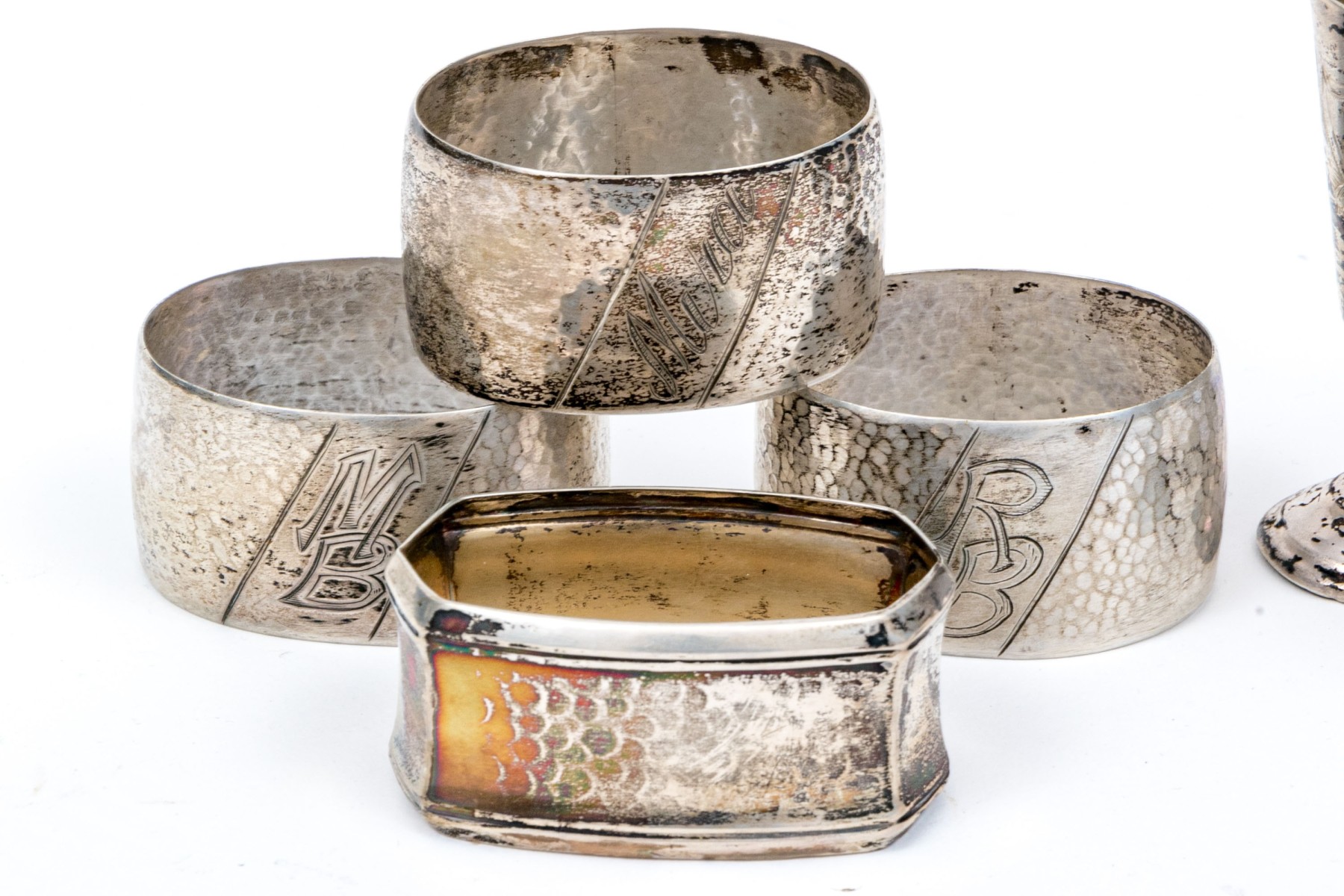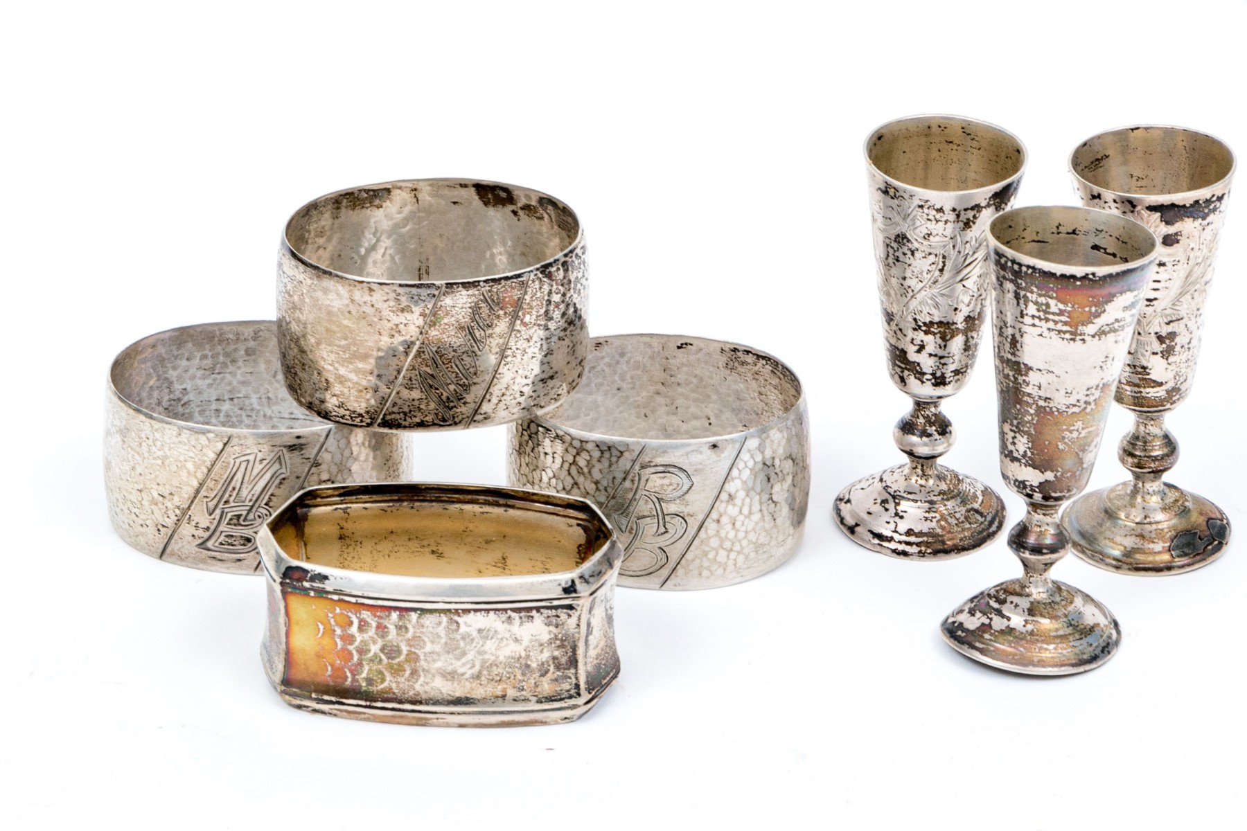 Comprised of three kiddish cups, along with four assorted napkin rings, including three with hand hammered finish along with a single of slightly different shape.