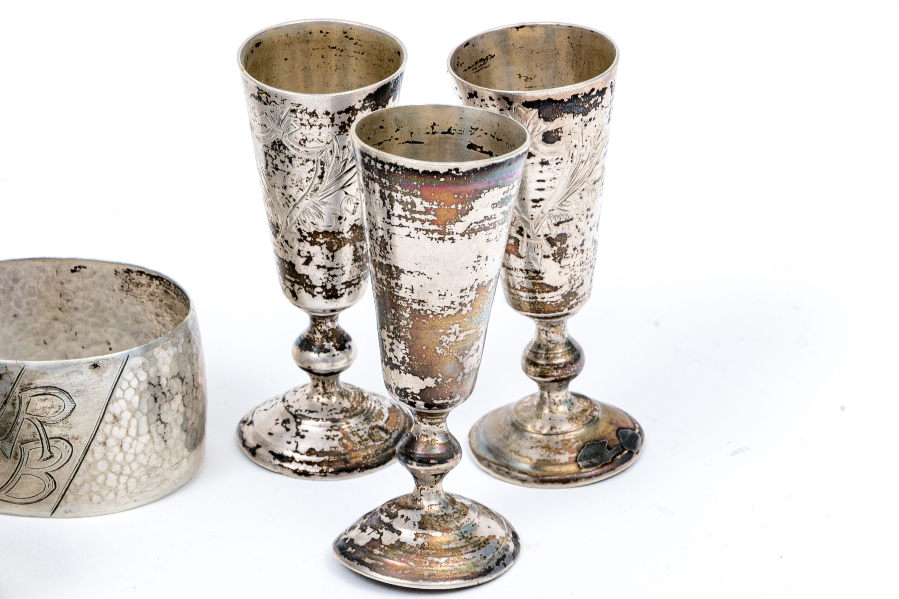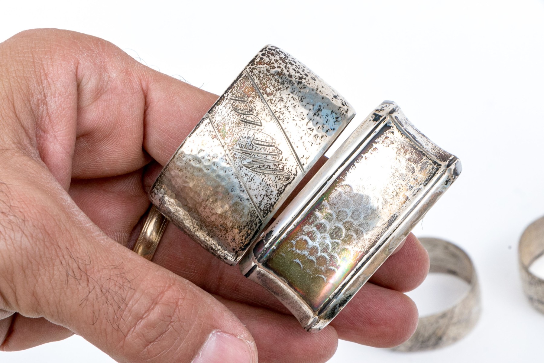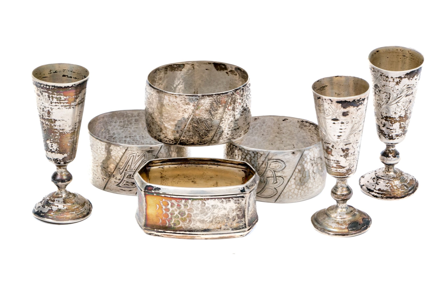 Comprised of three kiddish cups, along with four assorted napkin rings, including three with hand hammered finish along with a single of slightly different shape.