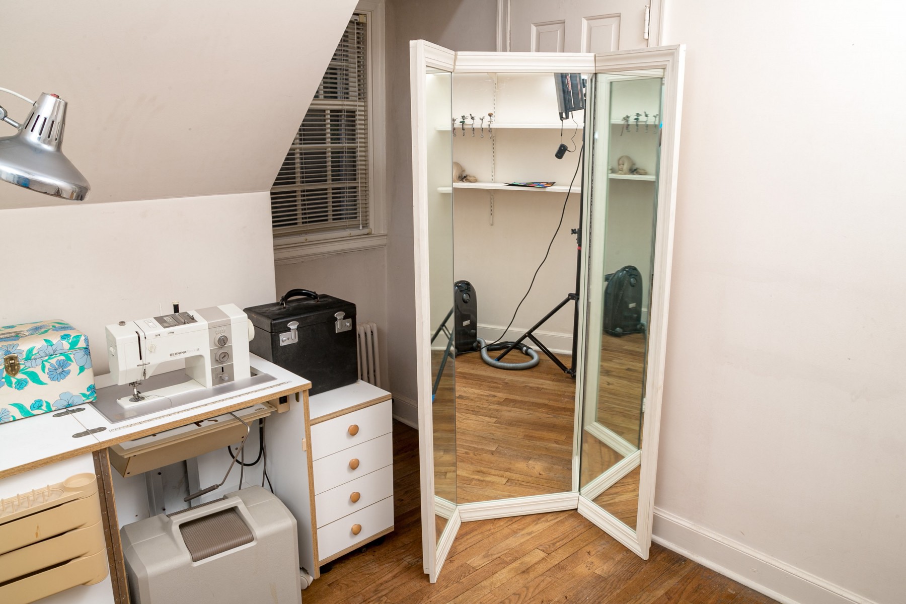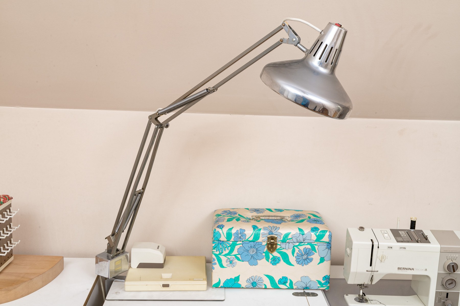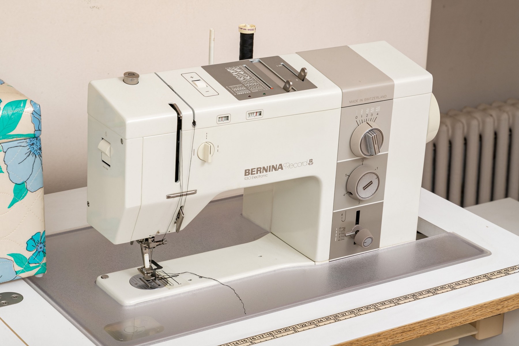 Including a Bernina 930 electronic sewing machine, a trifold dressing mirror, white laminate furnishings, and a Luxo adjustable chrome table lamp clamp.