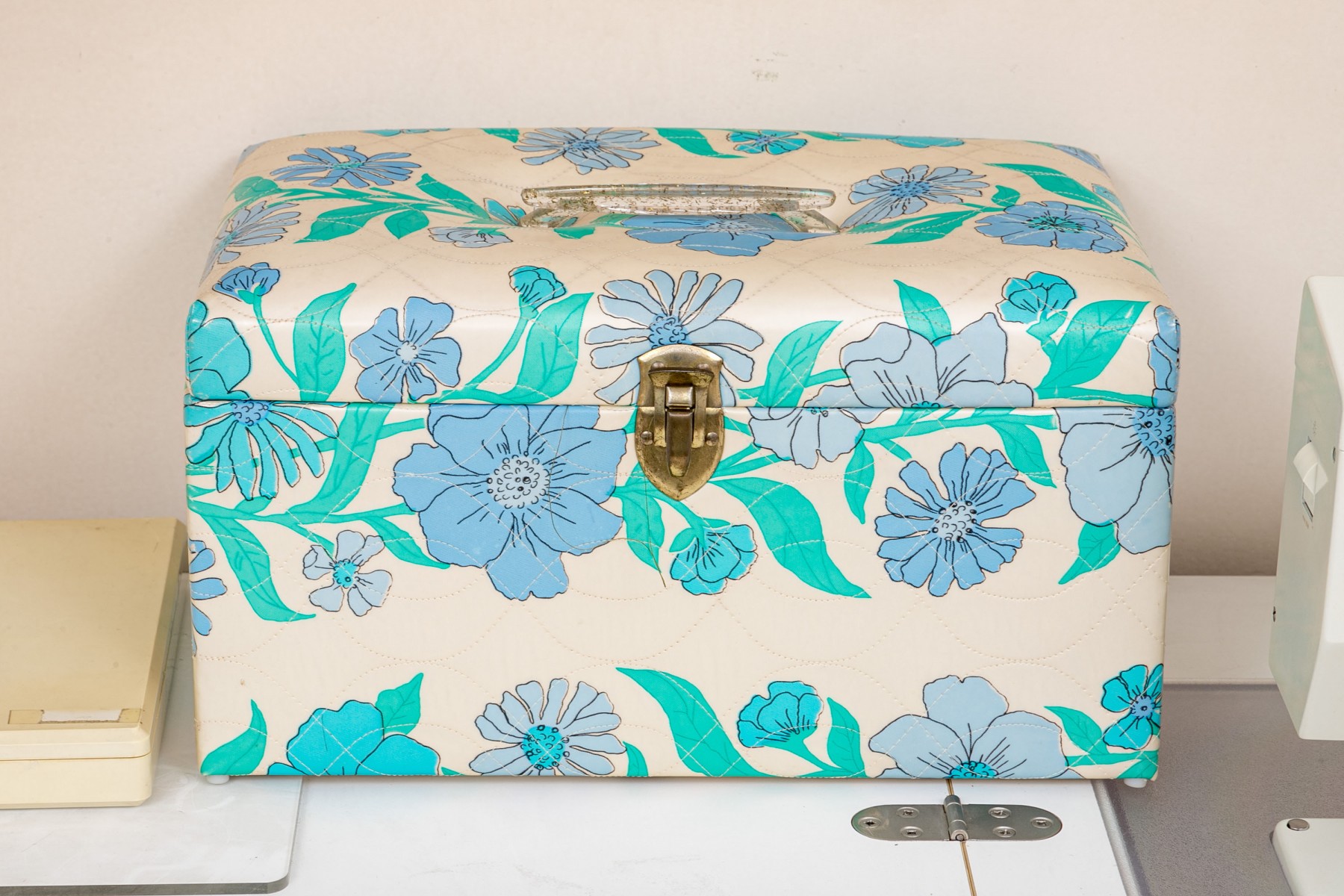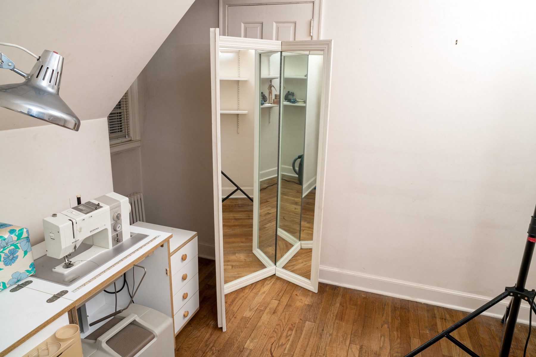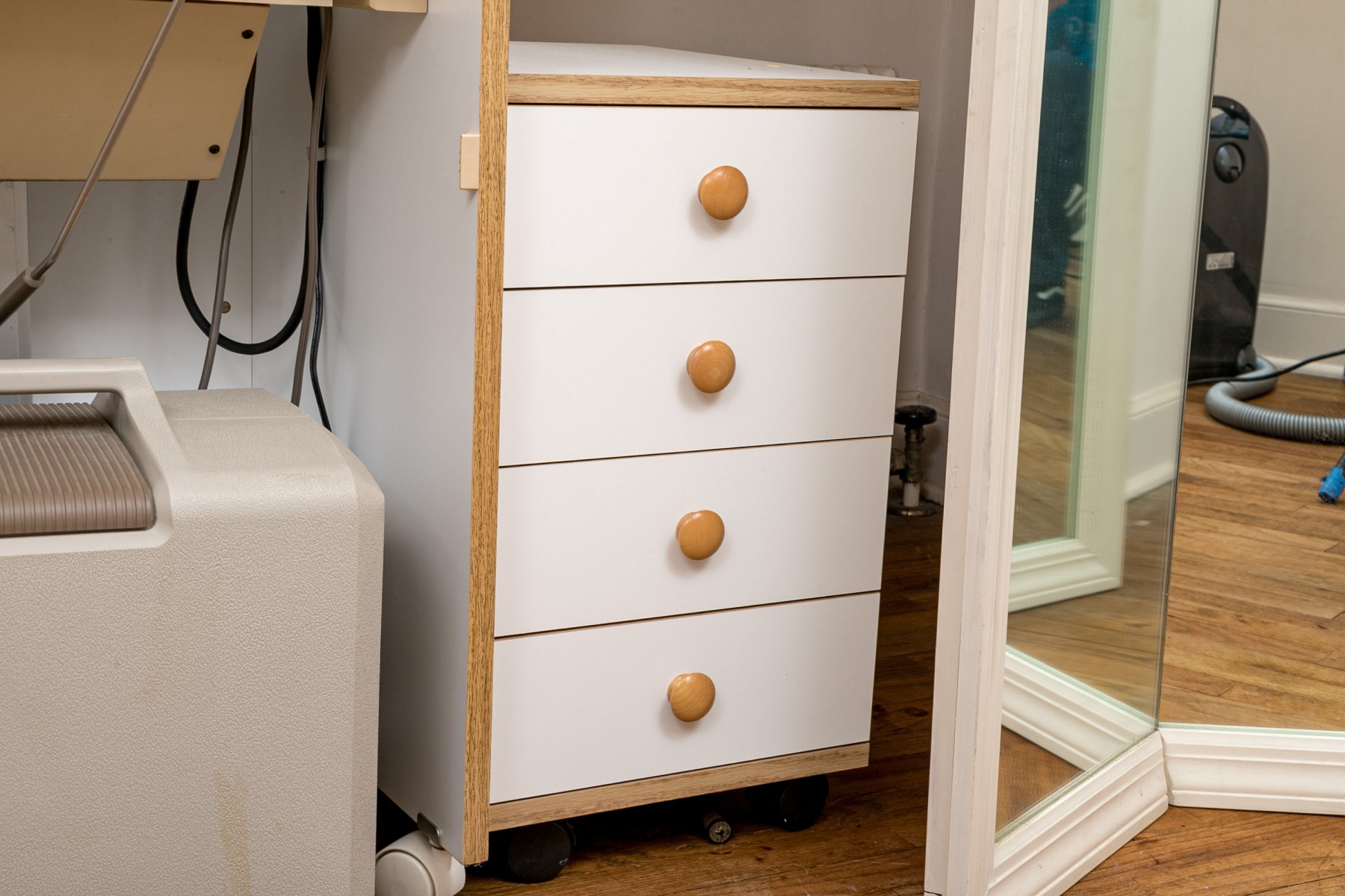 Including a Bernina 930 electronic sewing machine, a trifold dressing mirror, white laminate furnishings, and a Luxo adjustable chrome table lamp clamp.