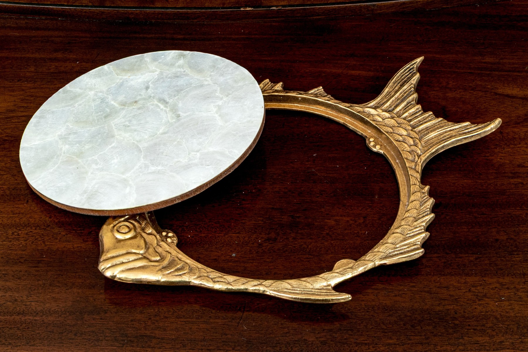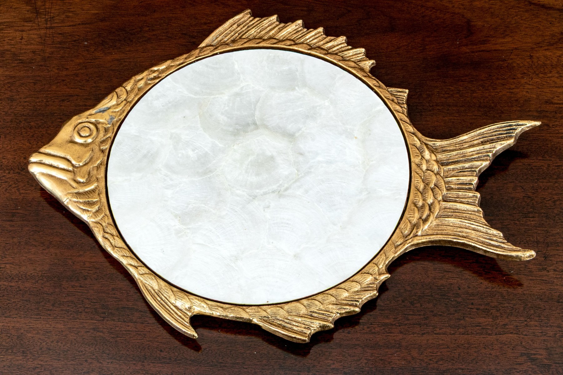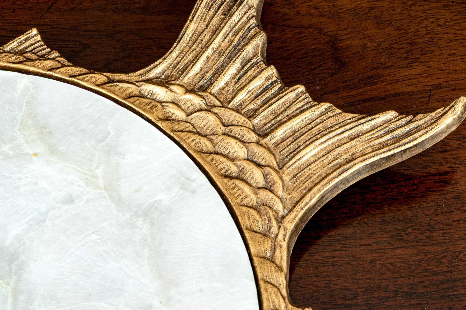 A delightful Shell Craft serving plate in the form of a brass fish with a capiz shell center. The removable circular center plate sports beautiful white capiz shell overlaid with eye-catching texture, set within a naturalistic fish with short fins swimming in profile.