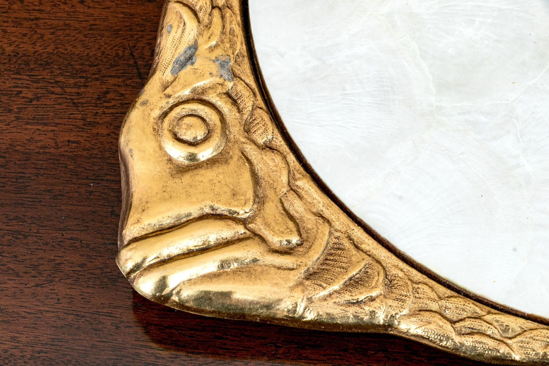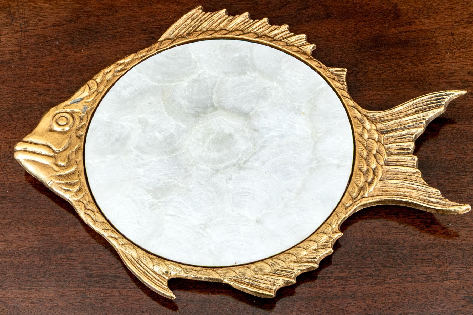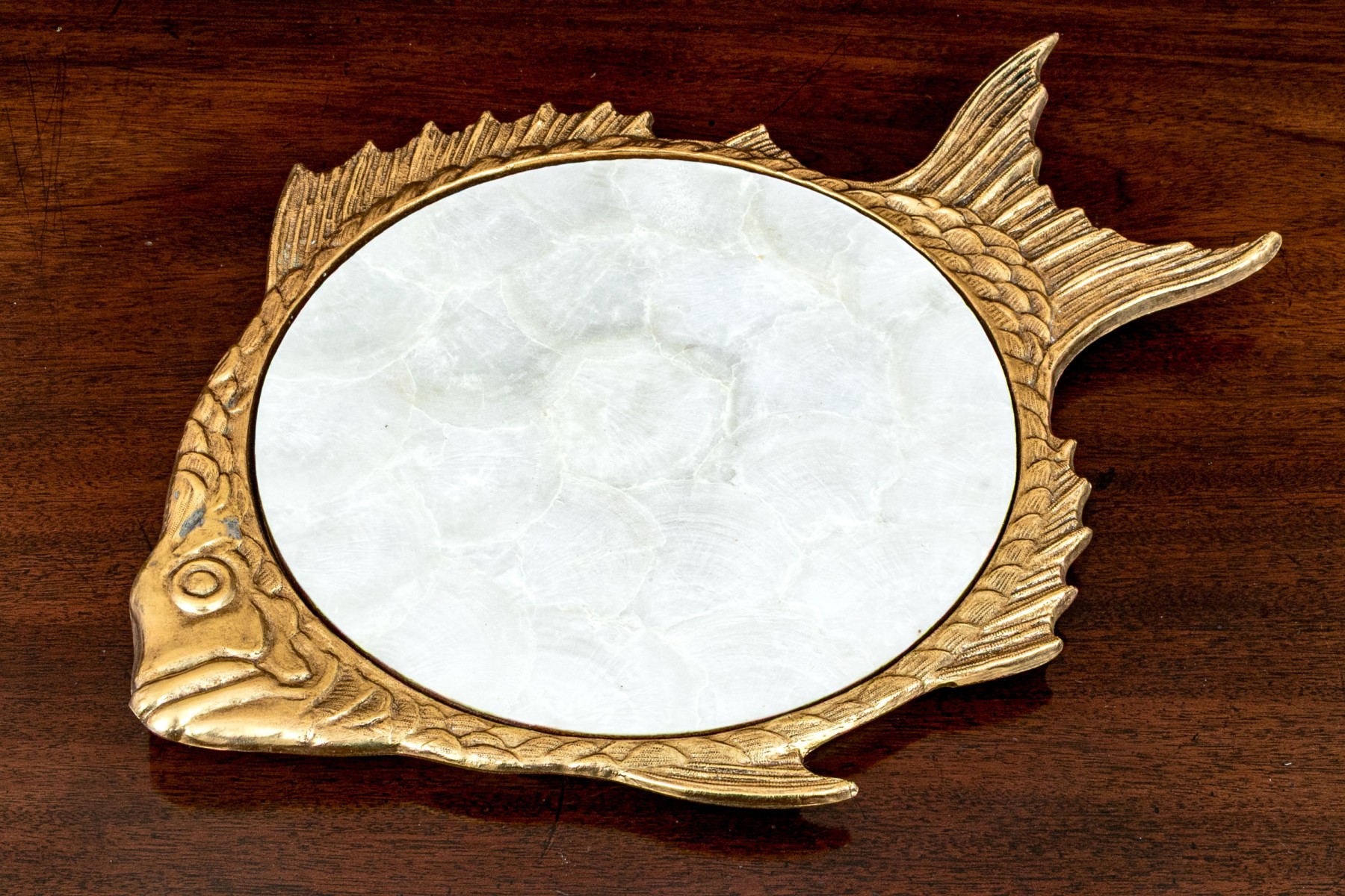 A delightful Shell Craft serving plate in the form of a brass fish with a capiz shell center. The removable circular center plate sports beautiful white capiz shell overlaid with eye-catching texture, set within a naturalistic fish with short fins swimming in profile.