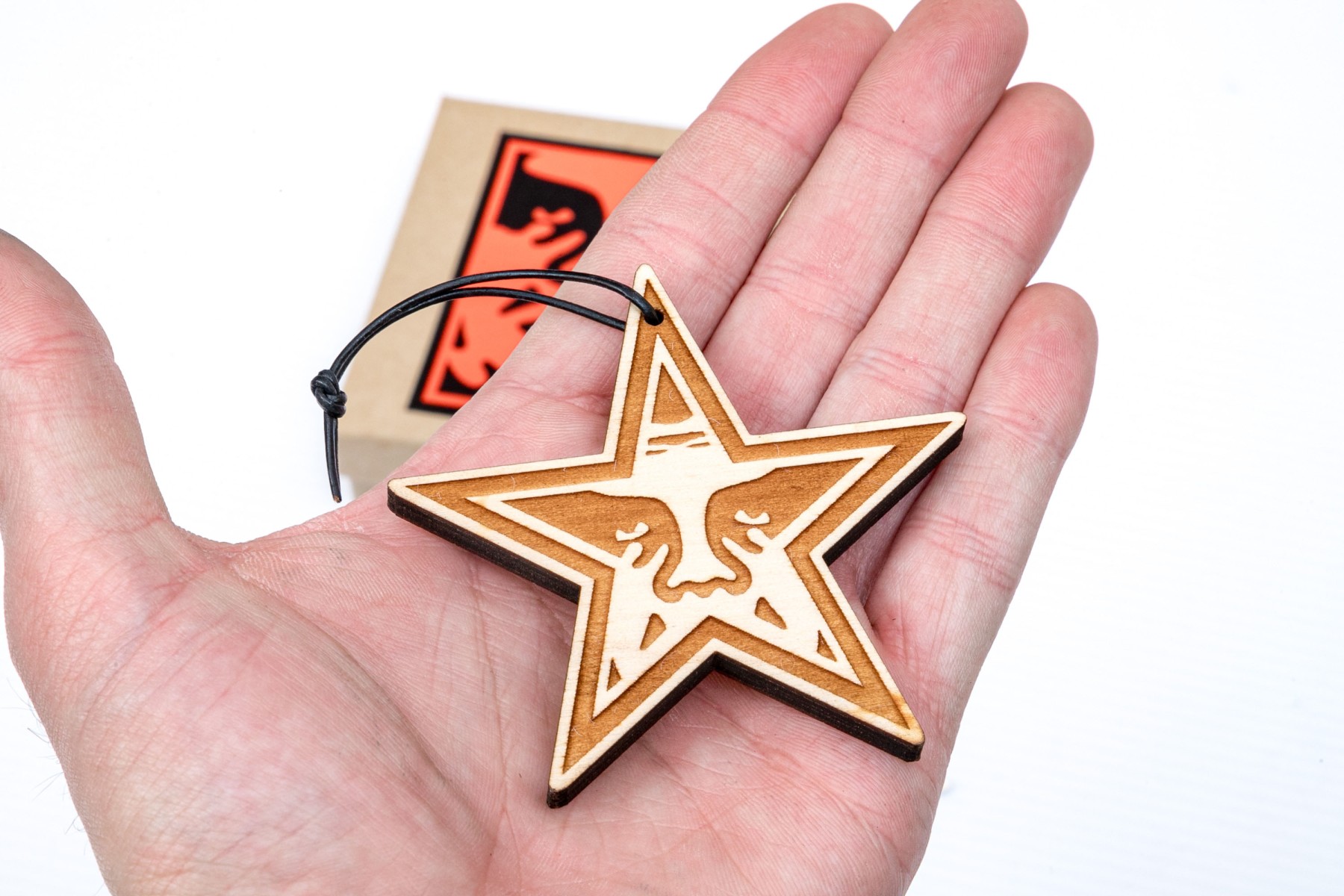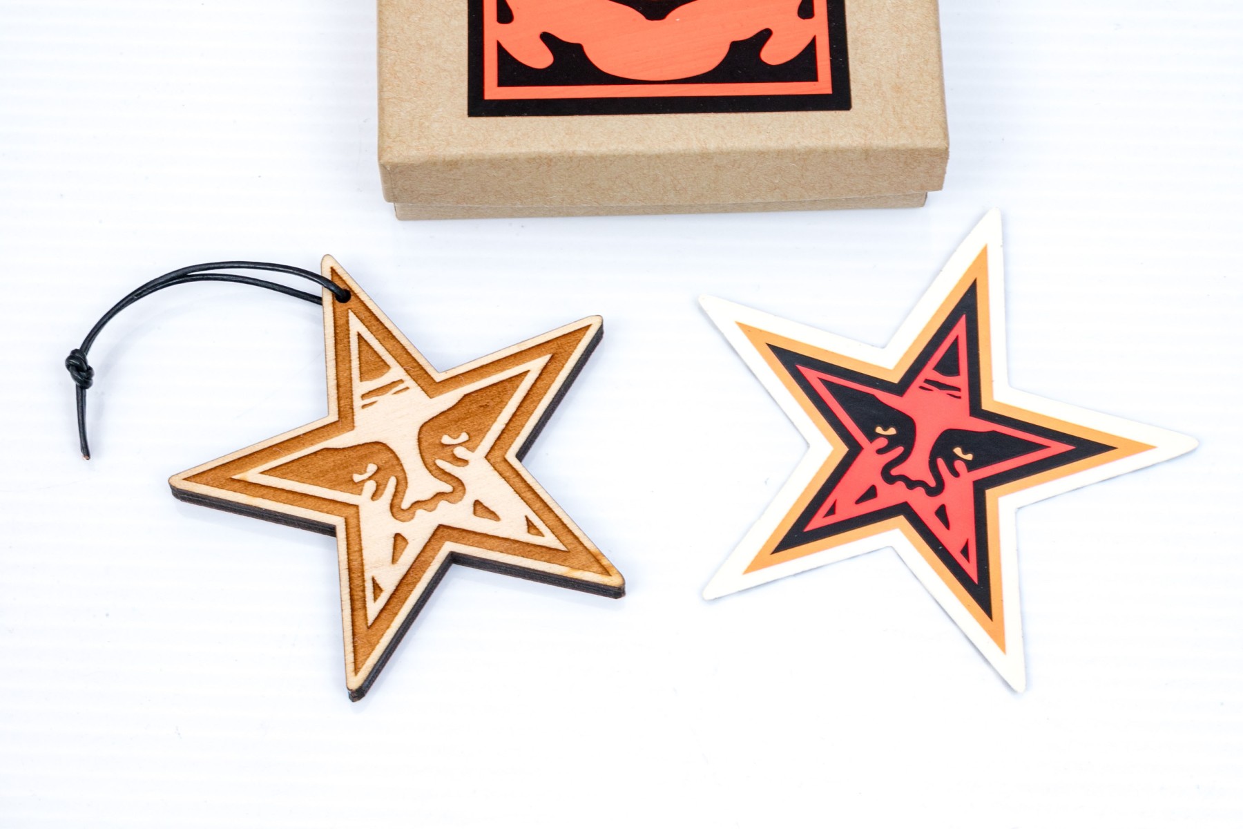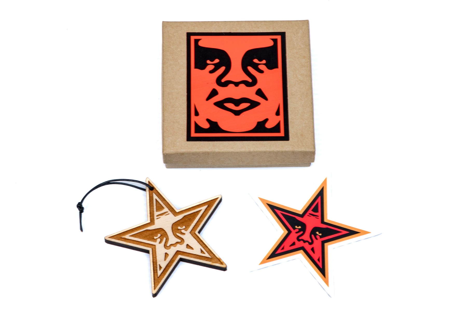 Obey box with holiday star ornament and a sticker.