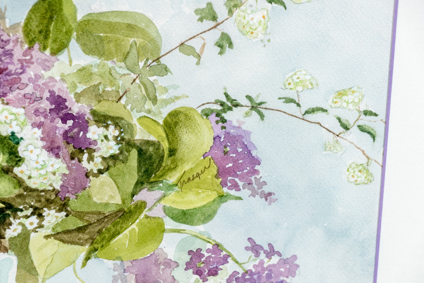 Shirley Traeger (American [OH], 1924-2012) "Lilacs And Spirea" watercolor painting on paper depicting a still life with gorgeous purple and yellow flowers with rich yellow-green foliage in a planter set atop a white fluted column against a pale blue ground. Affixed with a label to the verso.