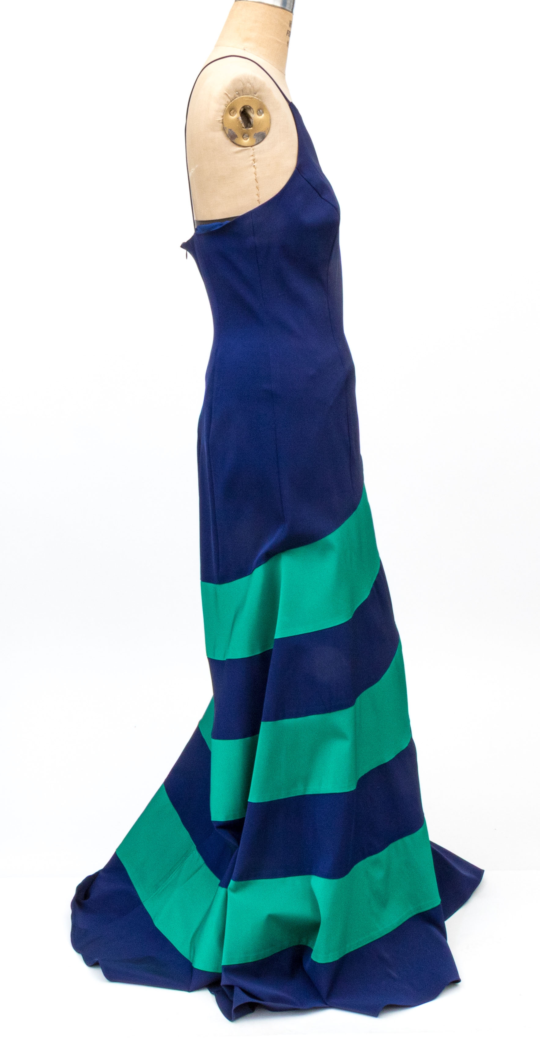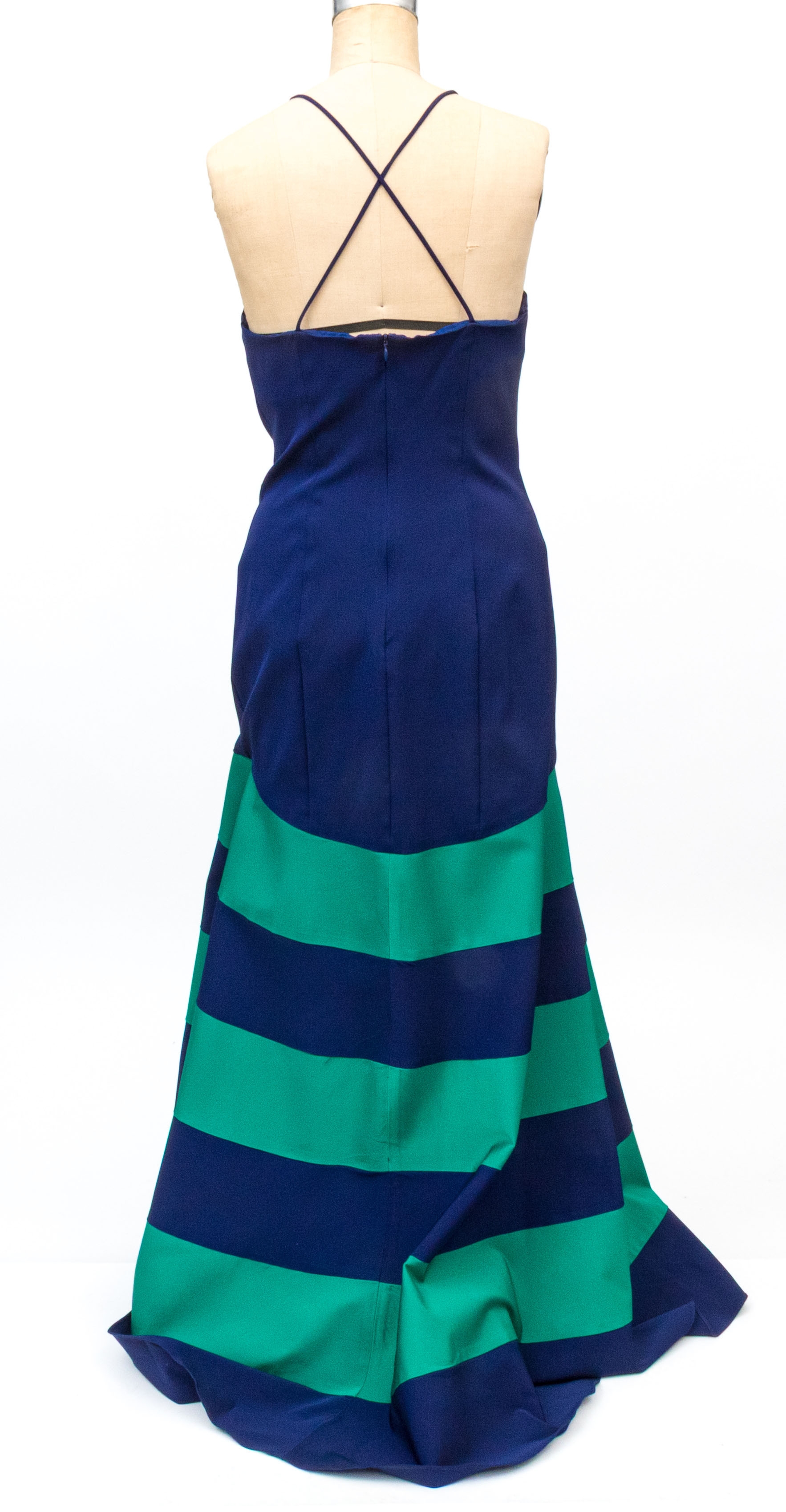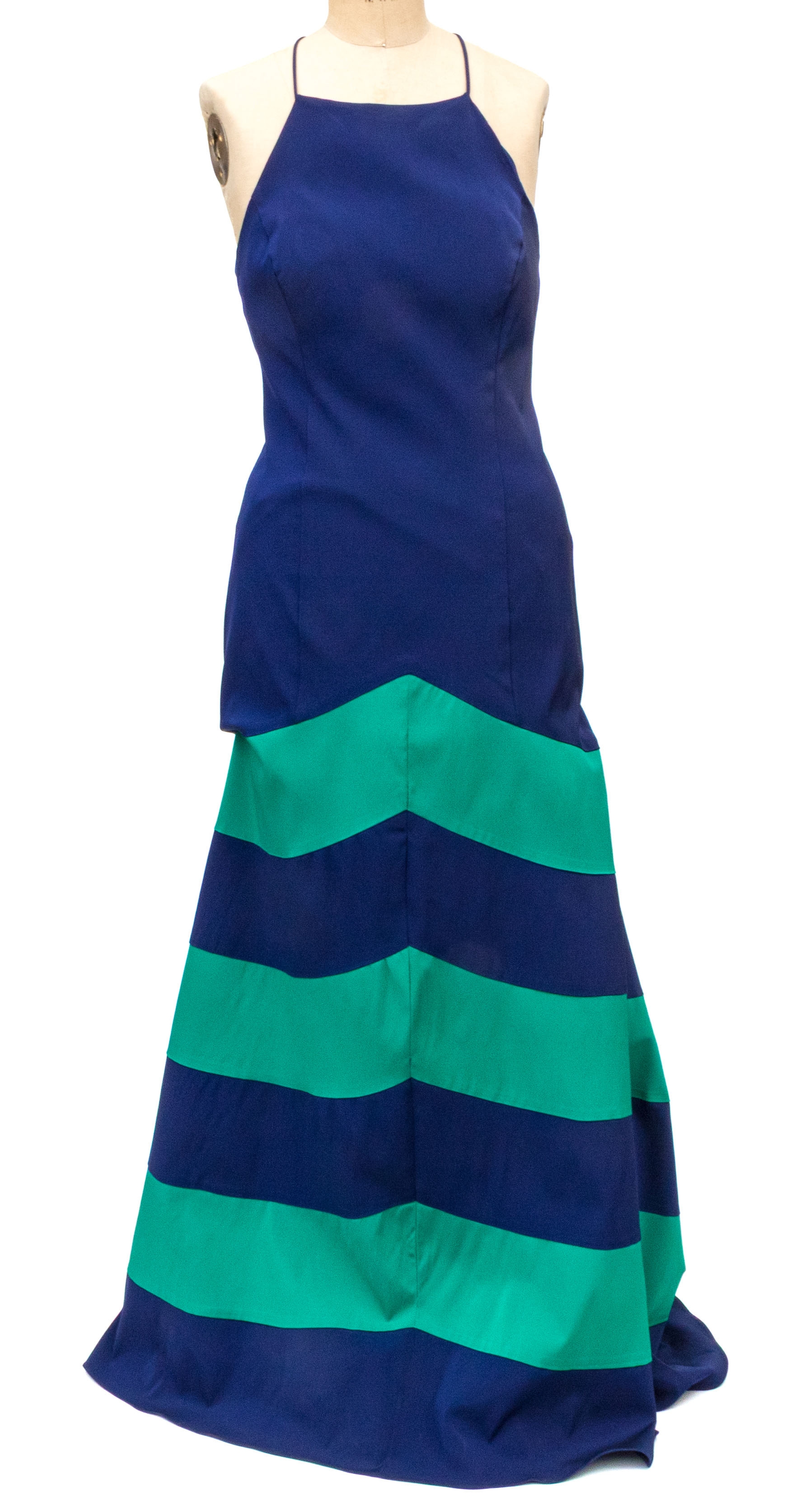 Gorgeous statement dress with halter top having spaghetti straps that criss-cross in the back. The bodice is fitted leading to an A-line fuller floor length skirt with bold color-blocking design.