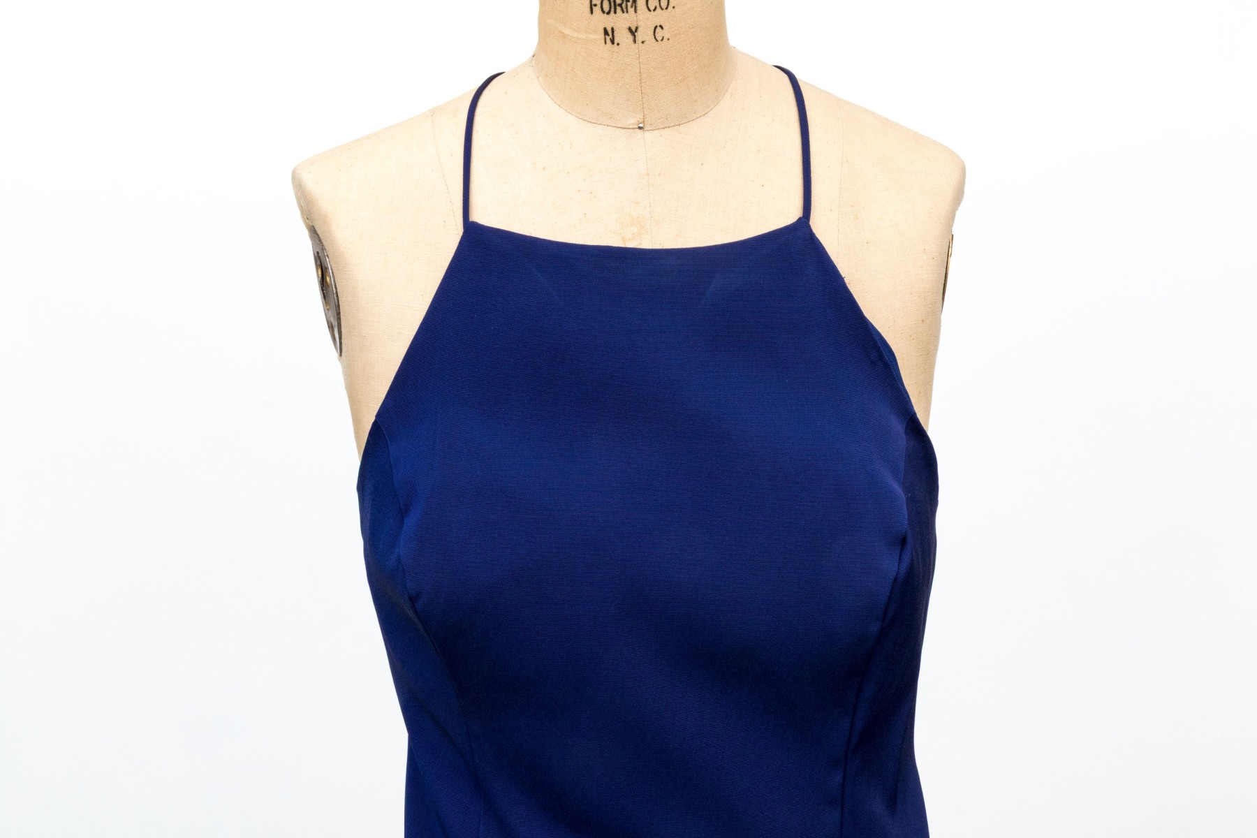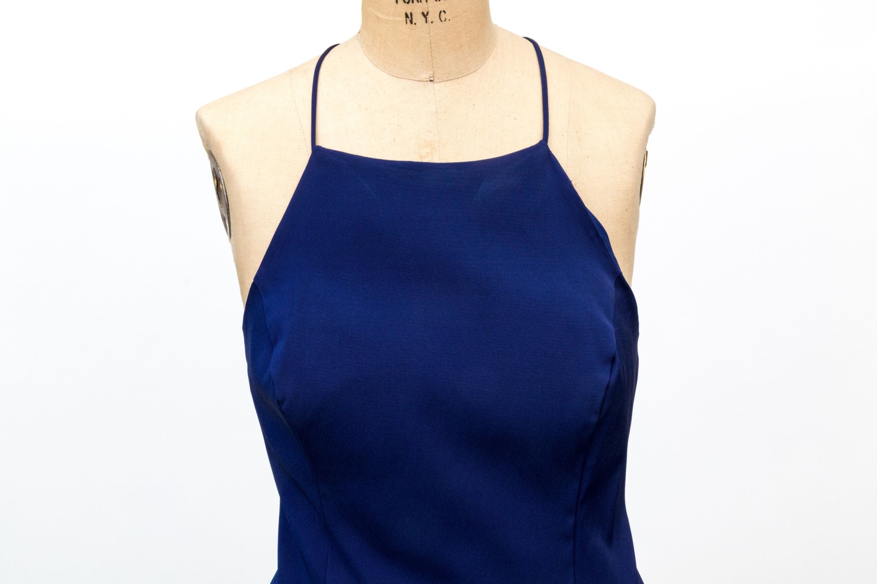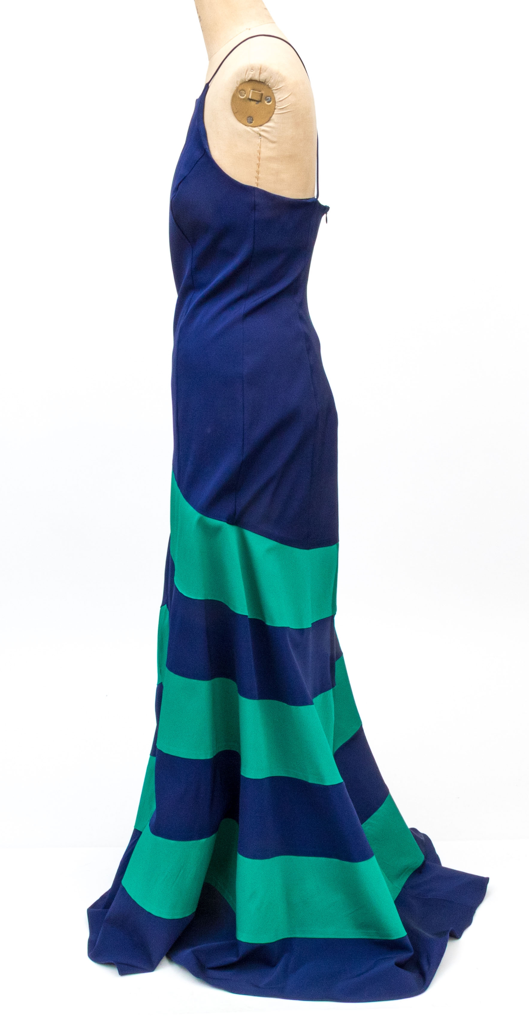 Gorgeous statement dress with halter top having spaghetti straps that criss-cross in the back. The bodice is fitted leading to an A-line fuller floor length skirt with bold color-blocking design.
