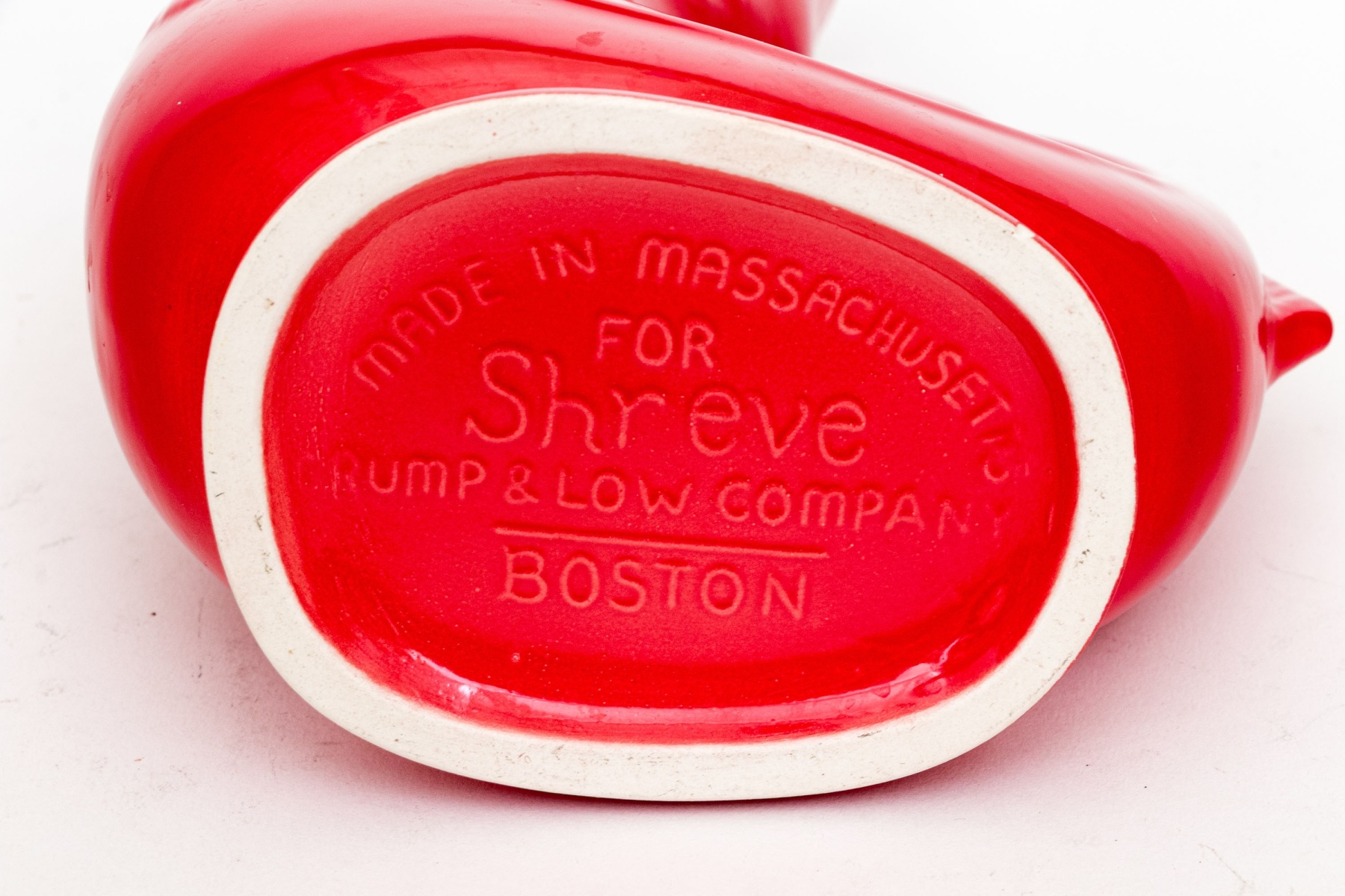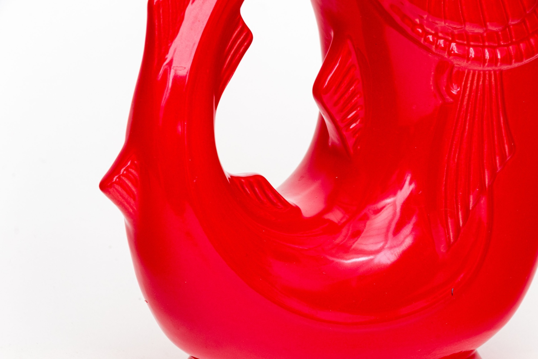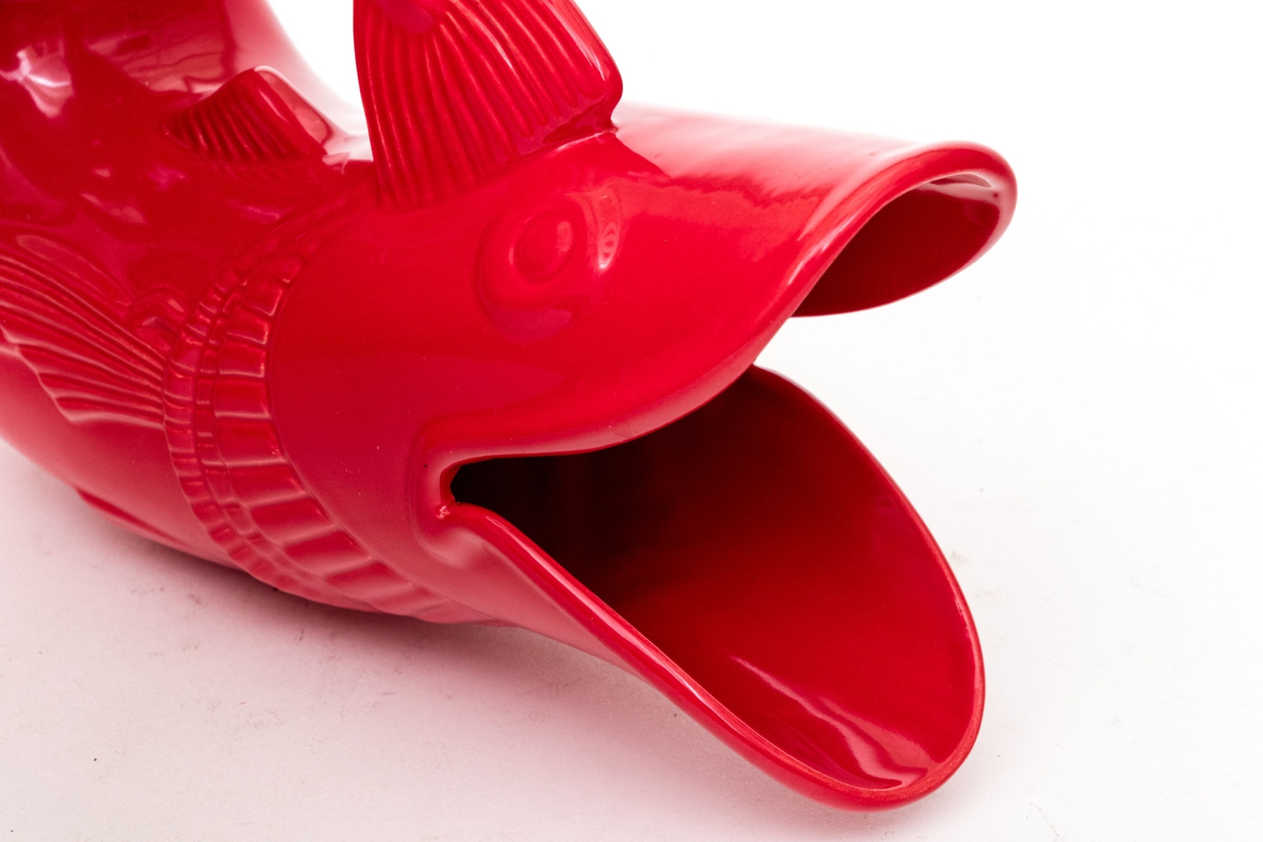 A fun Shreve, Crump & Low water pitcher in the form of a grotesque fish glazed vibrant red and nicely detailed with a wide gaping mouth, ribbed fins, and dramatically curving tail forming a handle. Marked underfoot.