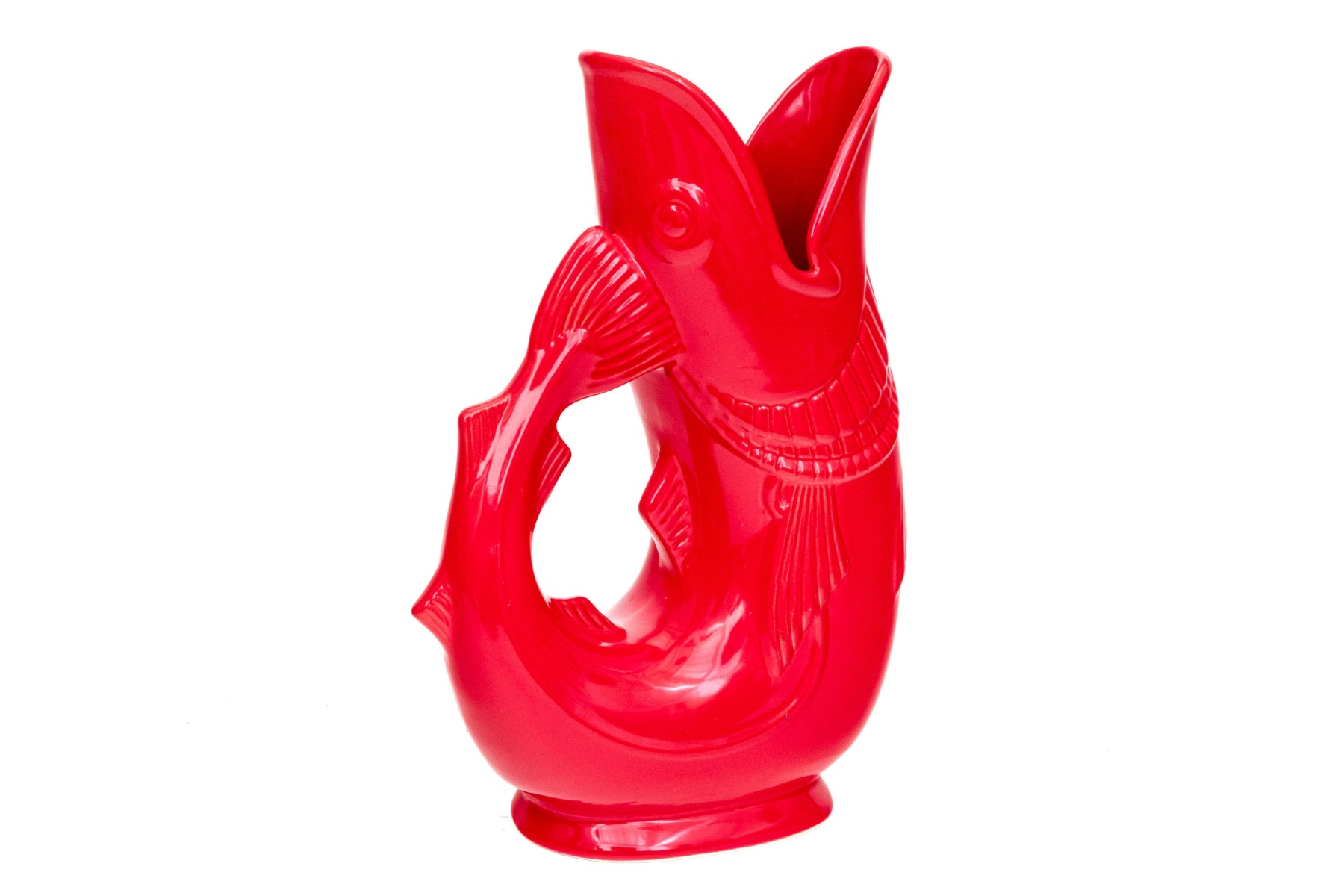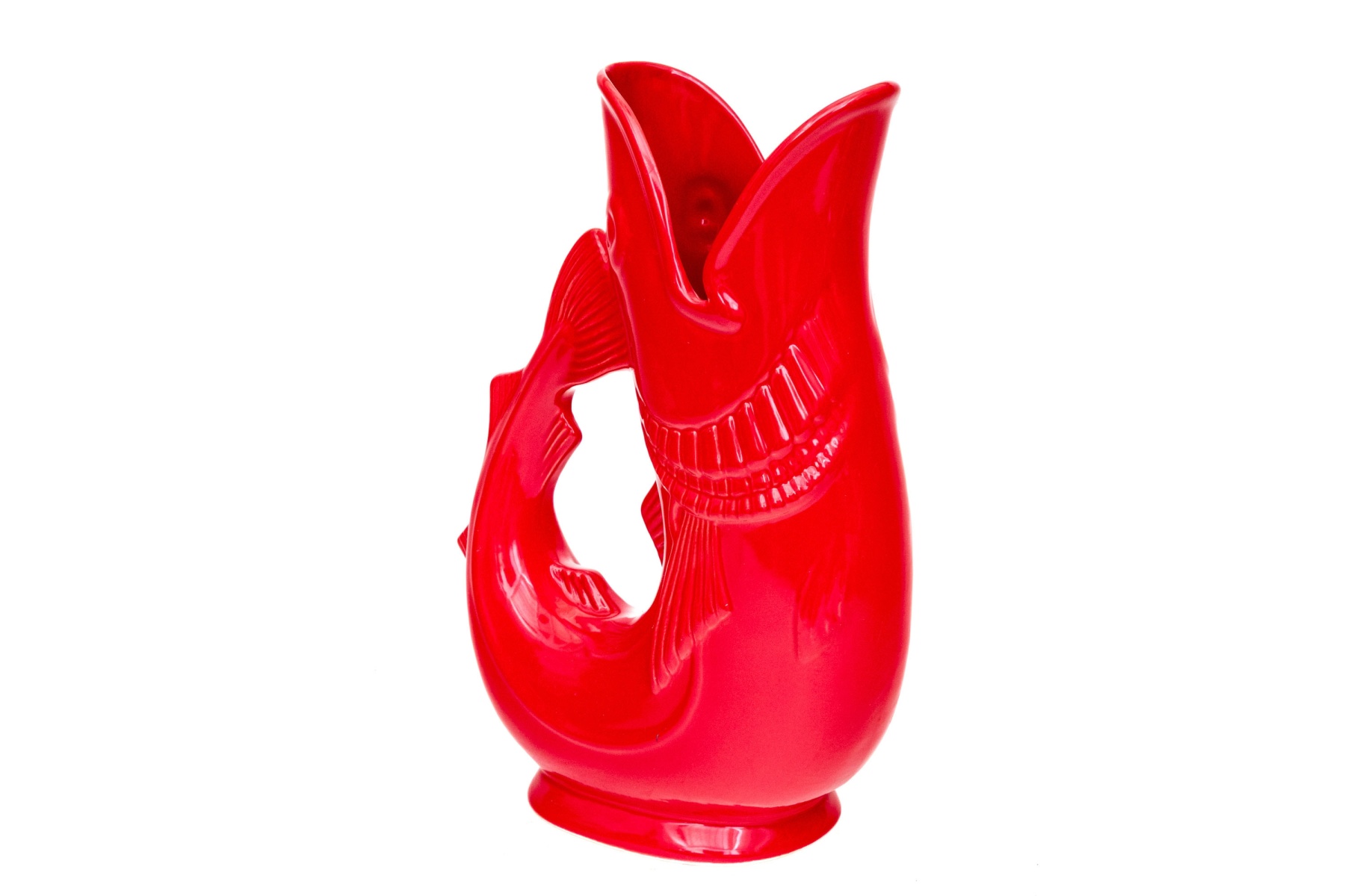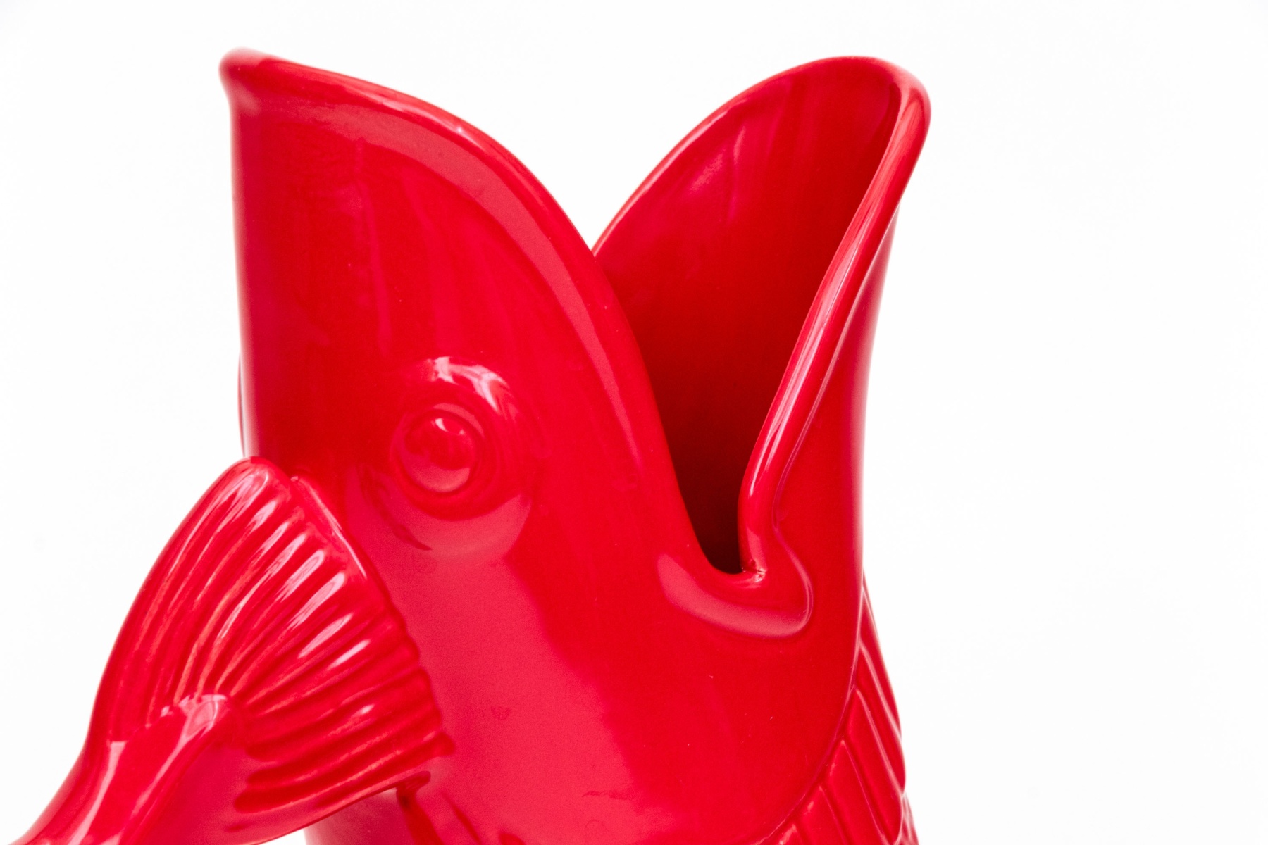 A fun Shreve, Crump & Low water pitcher in the form of a grotesque fish glazed vibrant red and nicely detailed with a wide gaping mouth, ribbed fins, and dramatically curving tail forming a handle. Marked underfoot.