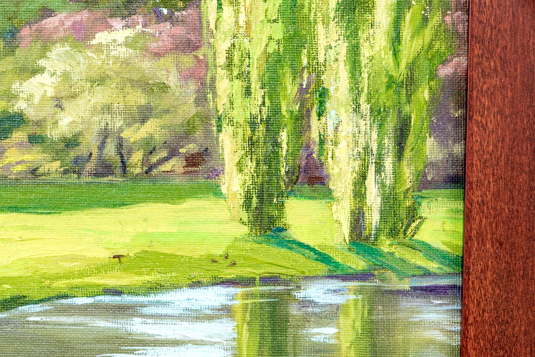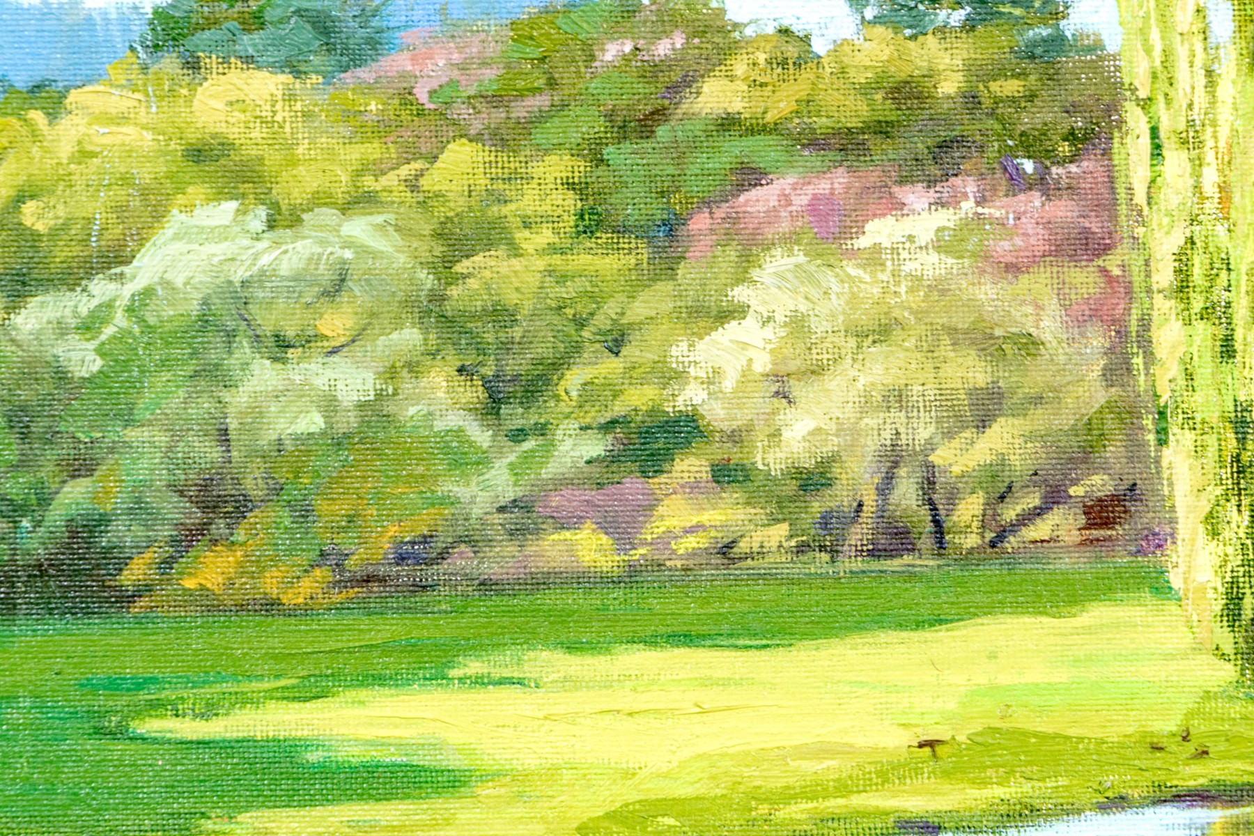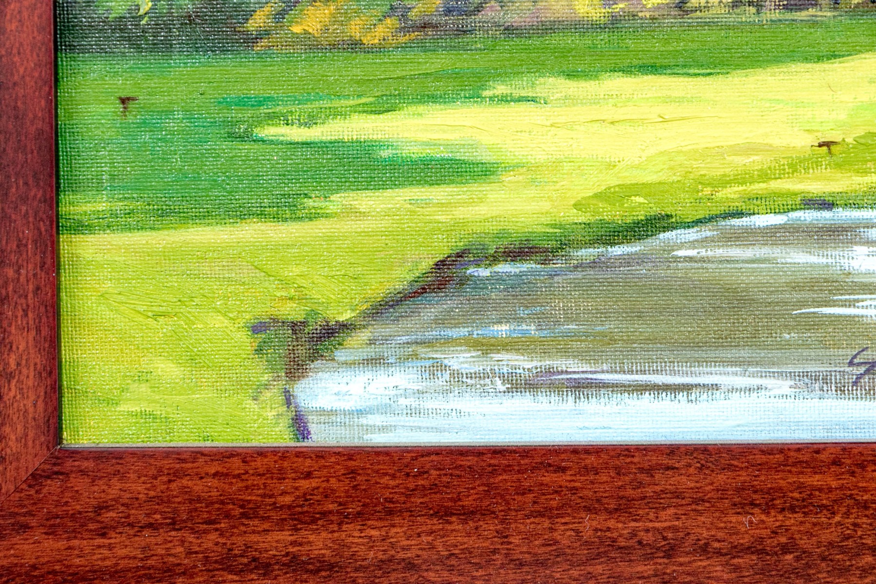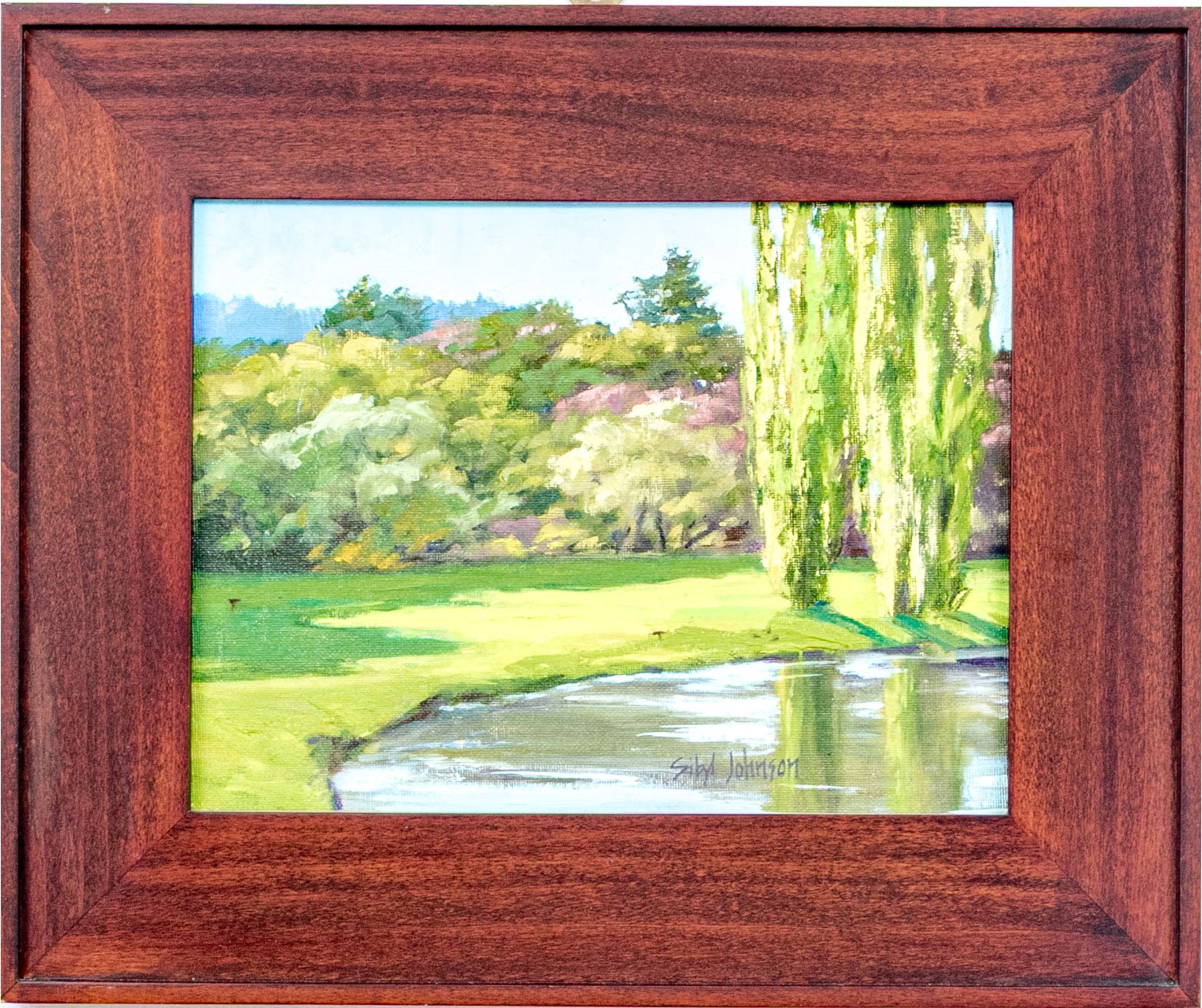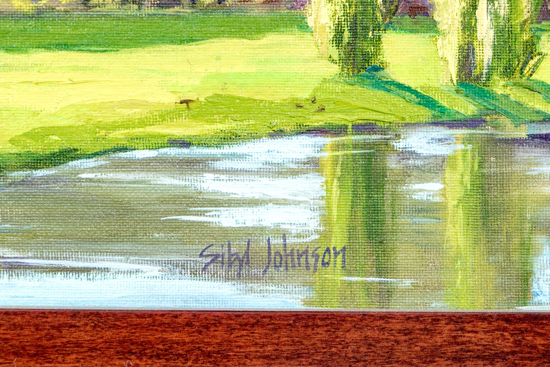 Sibyl Sides Johnson (American [CA], B. 1940) "Eighteen At Quail" oil painting on canvas panel depicting a vibrant green golf course with pale, calm water beside tall trees leading to a grassy hill beneath a clear blue sky. Signed lower center-right and affixed with leaflets on the verso.