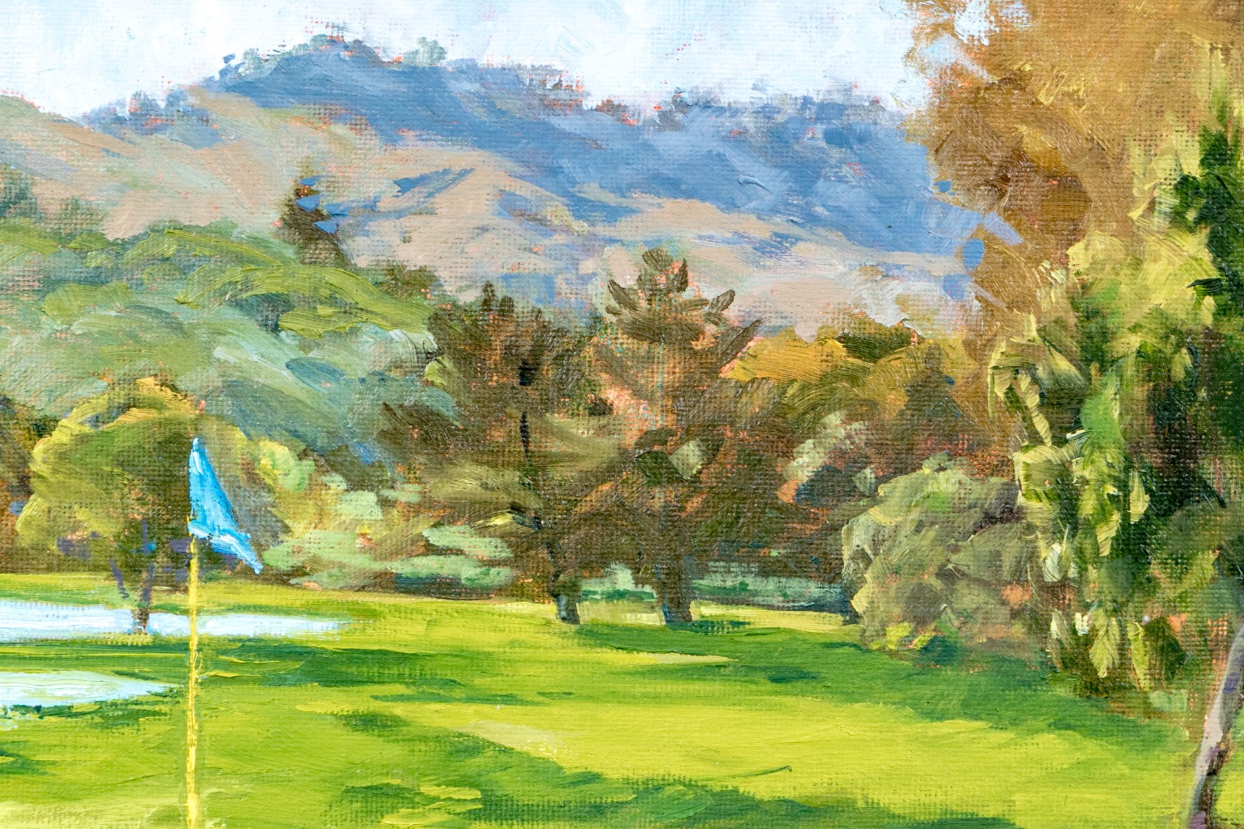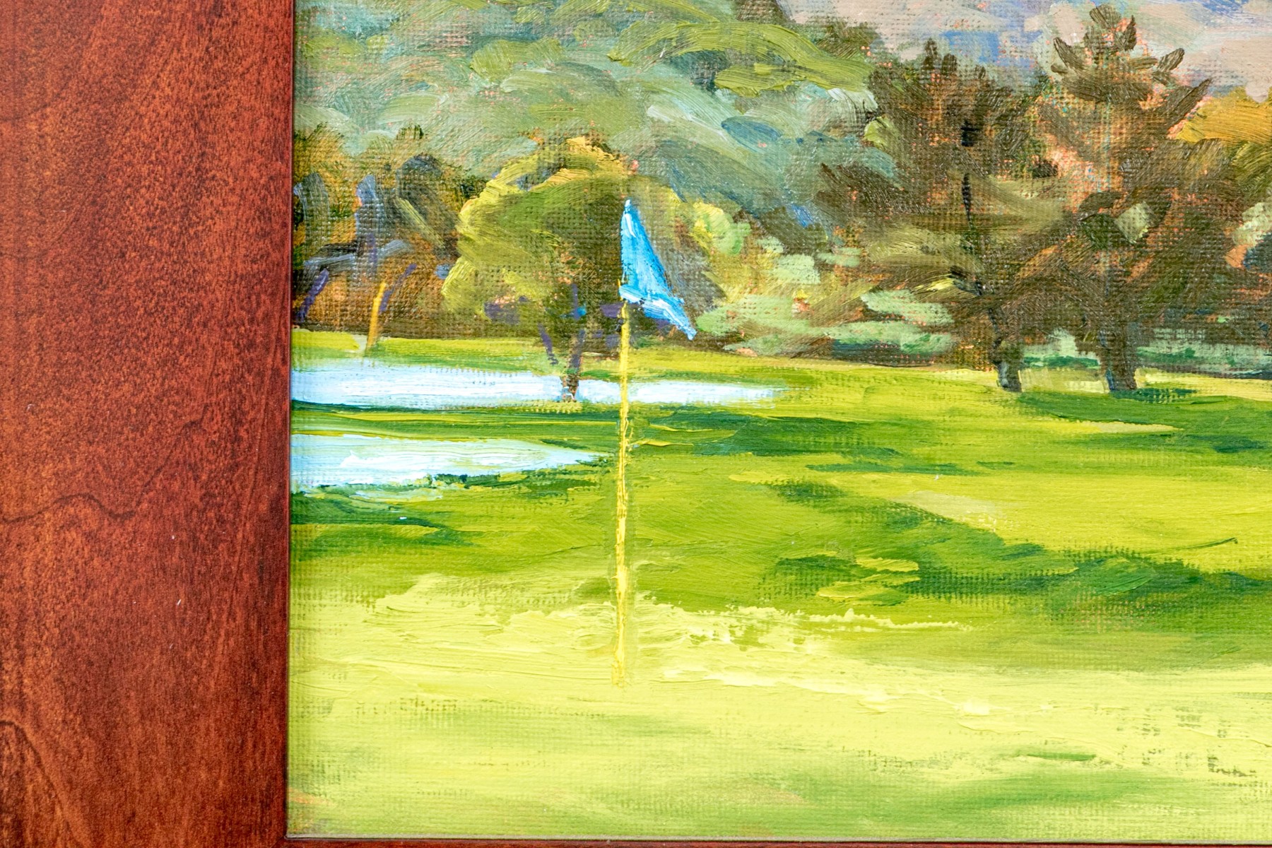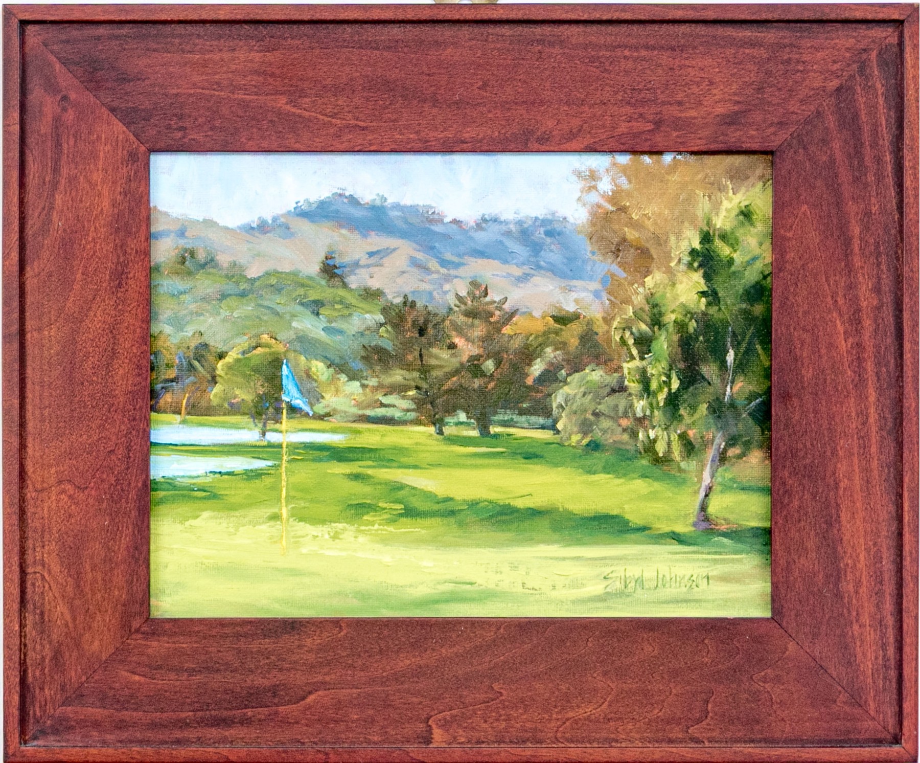 Sibyl Sides Johnson (American [CA], b. 1940) "Fourteen At Quail" oil painting on canvas panel depicting a vibrant green golf course with a blue pin next to water leading to forested hills in the background. Signed lower right and affixed with leaflets on the verso.
