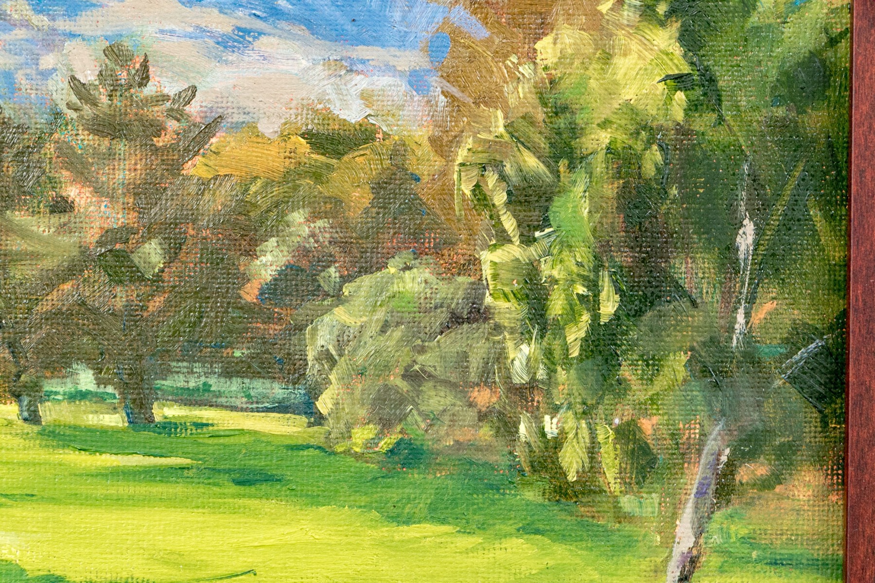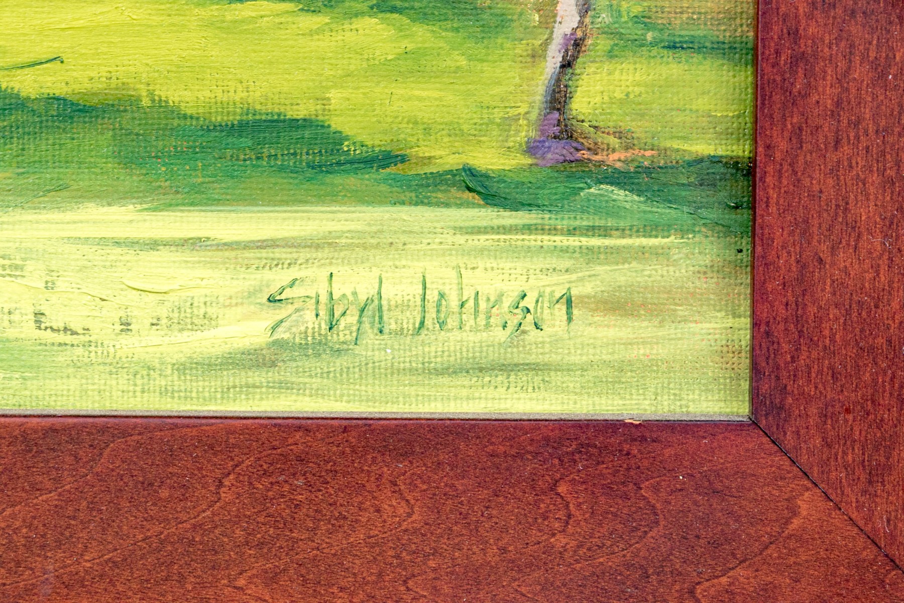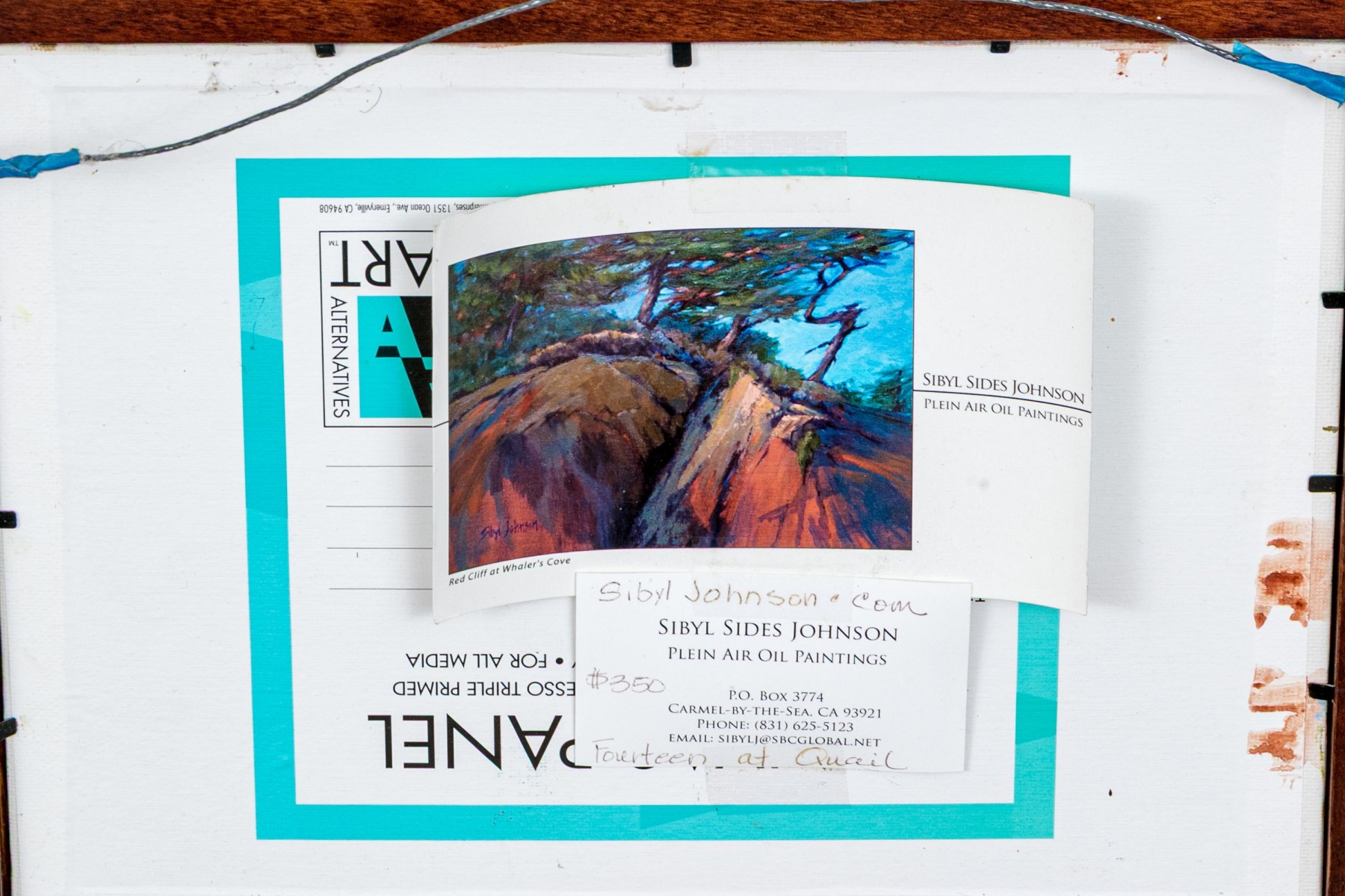 Sibyl Sides Johnson (American [CA], b. 1940) "Fourteen At Quail" oil painting on canvas panel depicting a vibrant green golf course with a blue pin next to water leading to forested hills in the background. Signed lower right and affixed with leaflets on the verso.