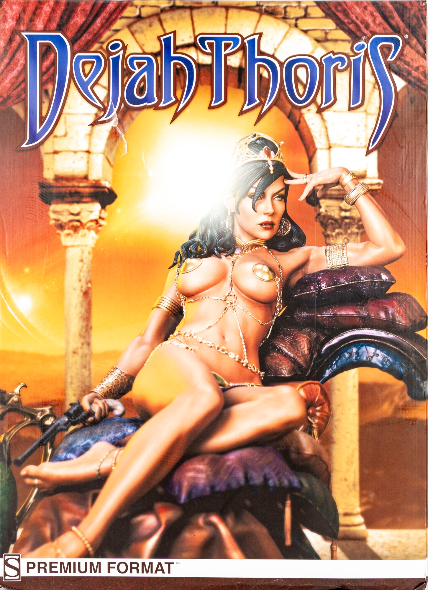 An impressive Dejah Thoris Premium Format figure by Sideshow Collectibles, inspired by Edgar Rice Burroughs’ classic Barsoom (John Carter of Mars) series. This limited-edition polystone sculpture captures the Princess of Mars in a sensuous reclining pose, adorned with jeweled chains and golden accents, rendered in exquisite detail and vibrant color. edition number: 0399/2000