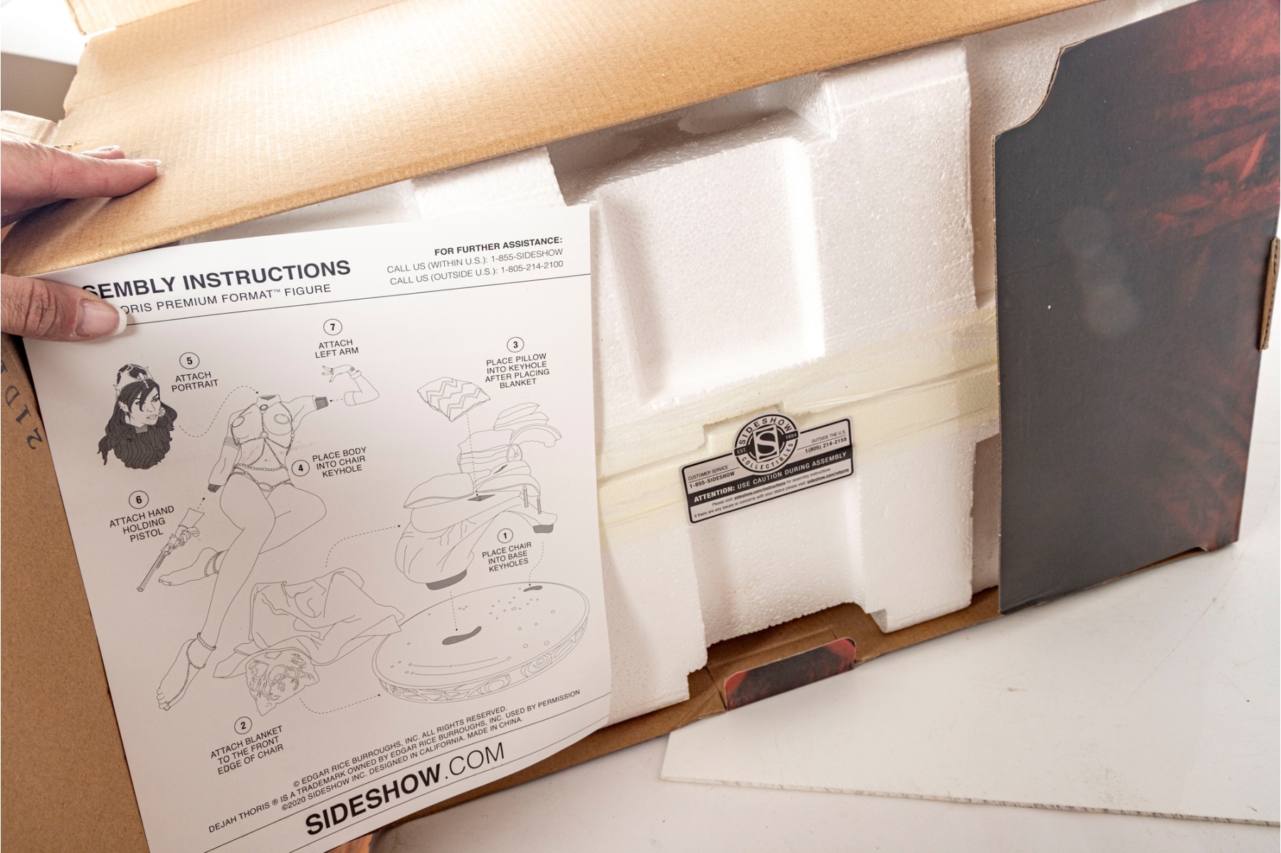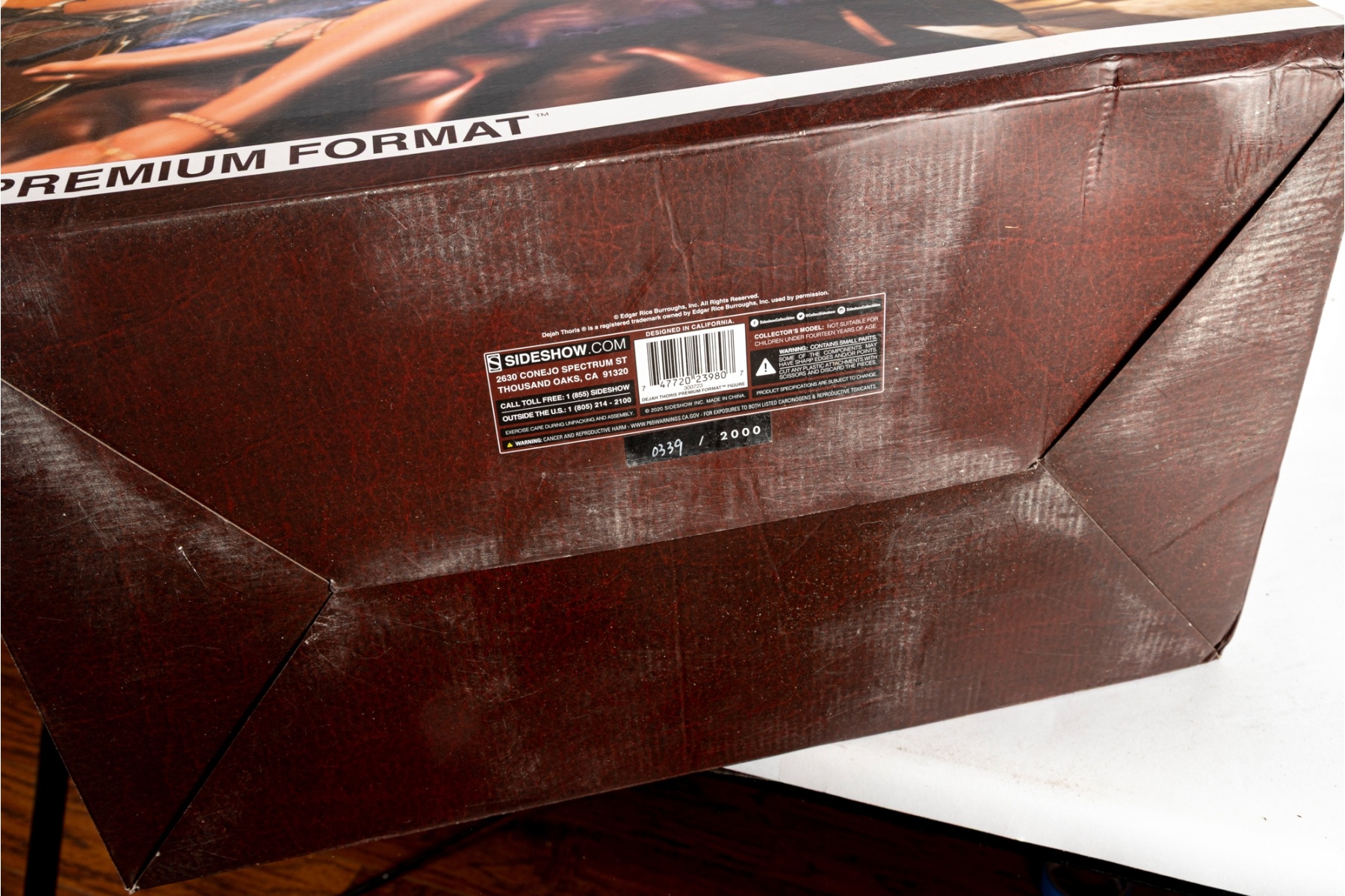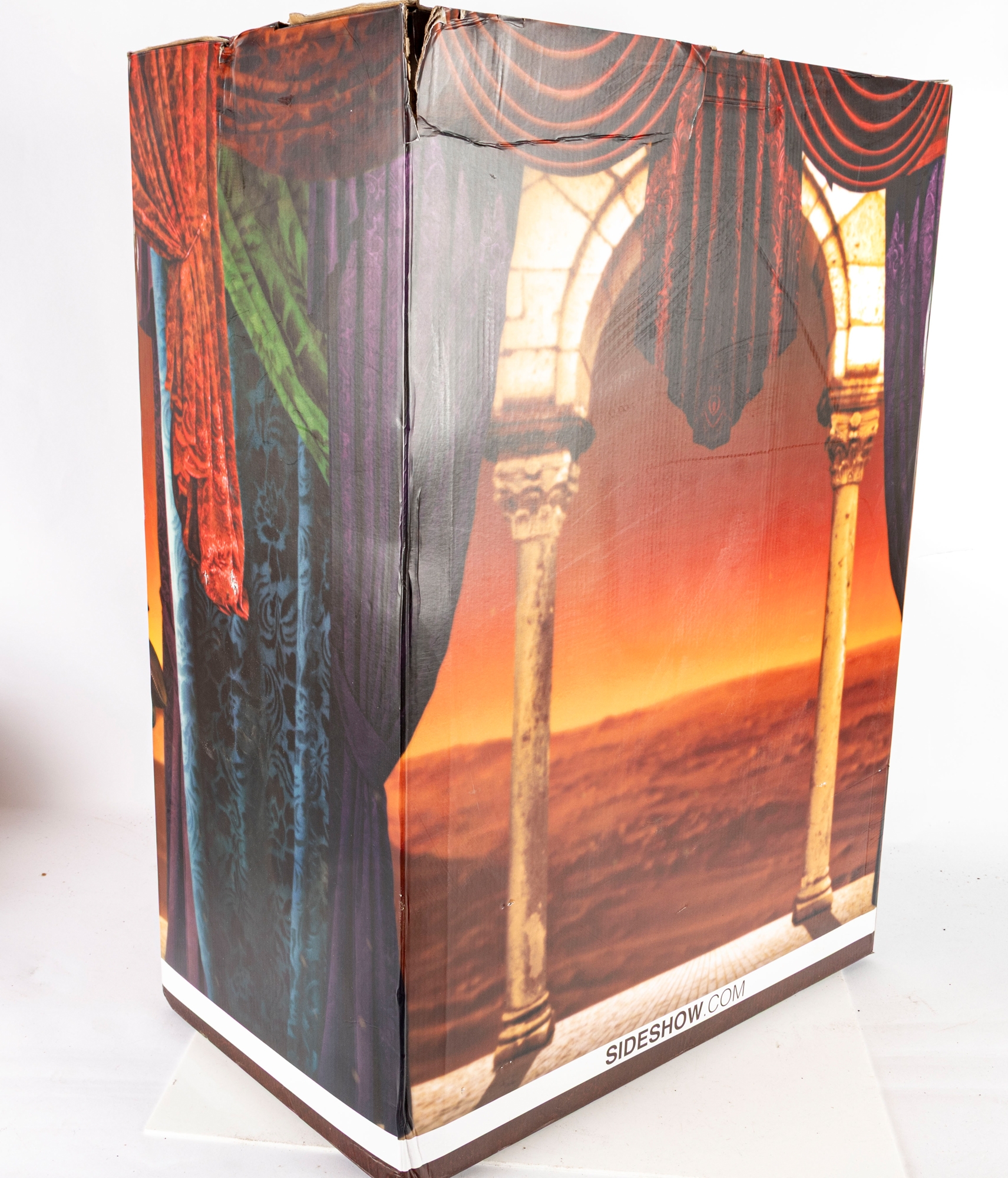 Figure remains secured within original packaging and appears unused. The original box shows visible wear, including creases, corner crushing, and tearing to top flaps (see photos). Inner Styrofoam is intact and marked with Sideshow authenticity seal.