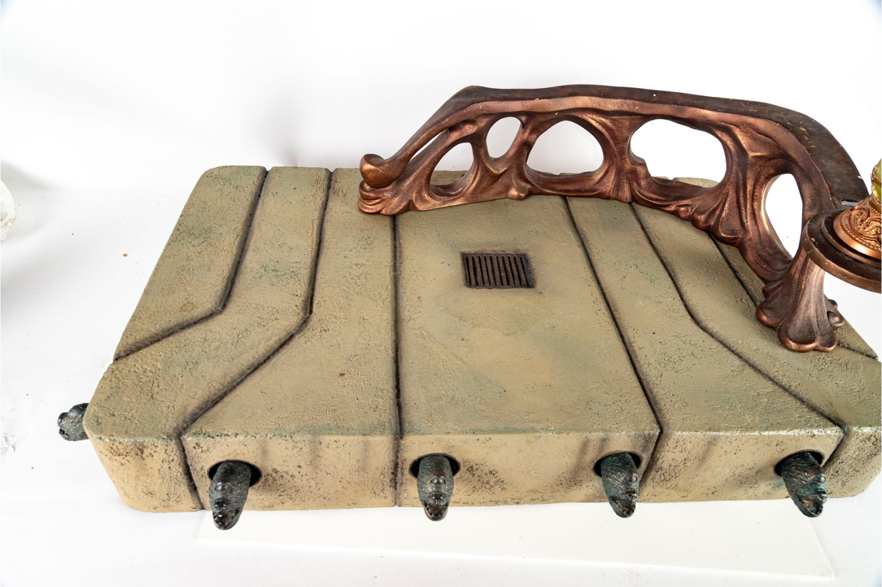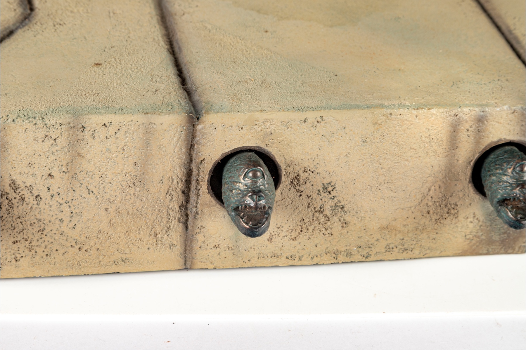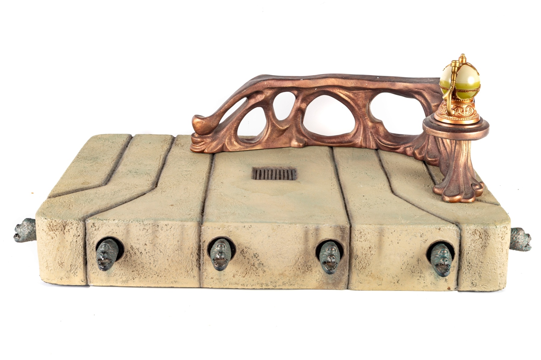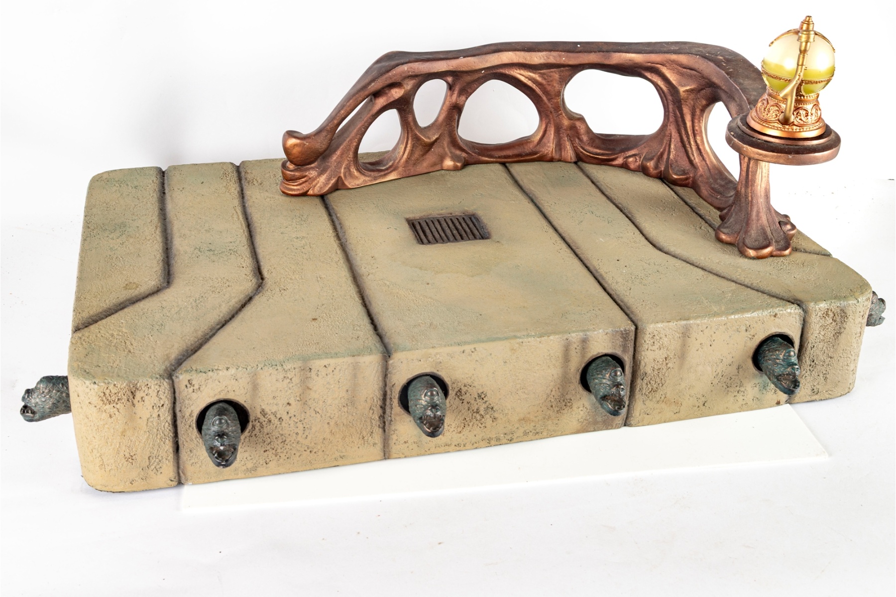 An original Sideshow Collectibles “Jabba’s Throne Environment” 1:6 scale display base, designed as a companion piece for the Star Wars Scum & Villainy series Jabba the Hutt figure. This highly detailed environment replicates Jabba’s iconic dais from his Tatooine palace as seen in Return of the Jedi, complete with sculpted texturing, bronze-tone railing, and ornate hookah accessory. Numbered 0039/4,200. Jubba sold separately.