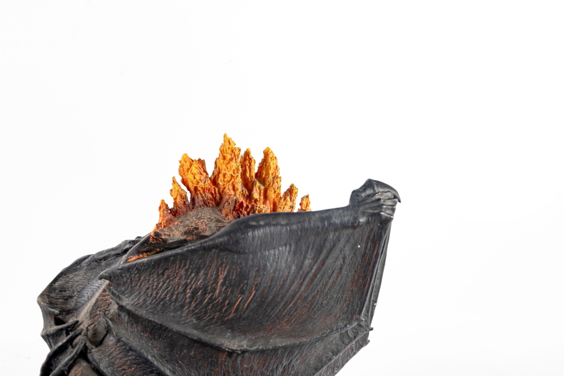 The piece showcases the fiery demon emerging from stone, complete with textured rock base, dynamic wingspan, and flame details rising from its back.