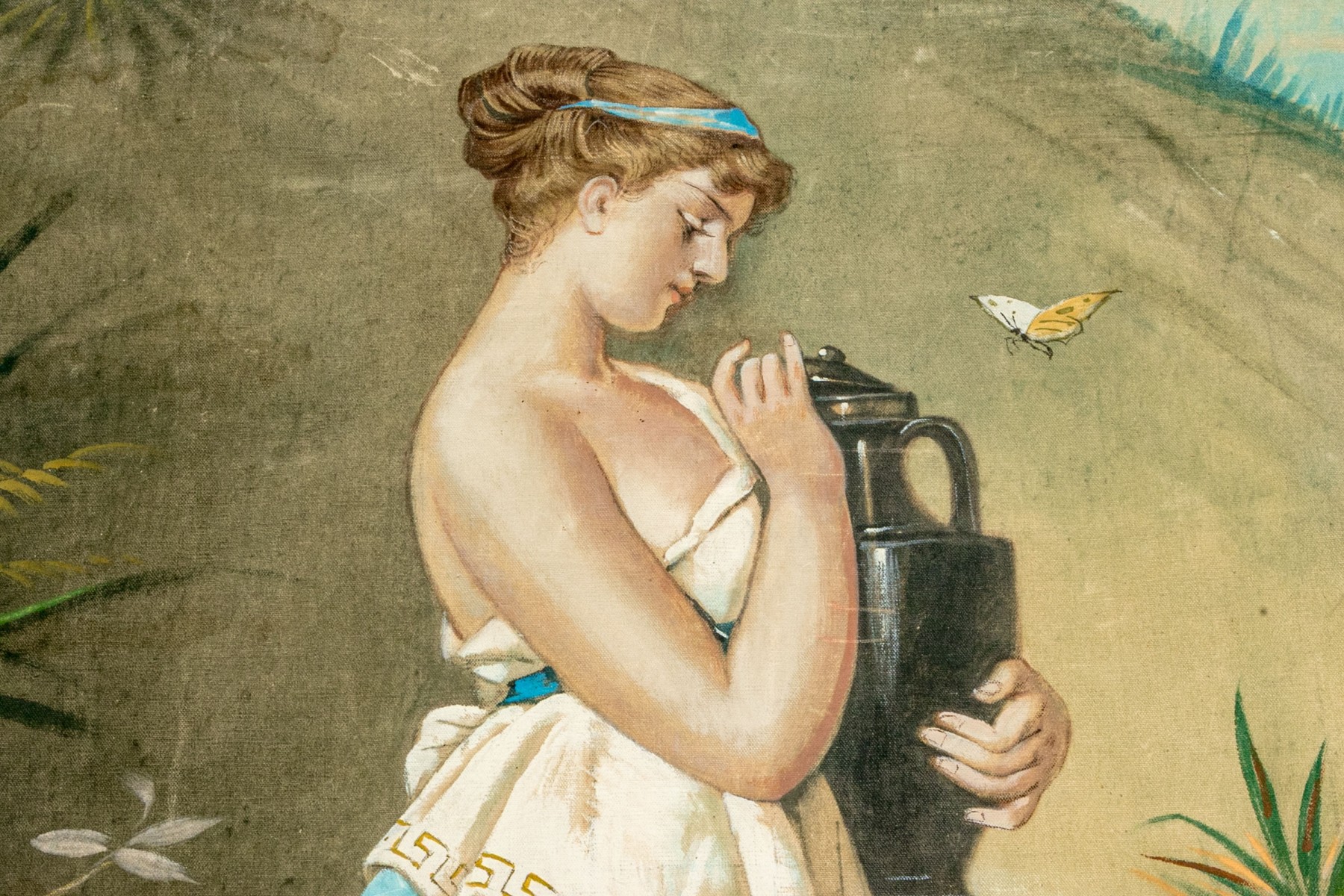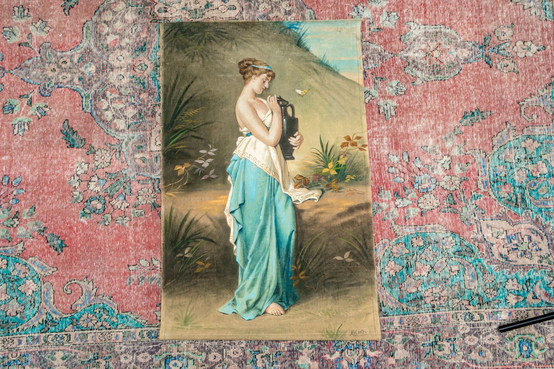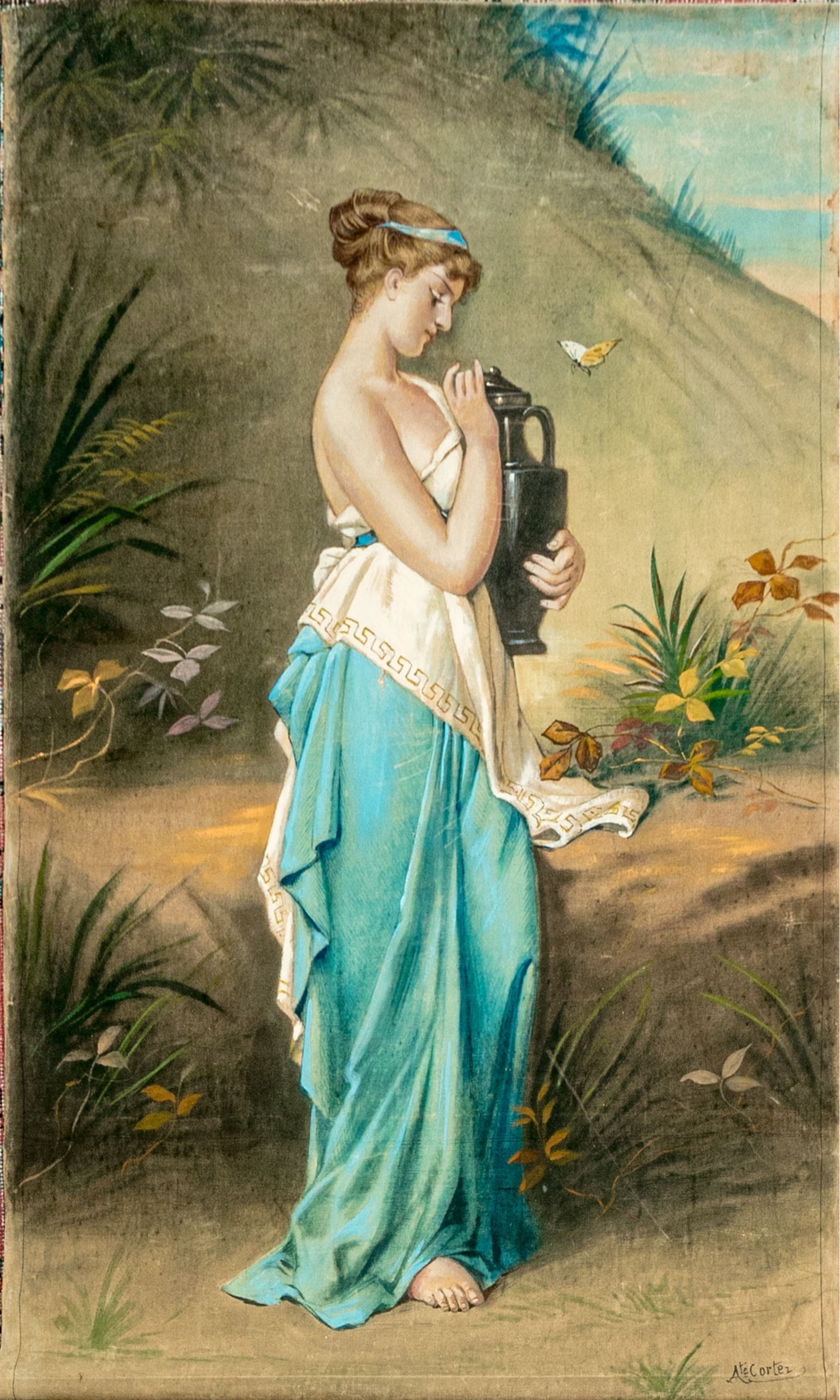 A well sized and nicely rendered antique oil painting on canvas after Robert Julius Beyschlag (German, 1838-1903) depicting the goddess Psyche in classical white and aqua blue attire standing in profile while carrying an urn in a natural landscape. Signed A. Le Cartez lower right. The canvas is loose and unframed, not on a stretcher support.