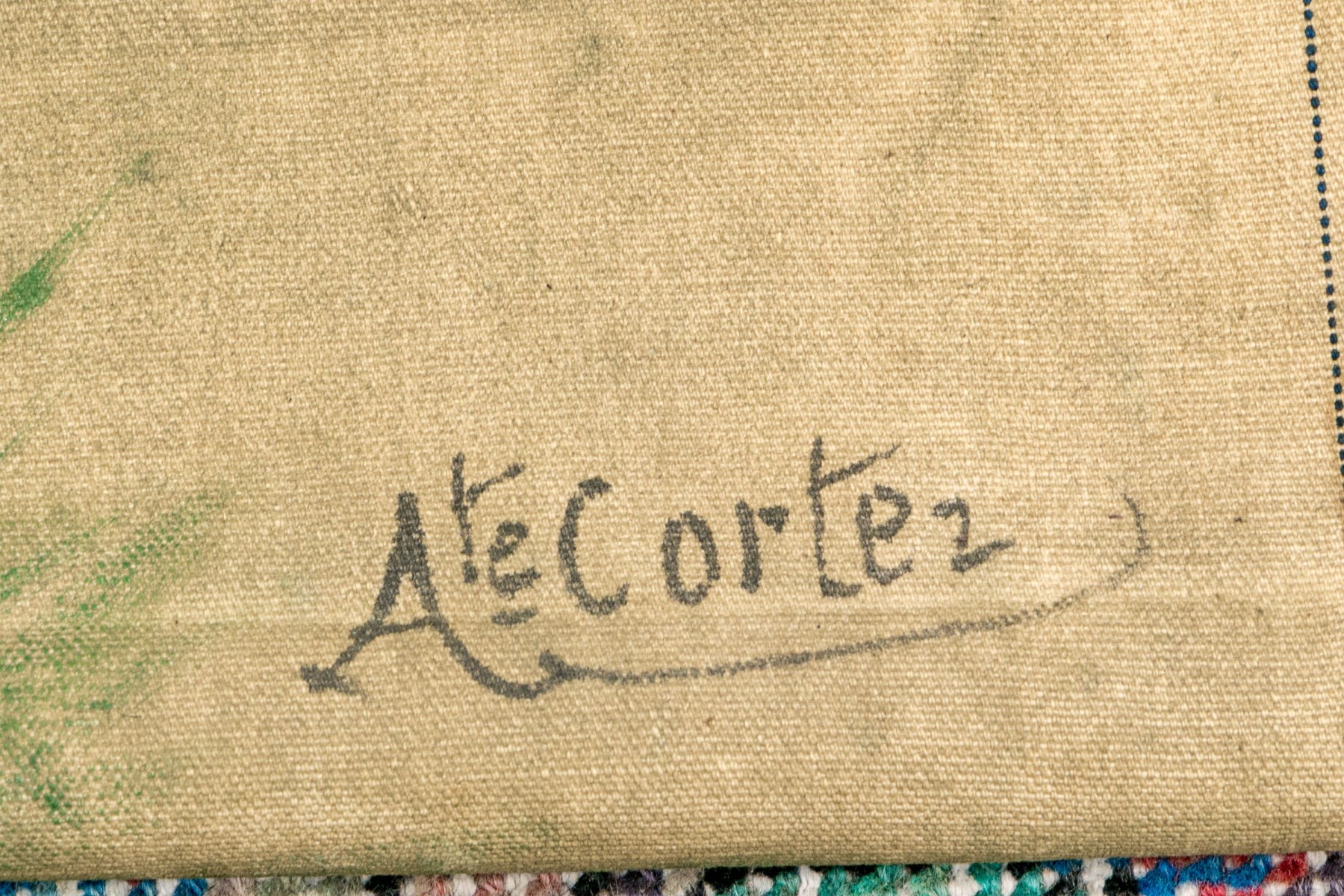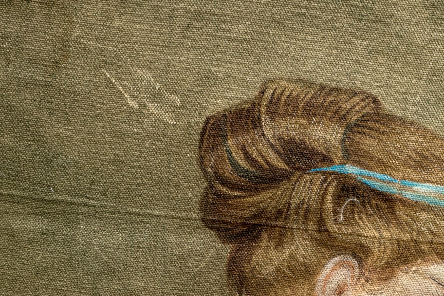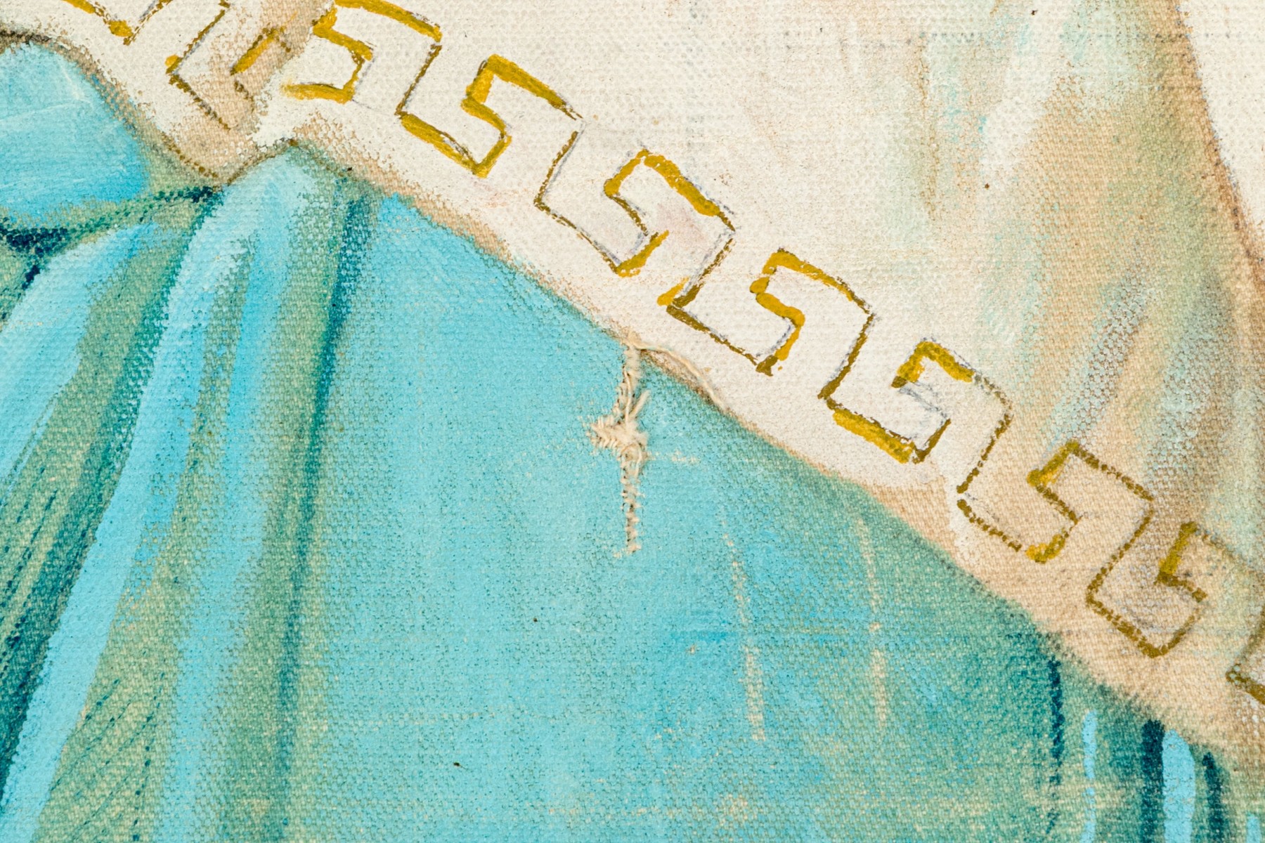 A well sized and nicely rendered antique oil painting on canvas after Robert Julius Beyschlag (German, 1838-1903) depicting the goddess Psyche in classical white and aqua blue attire standing in profile while carrying an urn in a natural landscape. Signed A. Le Cartez lower right. The canvas is loose and unframed, not on a stretcher support.