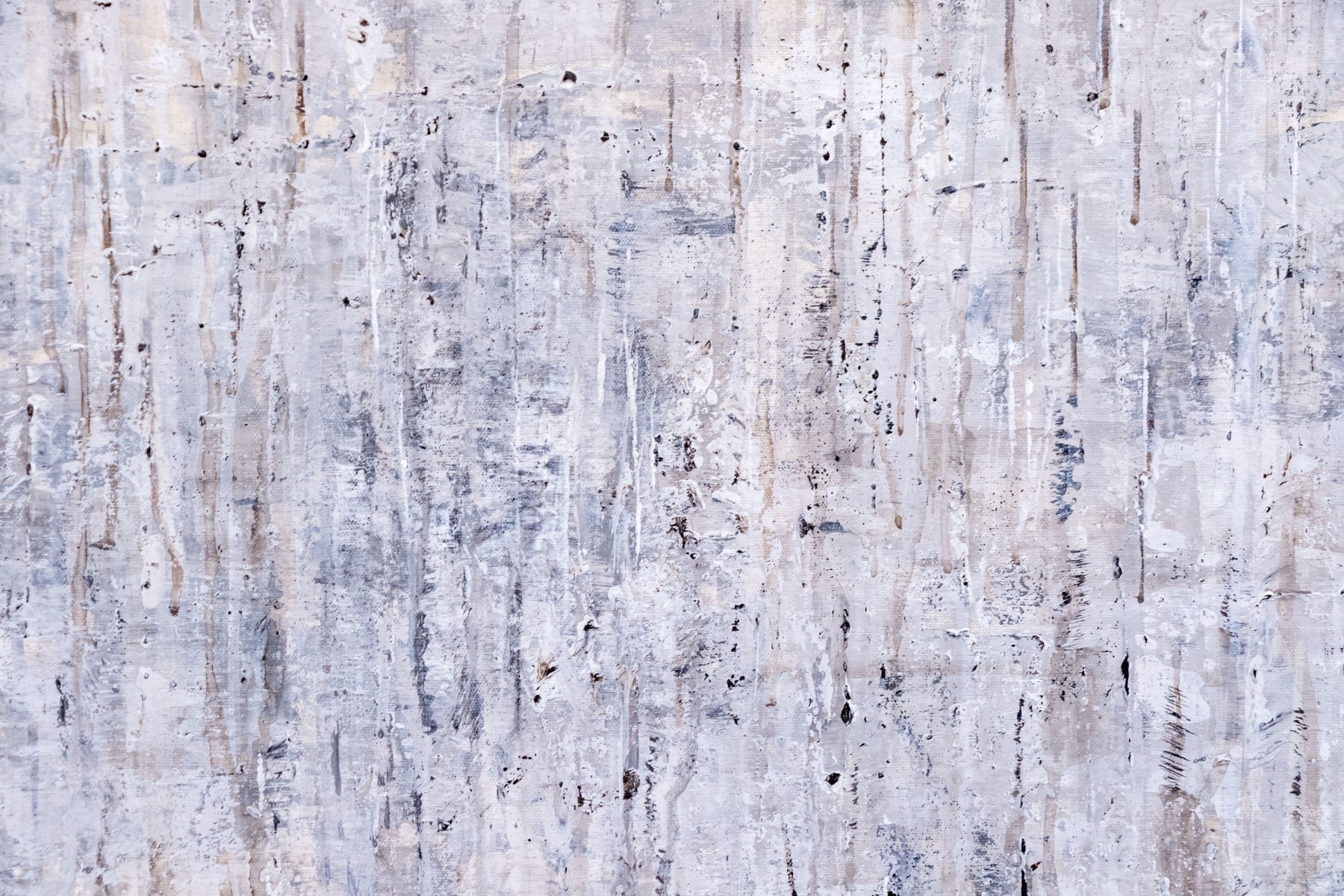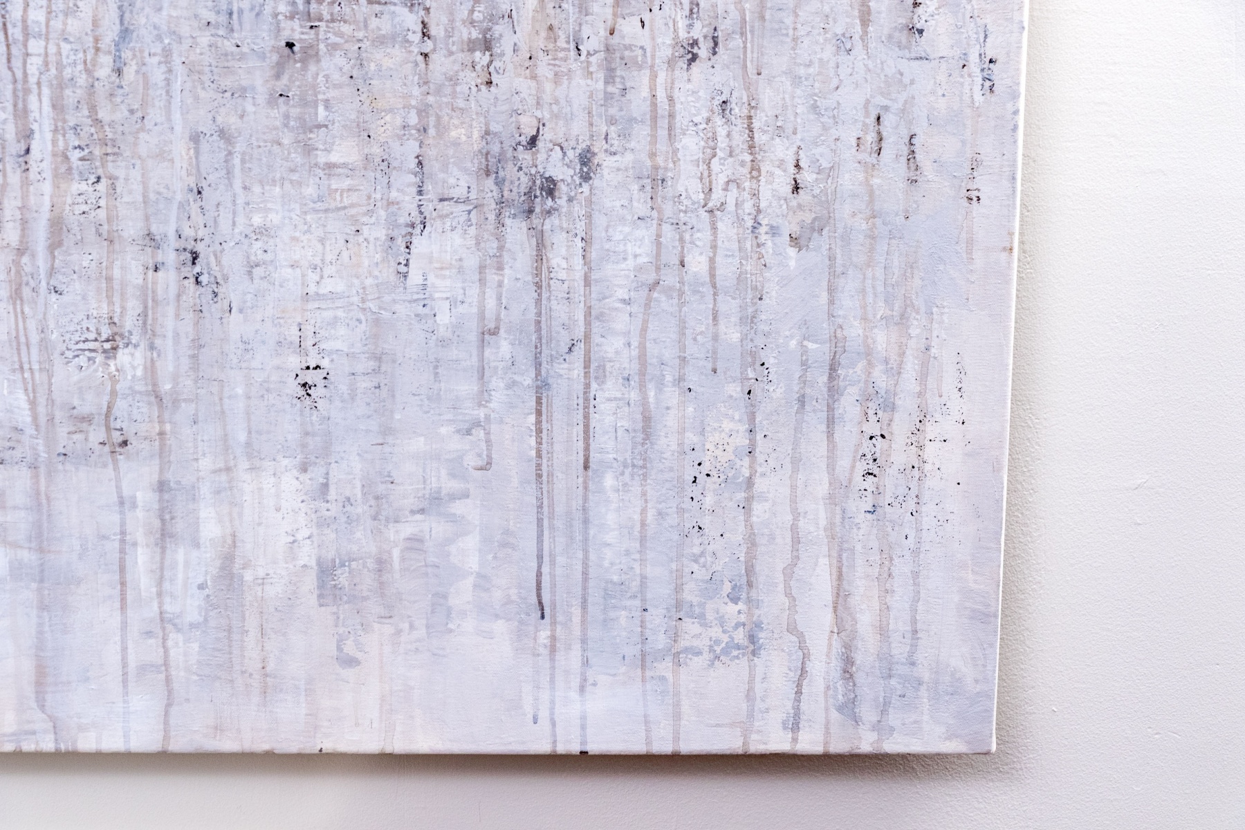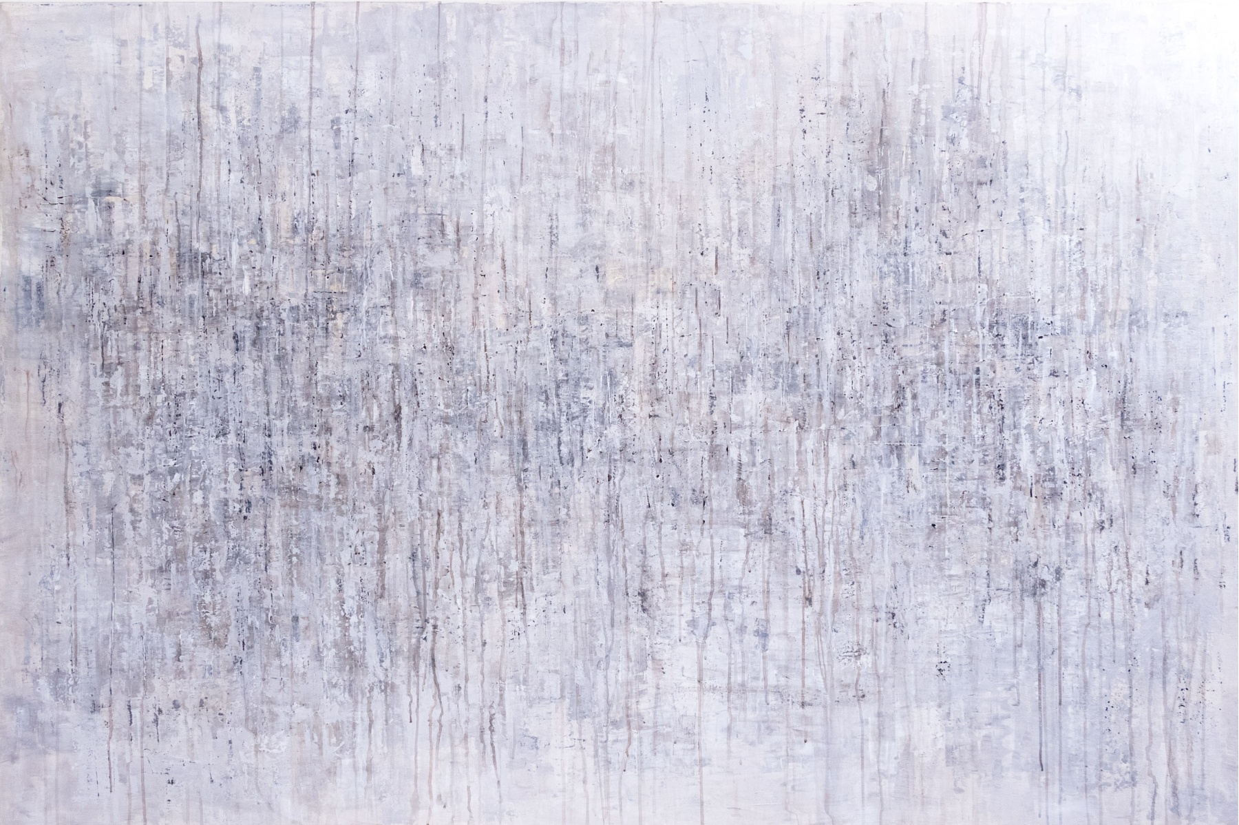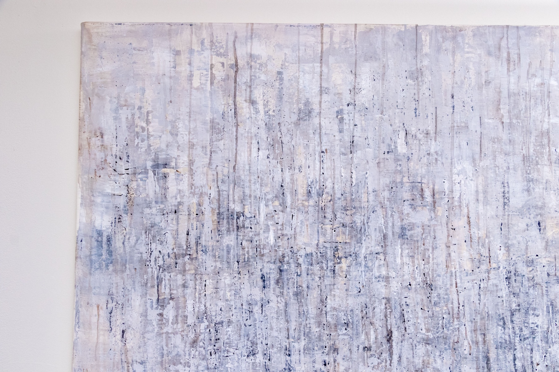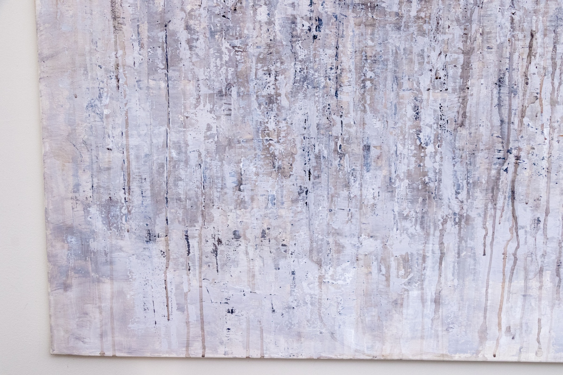 A large scale contemporary painting on canvas depicting an abstract composition with vertically dripped and splattered striations in brown and dark indigo against a dappled cream, purple, and gray ground creating a striking textural appearance with fine detail and rhythm throughout. Signed and dated 2011 on the verso. The canvas is mounted to a stretcher, unframed.