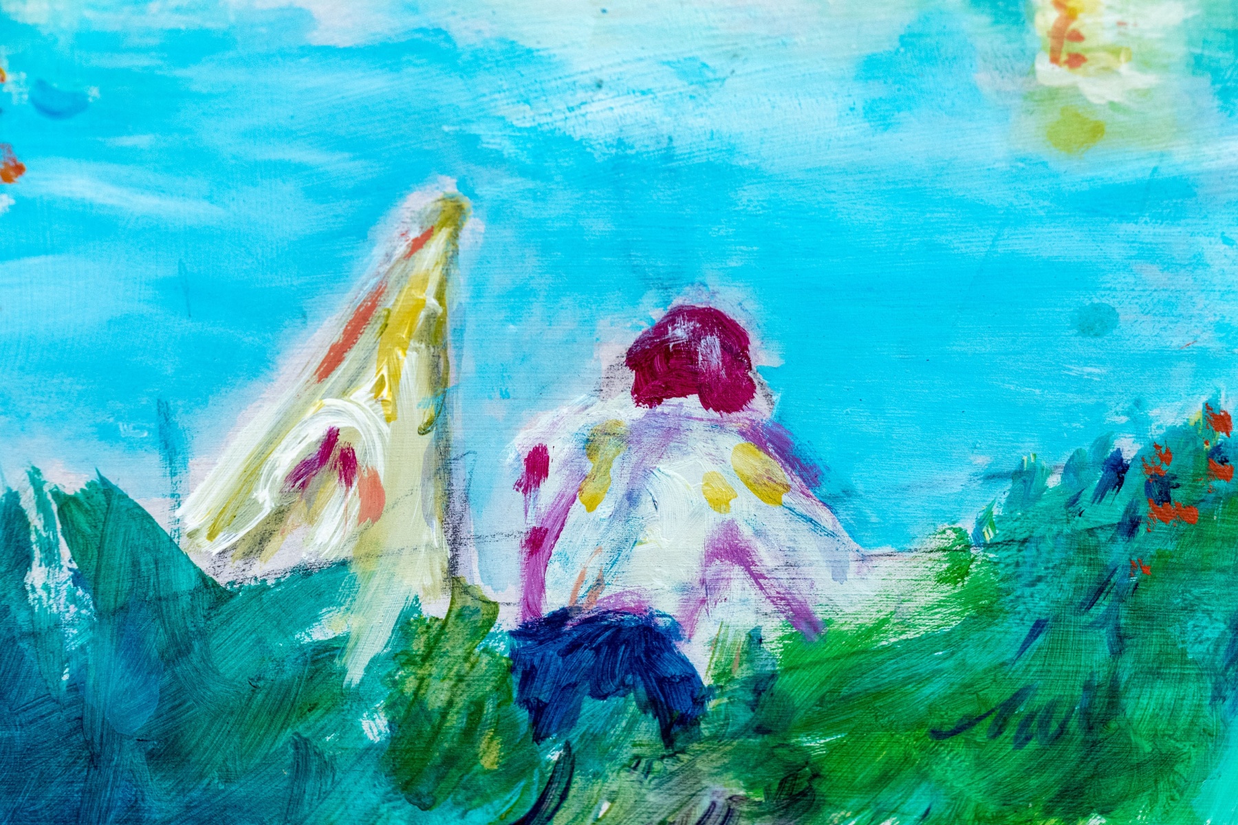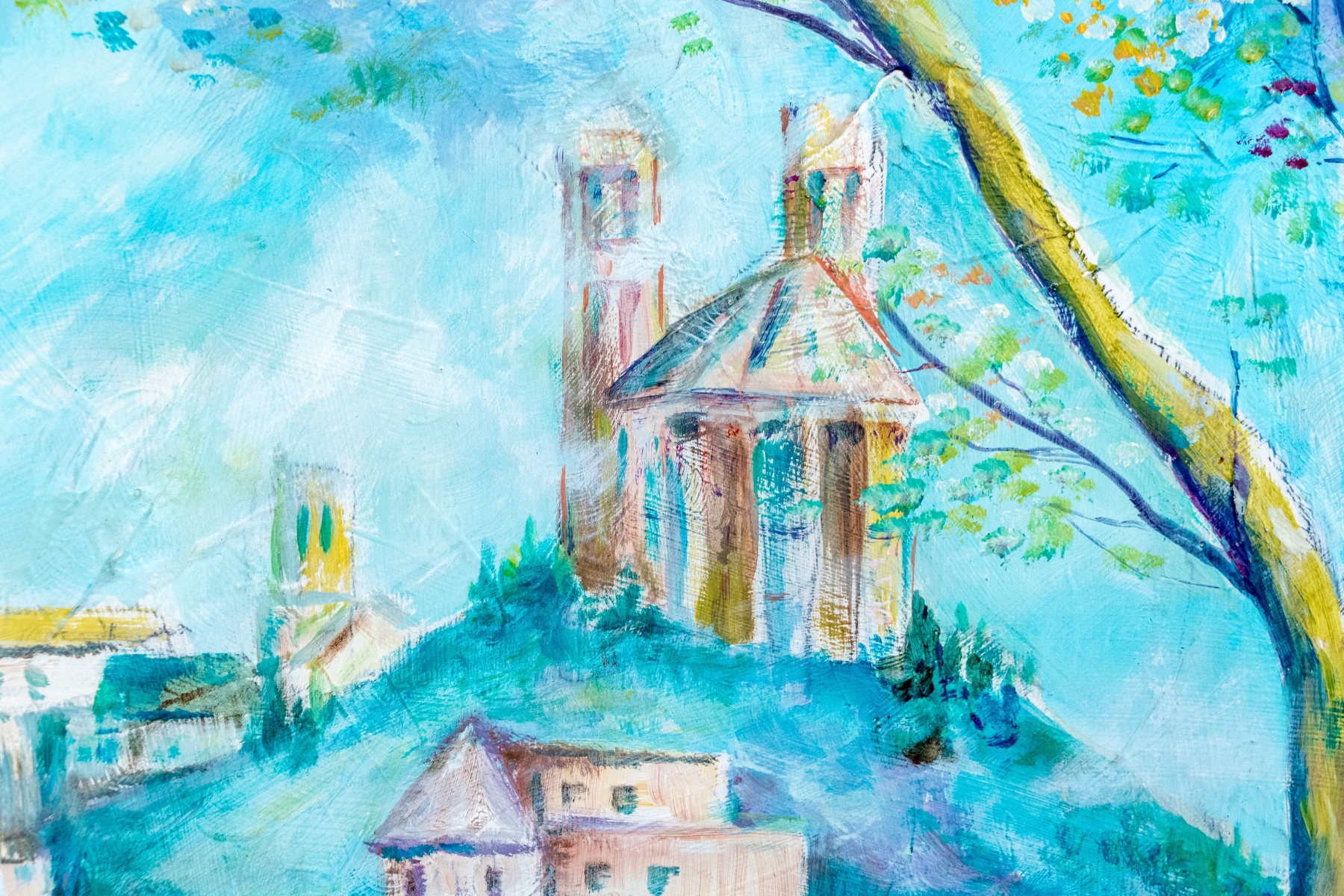 A wonderful impressionist acrylic painting on board depicting a figure in the foreground along a grassy hill with two trees overlooking a calm, vibrant aqua blue lake leading to a town on a hill along the horizon beneath a gently clouded blue sky. Signed Buckley lower right.