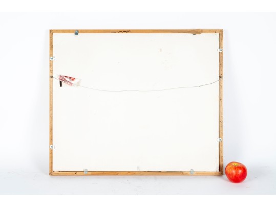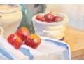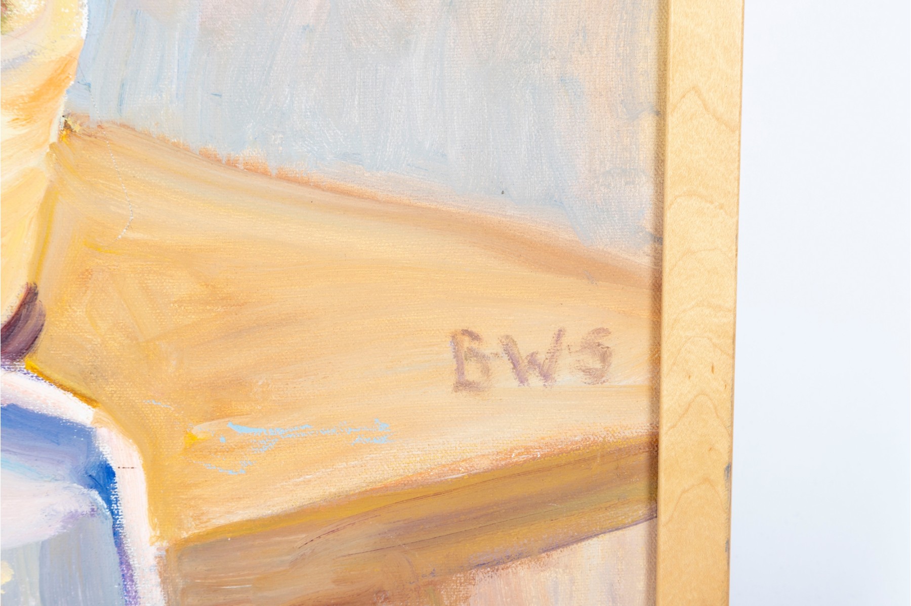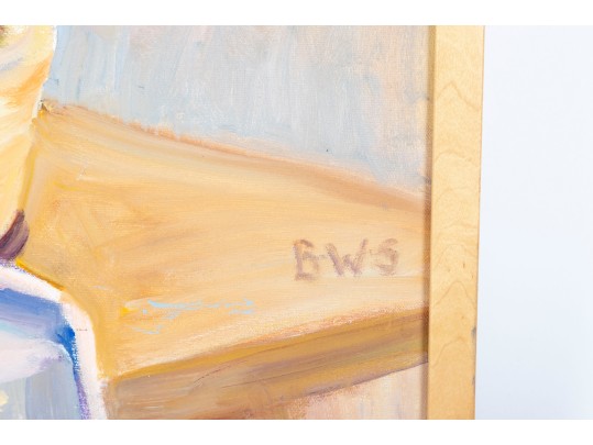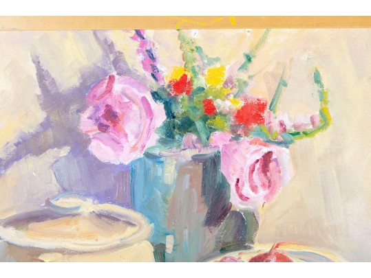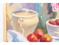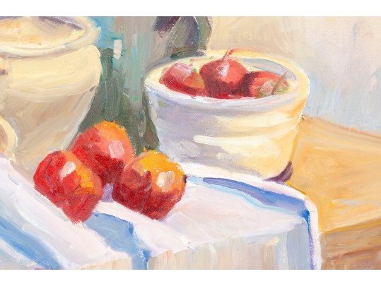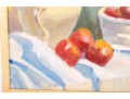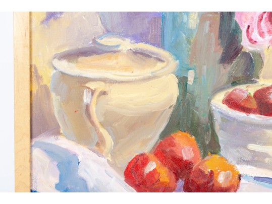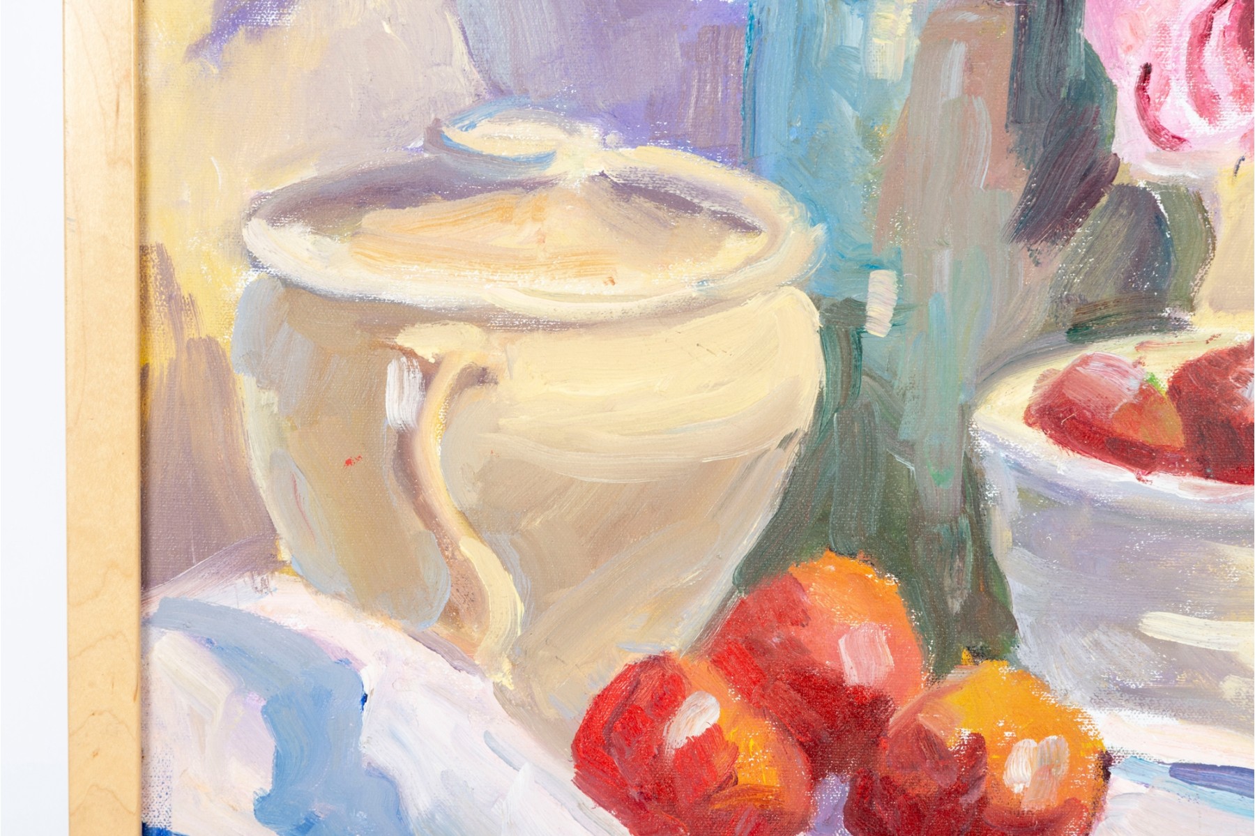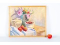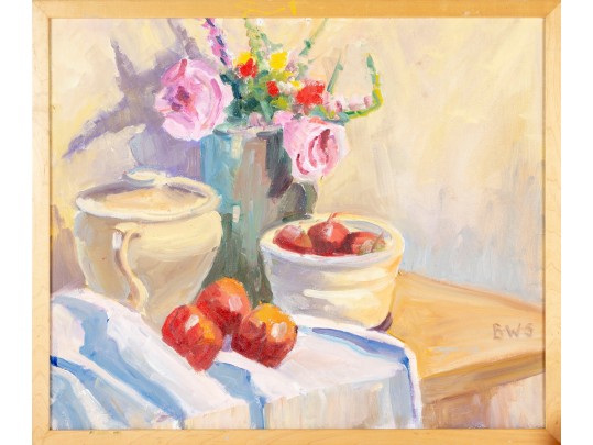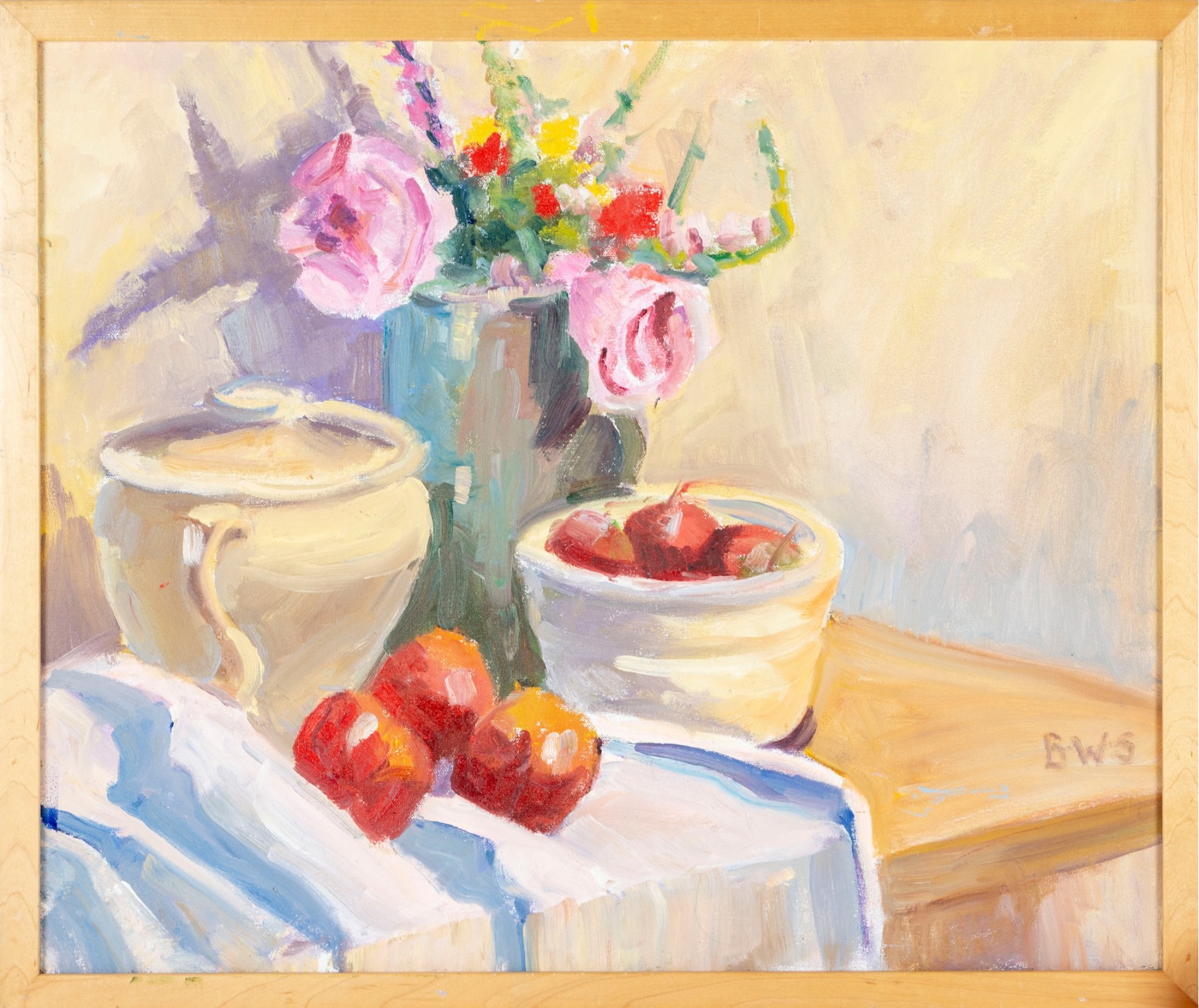 A wonderful impressionist oil painting on board depicting a still life with a vase of flowers next to red fruit and a cream ceramic urn placed atop a blonde wood table with a draped white cloth against a pale yellow background. Initialed BWS lower right. Displayed in a blonde wood frame.