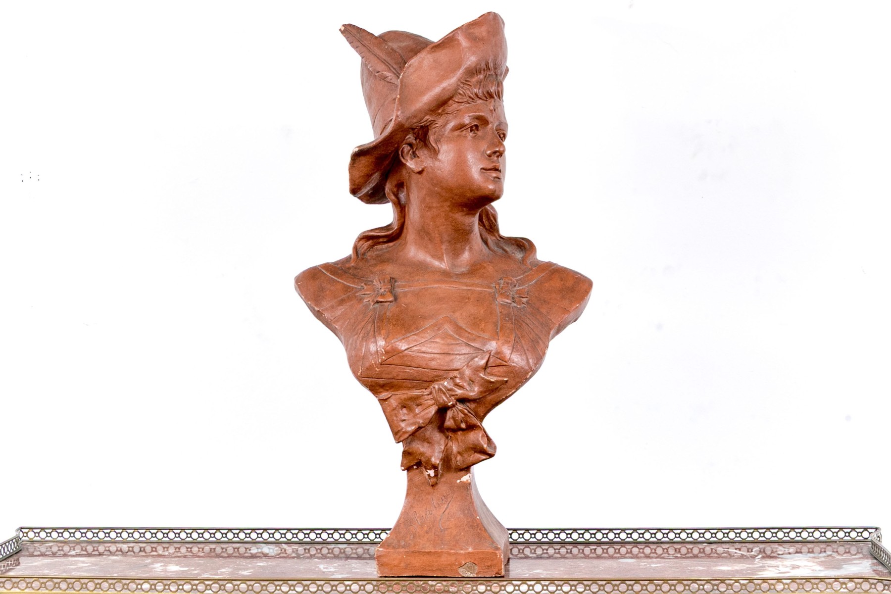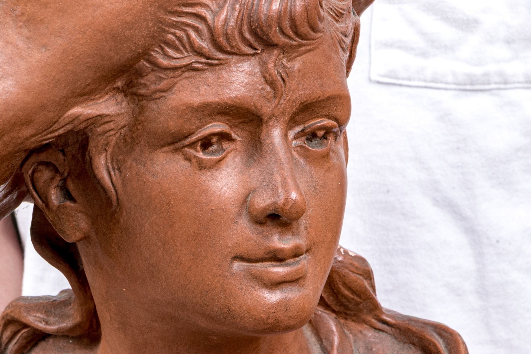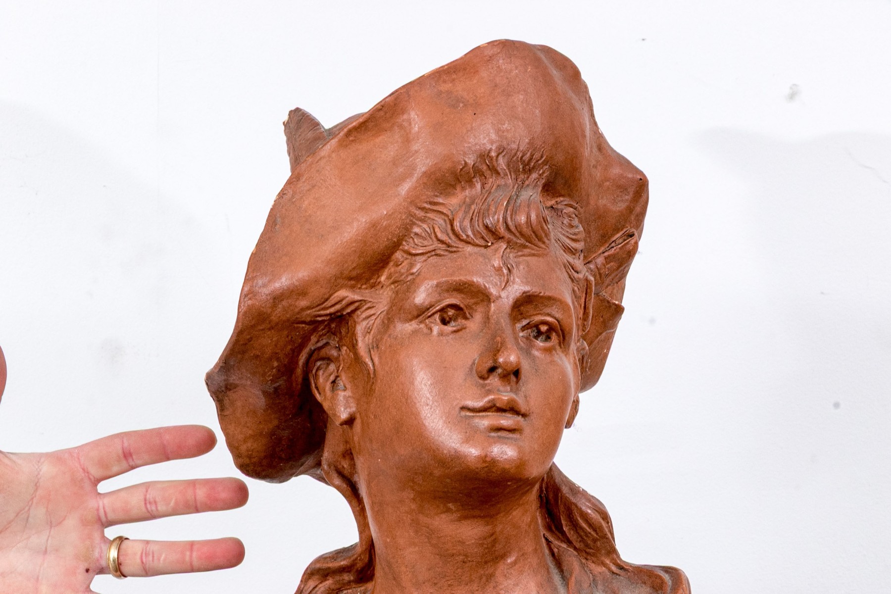 A beautifully detailed ceramic bust of a woman wearing a brimmed hat with a feather, looking off to the right with a gentle expression. Gently waved hair cascades over her shoulders, leading to ribbons at the collarbones and beneath the bust over a tapering column on a square base. Signed to the back.