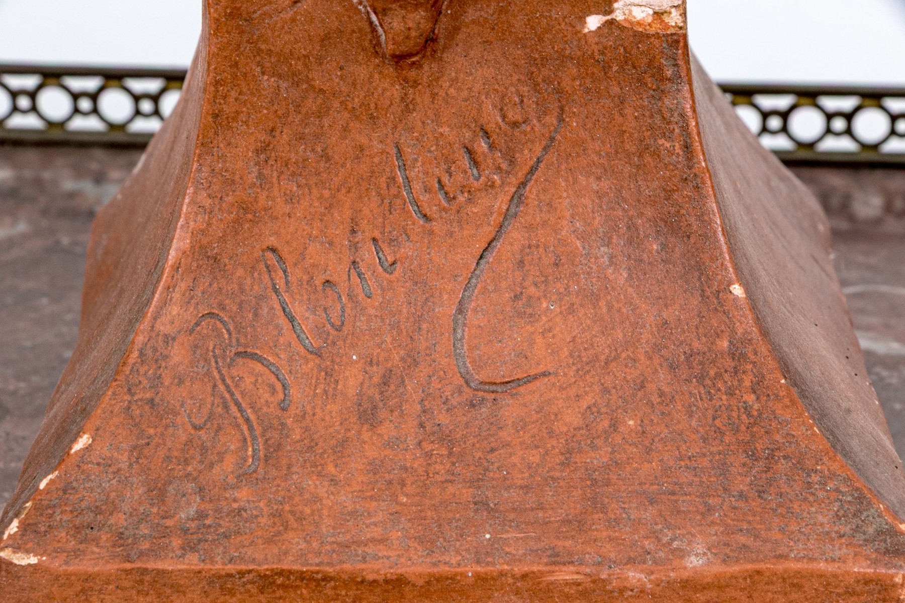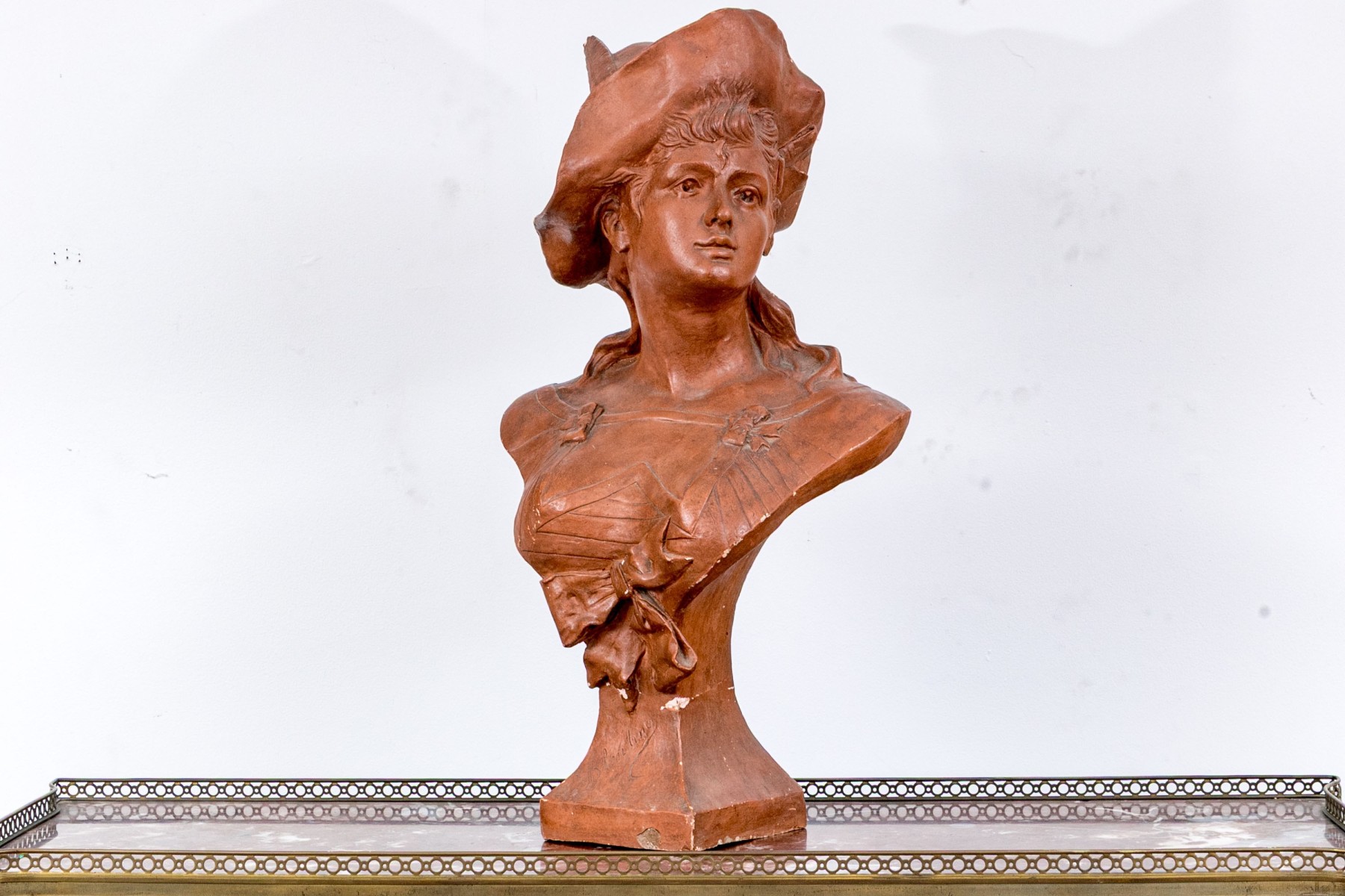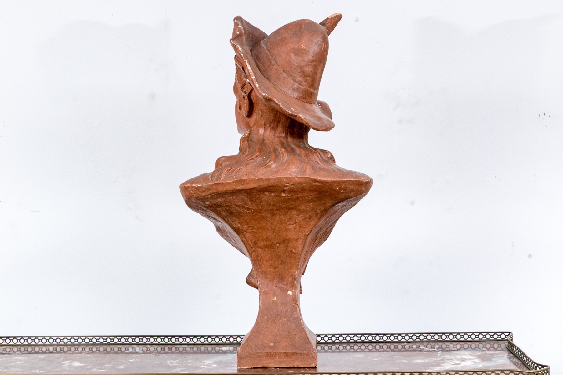 A beautifully detailed ceramic bust of a woman wearing a brimmed hat with a feather, looking off to the right with a gentle expression. Gently waved hair cascades over her shoulders, leading to ribbons at the collarbones and beneath the bust over a tapering column on a square base. Signed to the back.