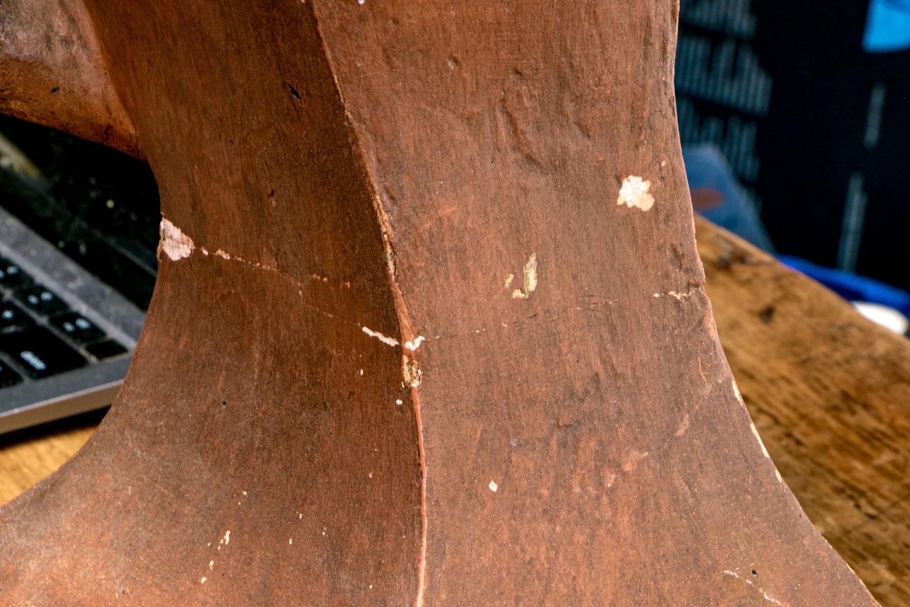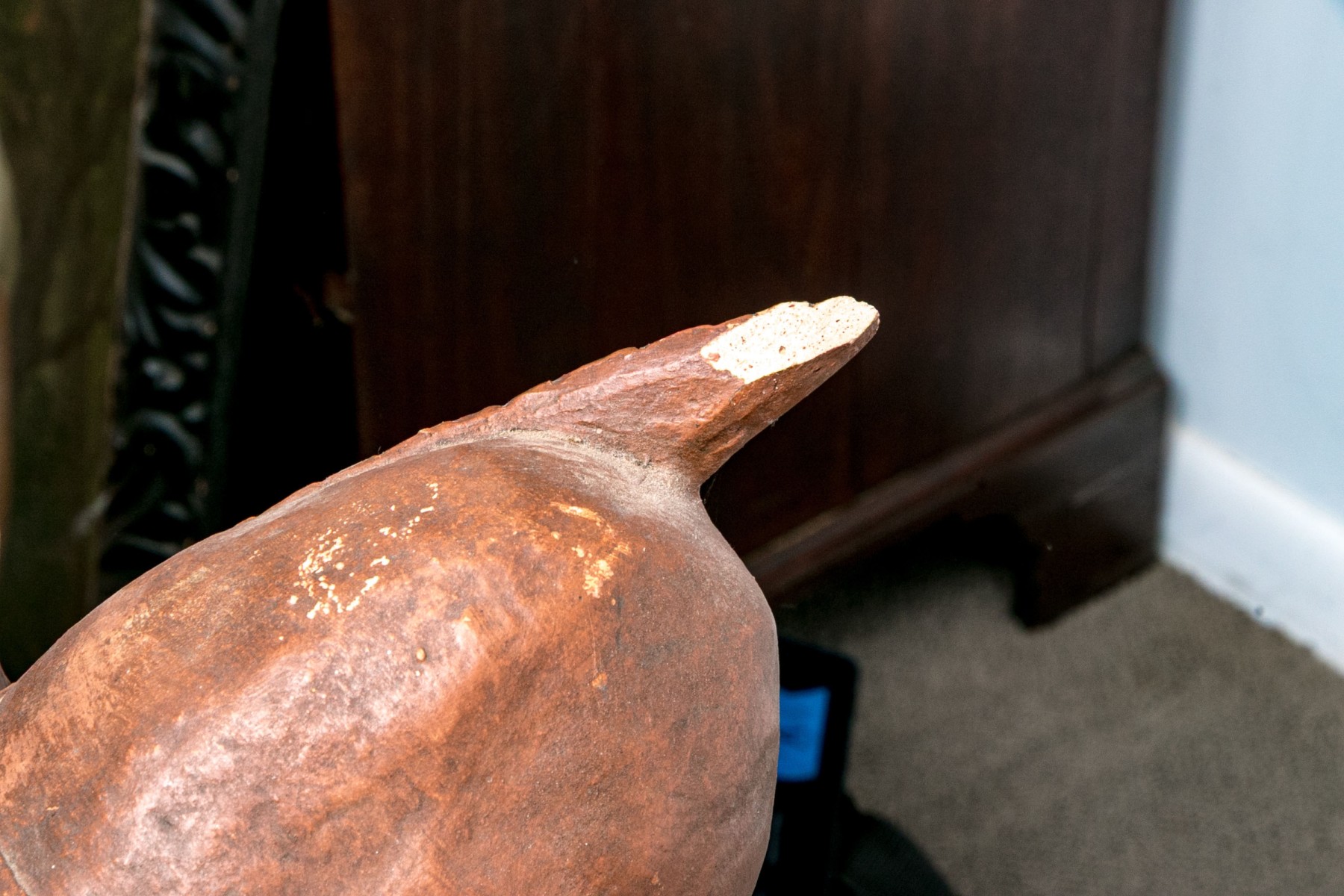 A chip to the tip of the feather and chips to the glazed finish around the trim edges. A crack or past repair to the pedestal with chipped losses. Despite wear still presents well as a whole.