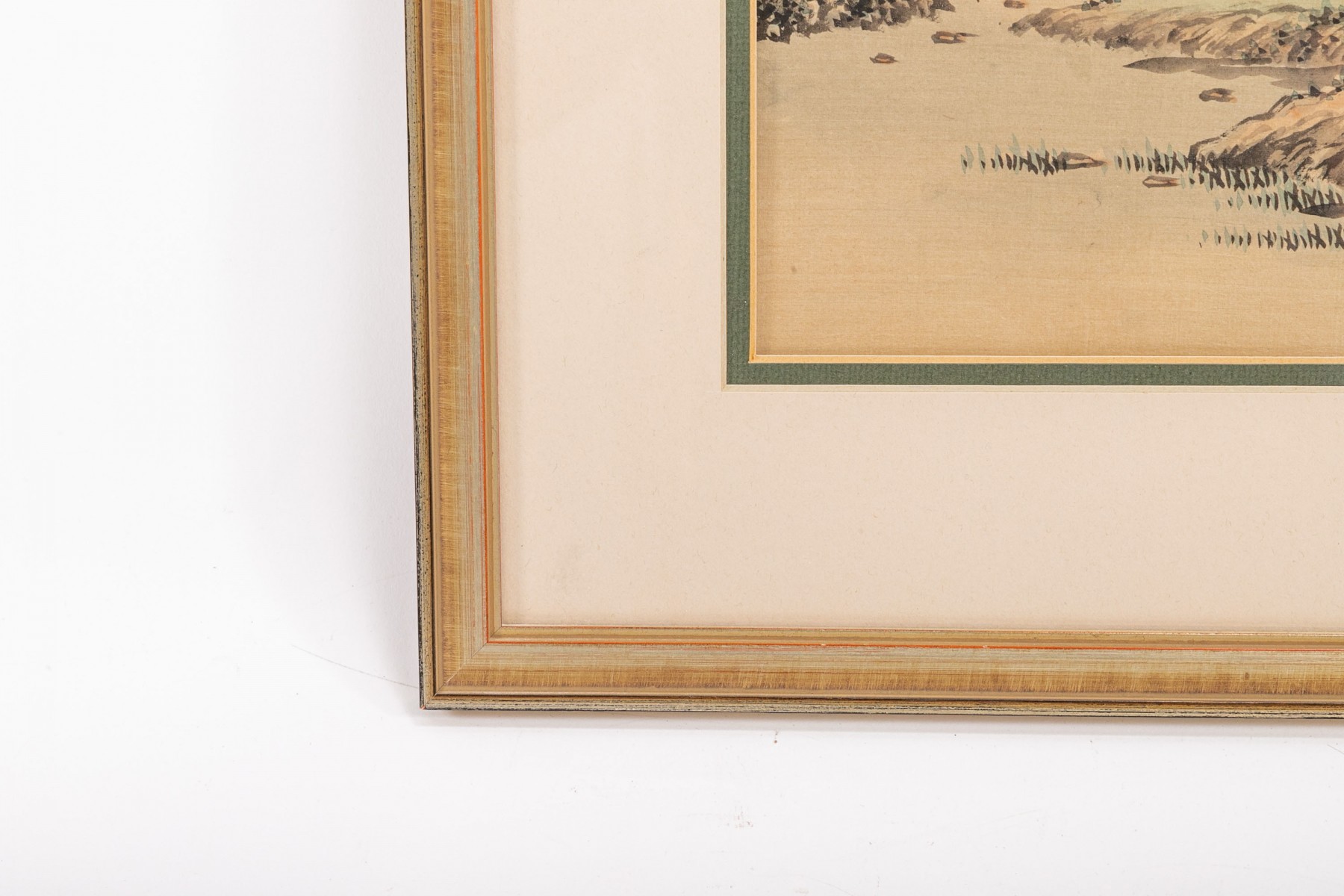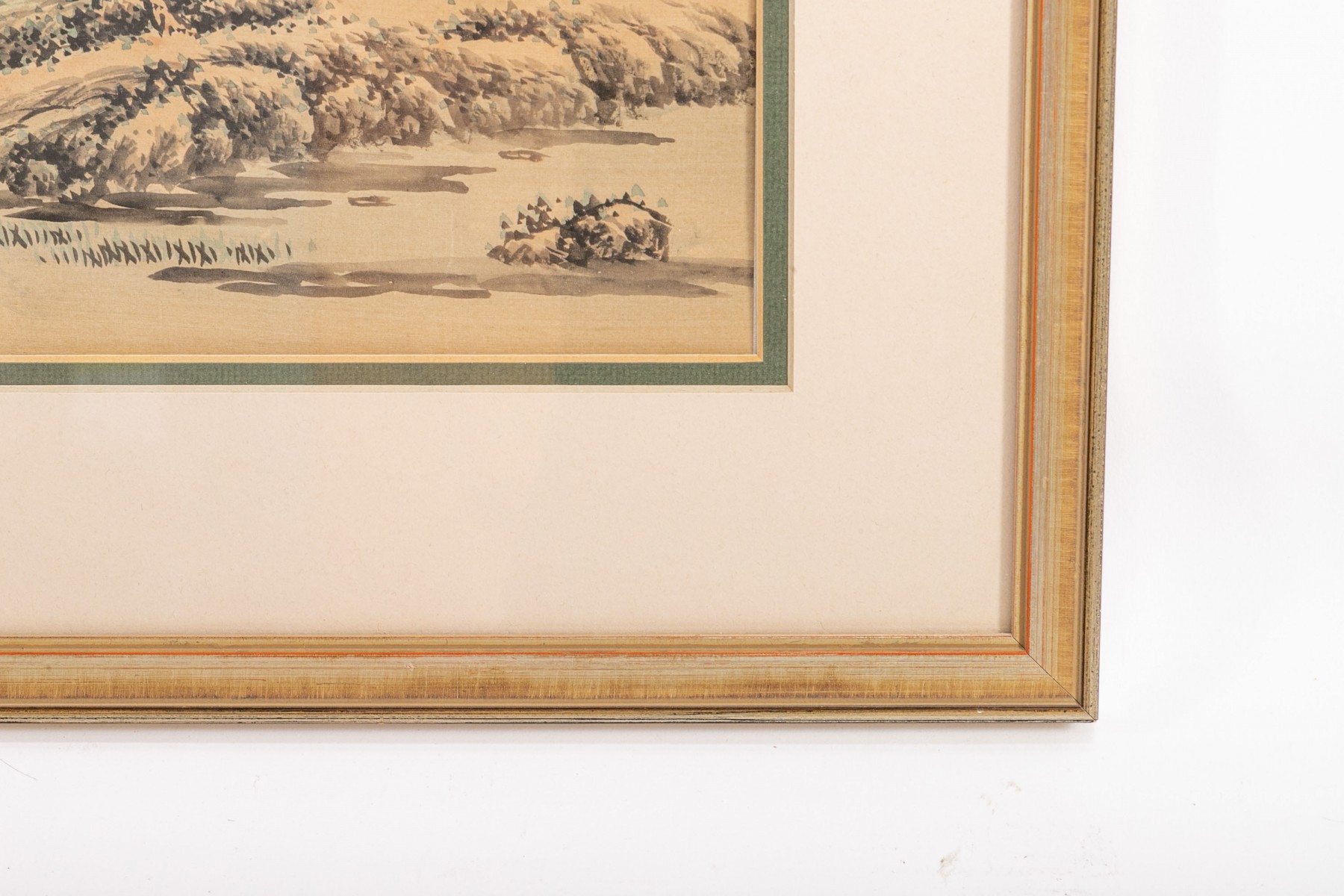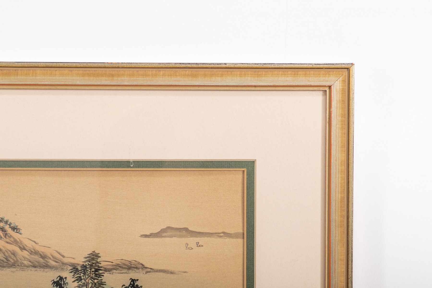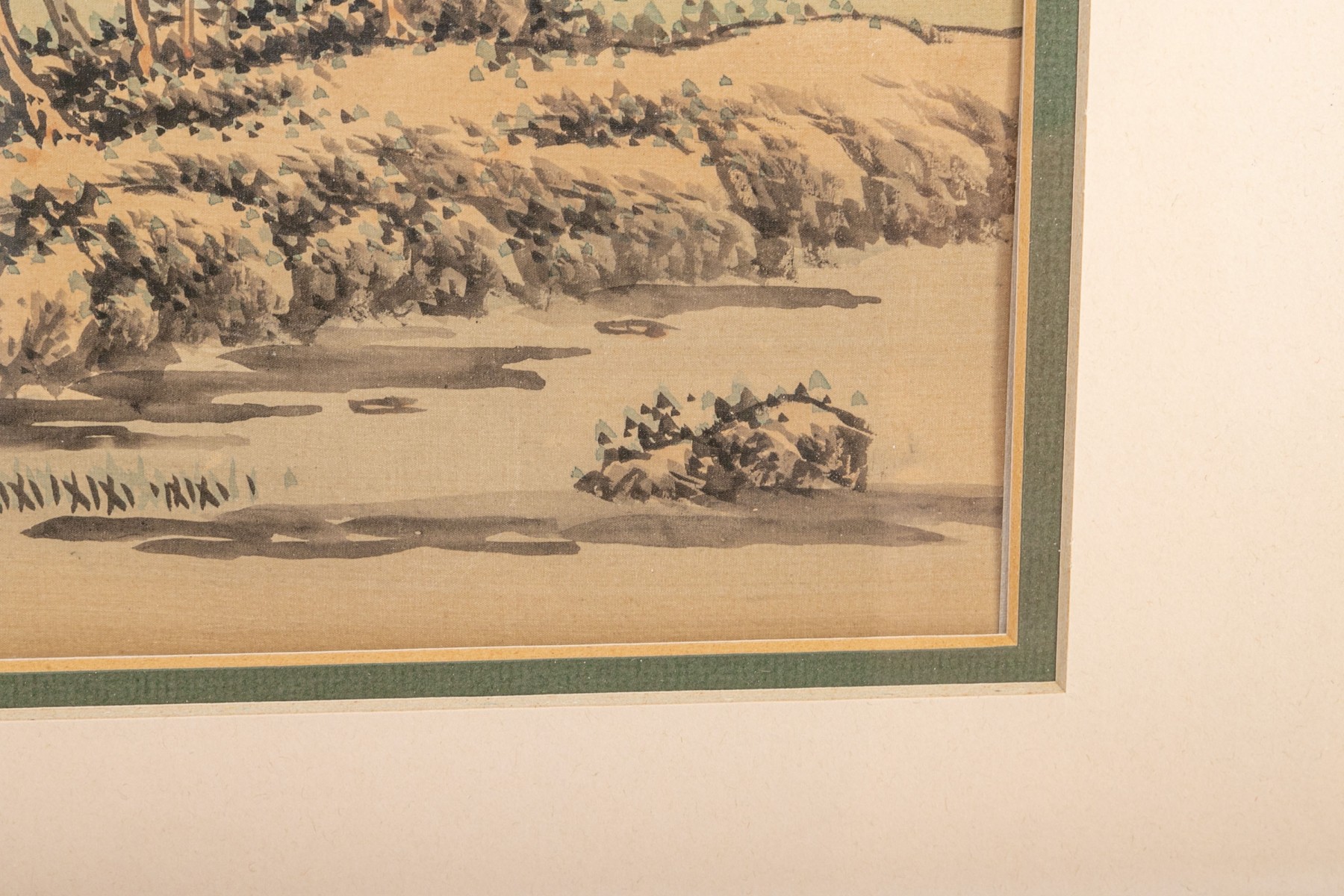 Vintage hand painted on silk featuring a lovely landscape scene in soft gentle colors. Mountains in the distance with trees, and a bridge with a person crossing over. Signed and stamped along the upper left corner. Displayed beneath glass in a 2-toned frame with a double mat that compliments the subject matter well. Dated from the framers in 1979 stamped el verso. Ready to hang!