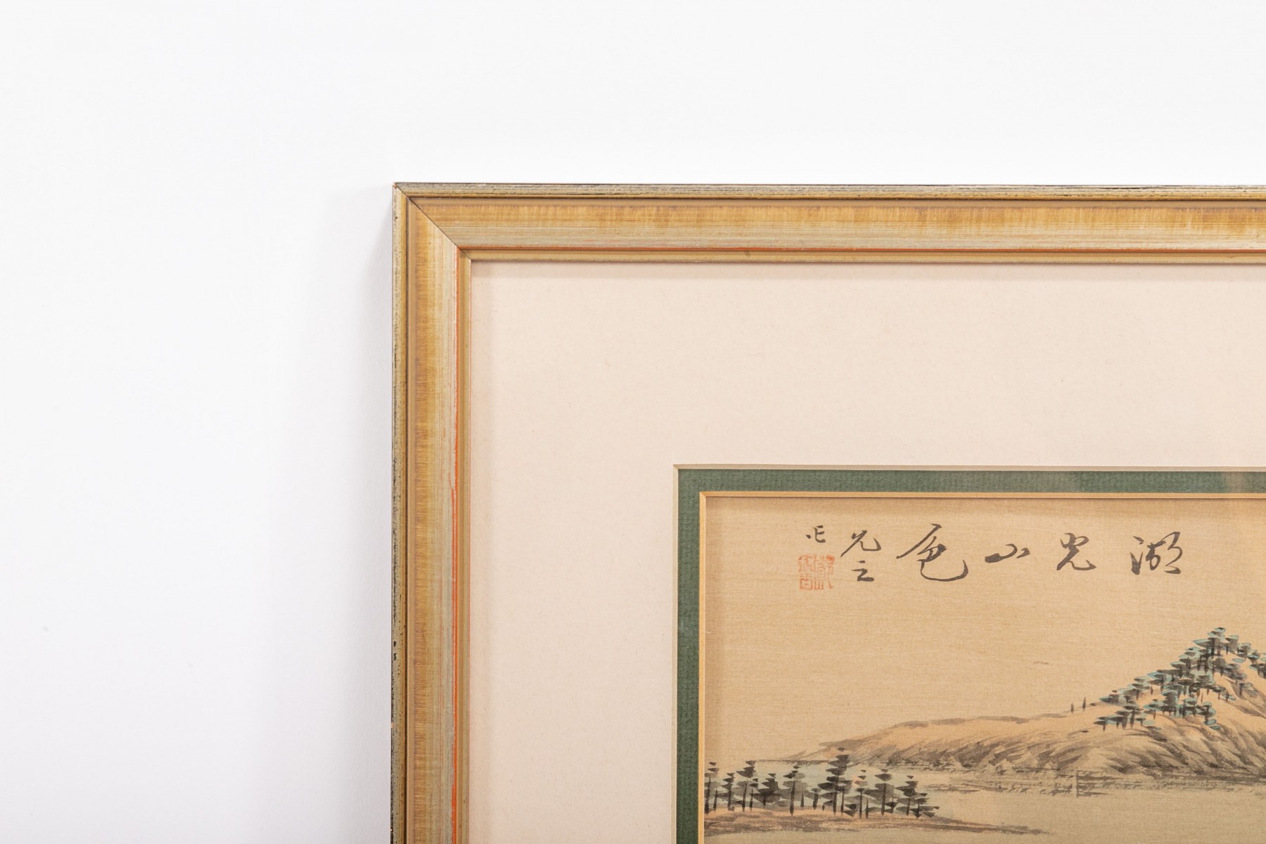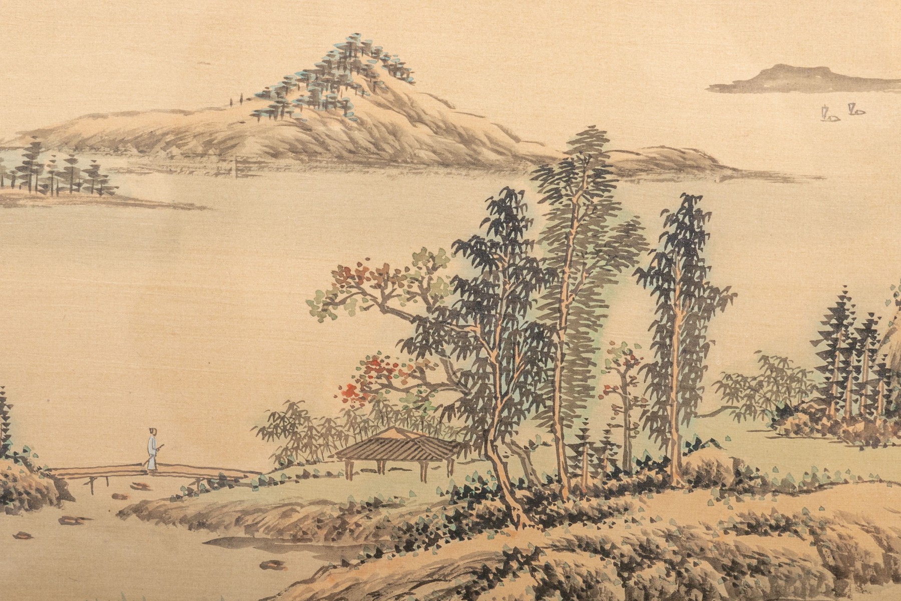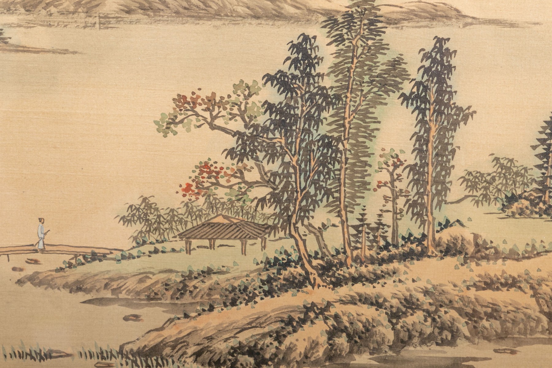 Vintage hand painted on silk featuring a lovely landscape scene in soft gentle colors. Mountains in the distance with trees, and a bridge with a person crossing over. Signed and stamped along the upper left corner. Displayed beneath glass in a 2-toned frame with a double mat that compliments the subject matter well. Dated from the framers in 1979 stamped el verso. Ready to hang!
