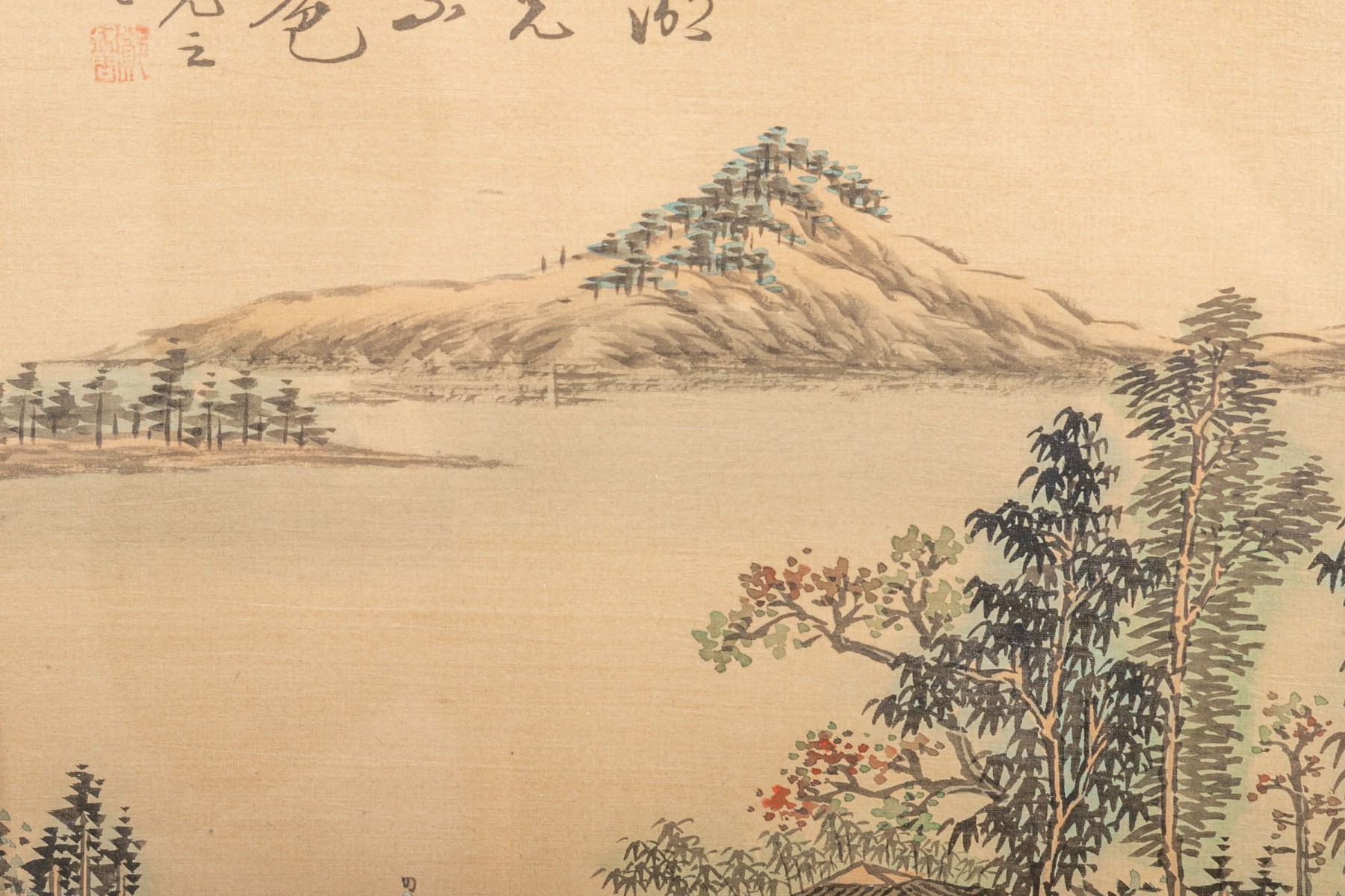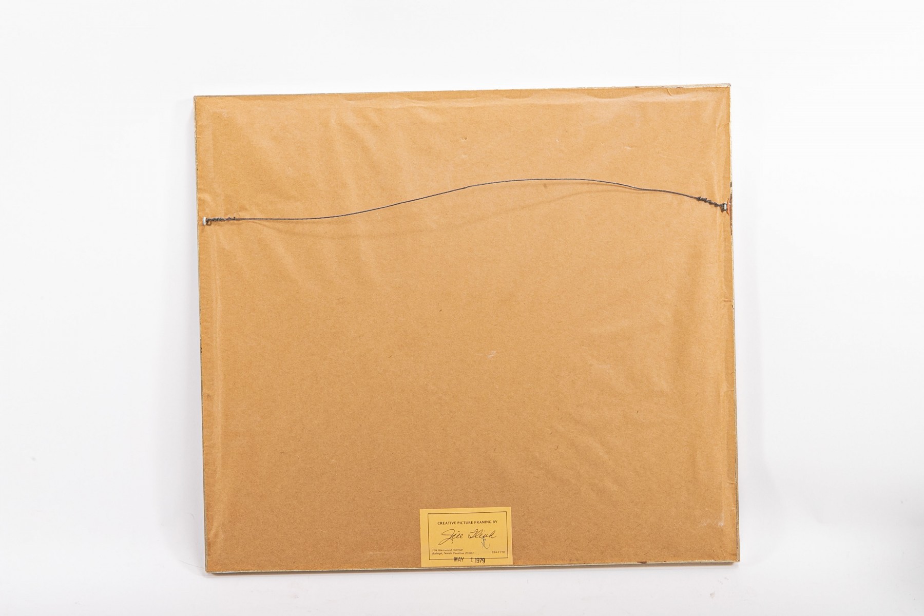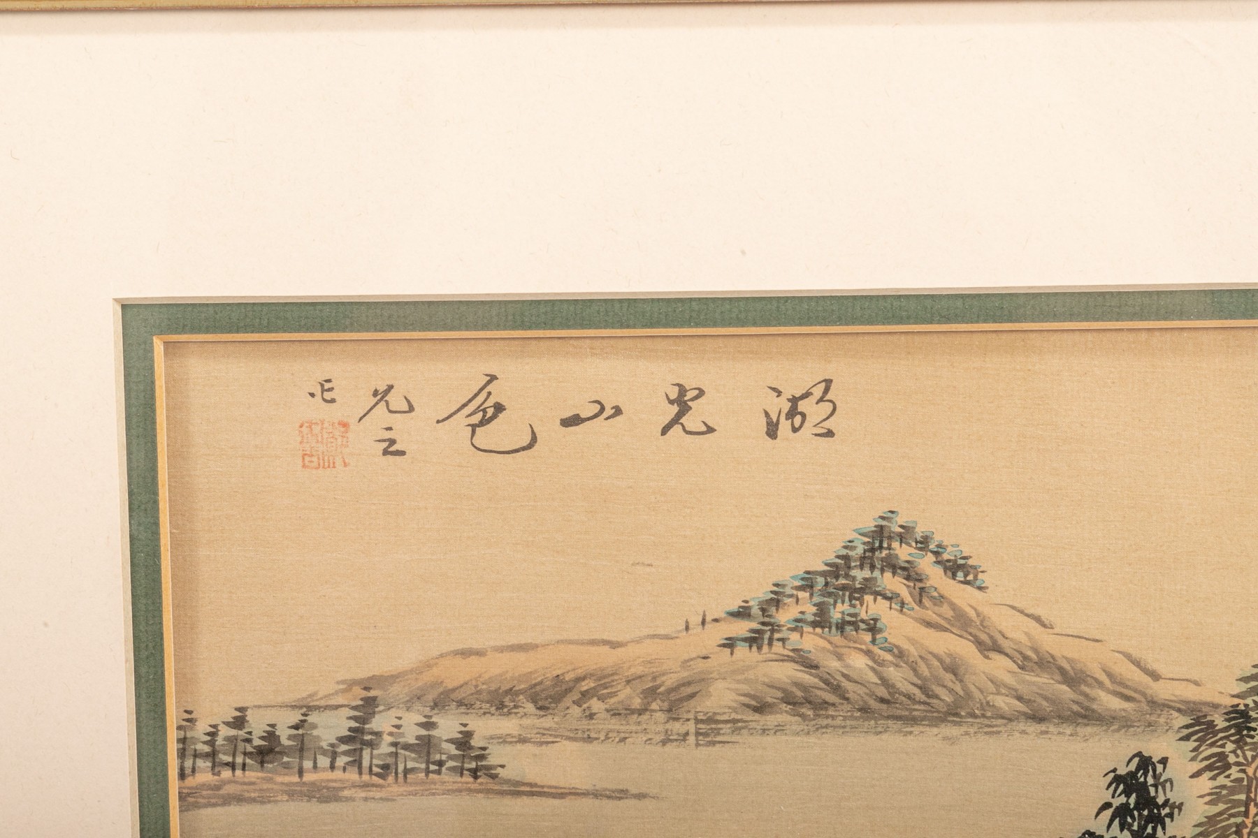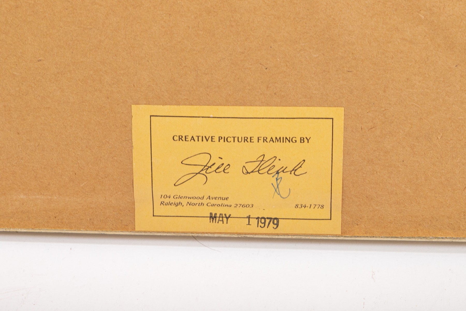 Vintage hand painted on silk featuring a lovely landscape scene in soft gentle colors. Mountains in the distance with trees, and a bridge with a person crossing over. Signed and stamped along the upper left corner. Displayed beneath glass in a 2-toned frame with a double mat that compliments the subject matter well. Dated from the framers in 1979 stamped el verso. Ready to hang!