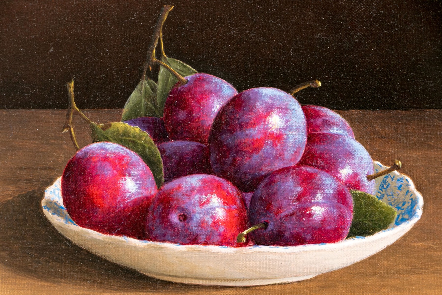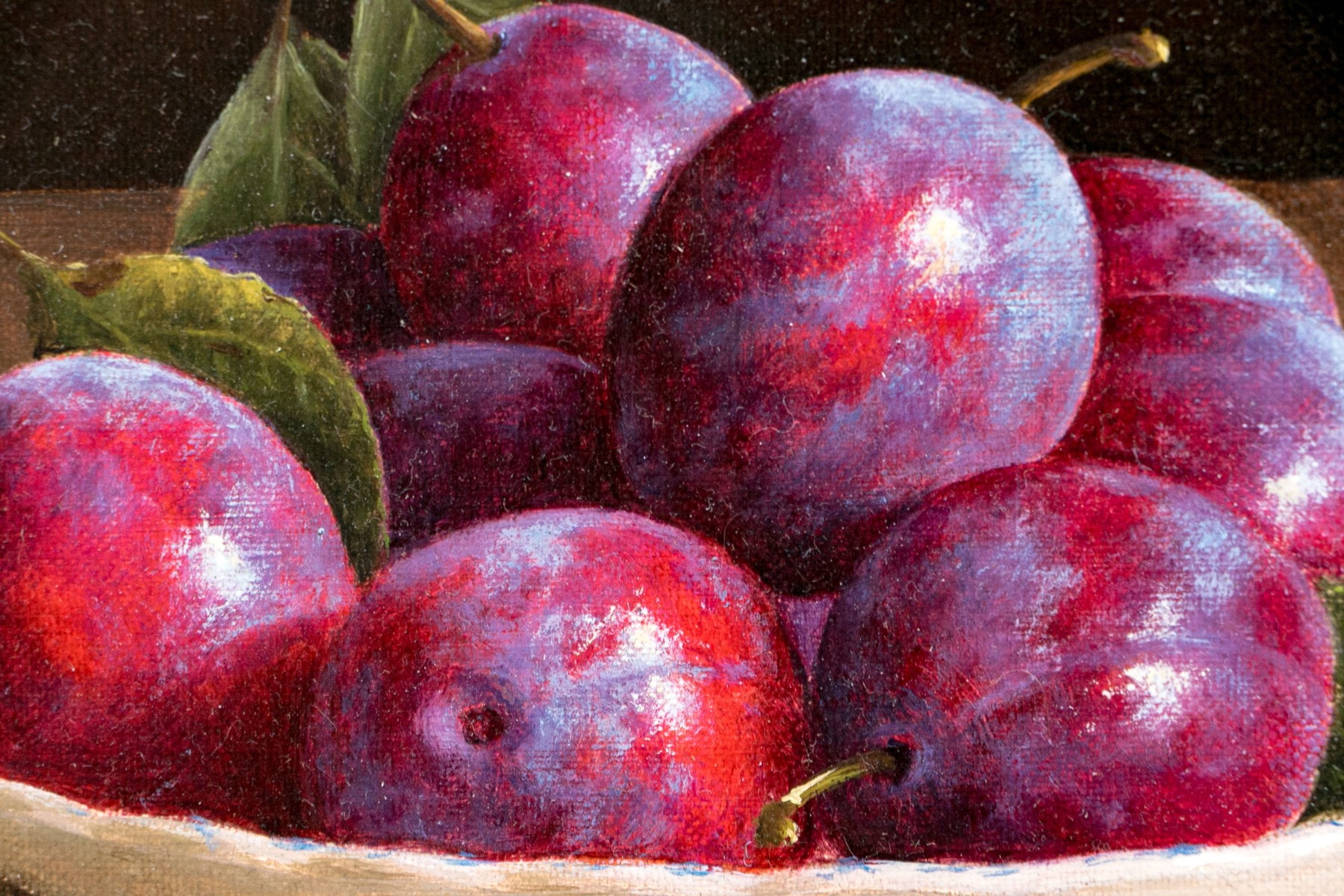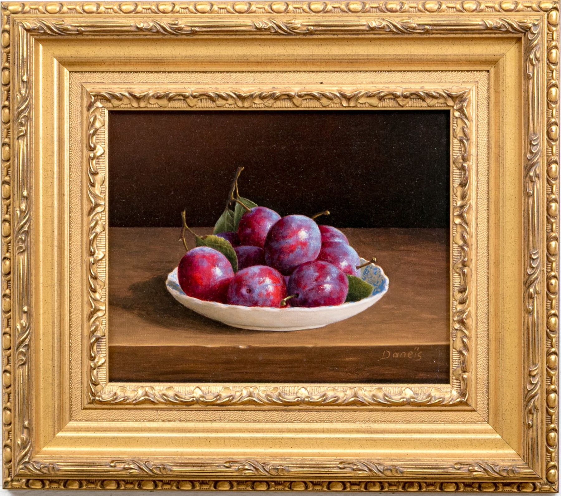 A well rendered oil painting on canvas depicting a still life of beautiful red and purple plums with leafy stems in a white bowl with a scalloped trim and subtle blue interior decoration. The bowl is set atop a wood table against a dark brown ground. Signed Danïs lower right.