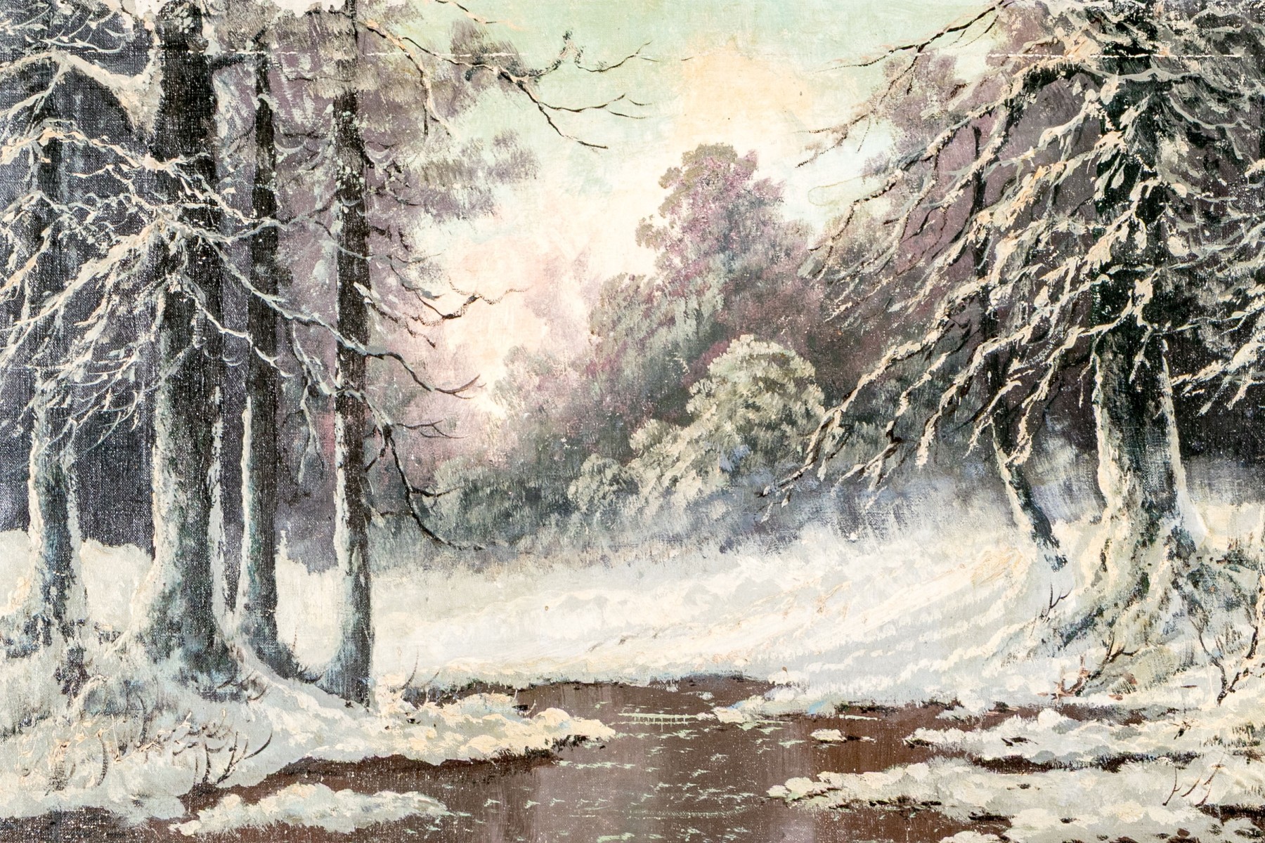 A delightful large scale oil painting on canvas depicting a winter landscape with river and snow covered land on either bank. Bare trees with pine trees in the distance can be seen. Signed lower left appearing Donna.