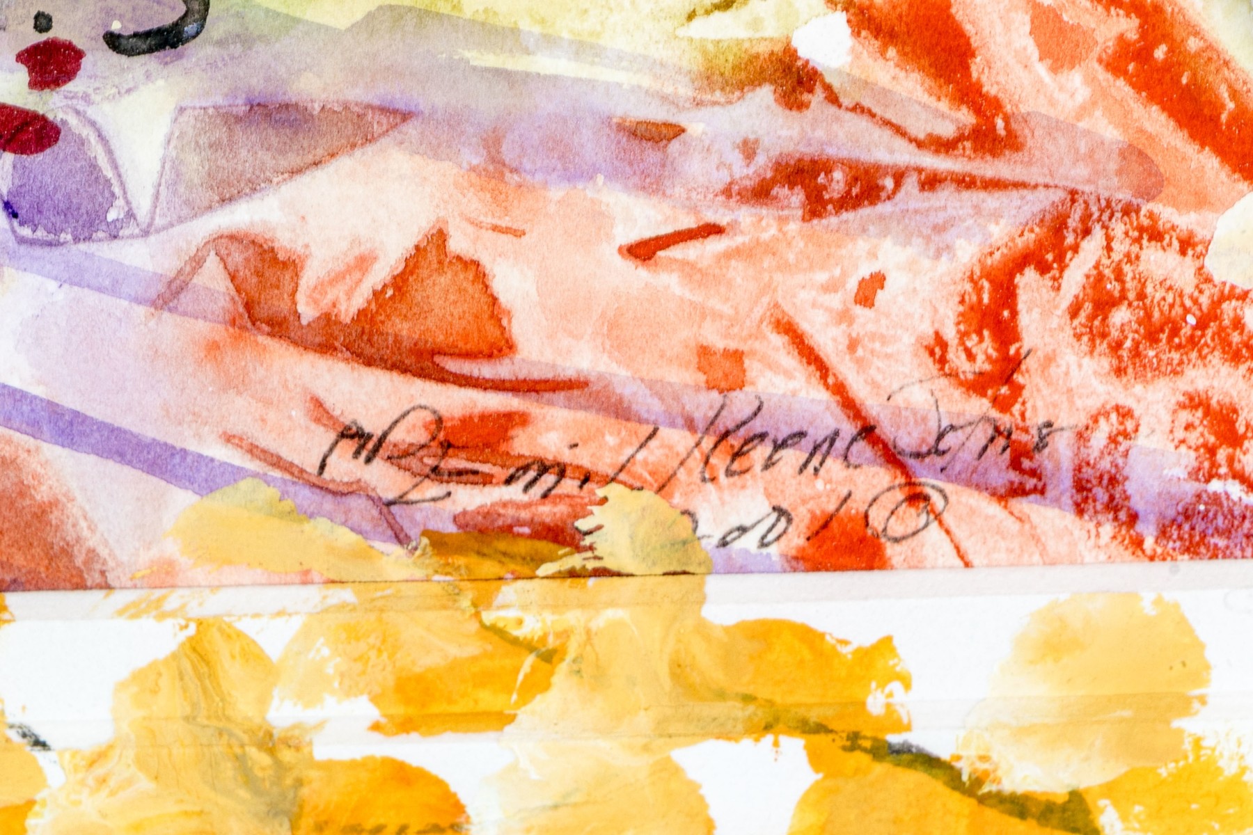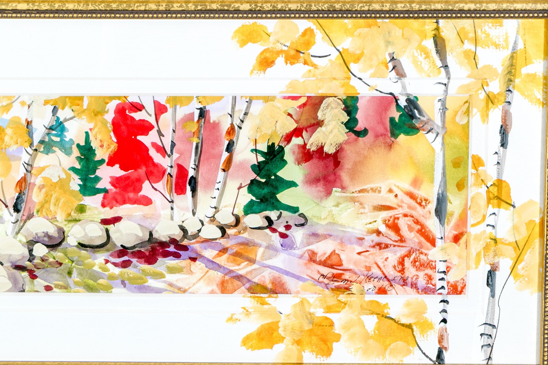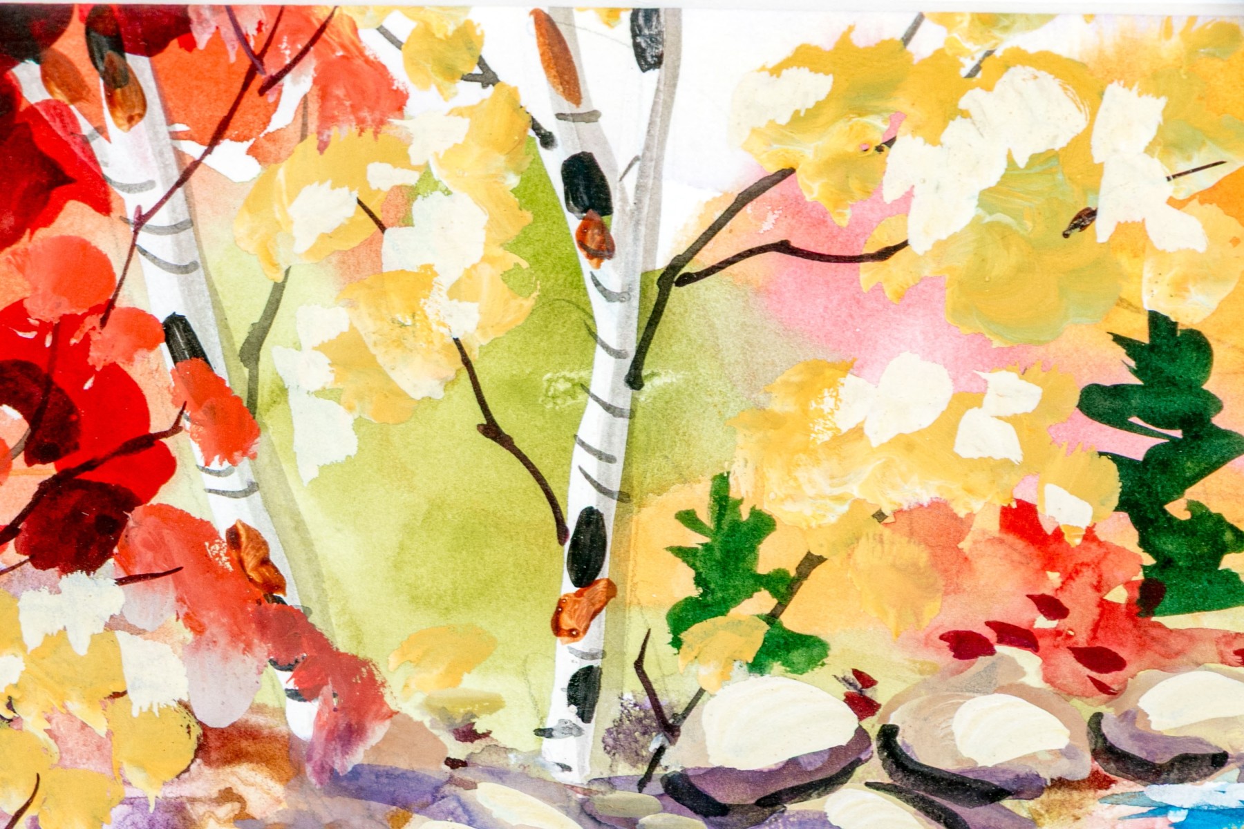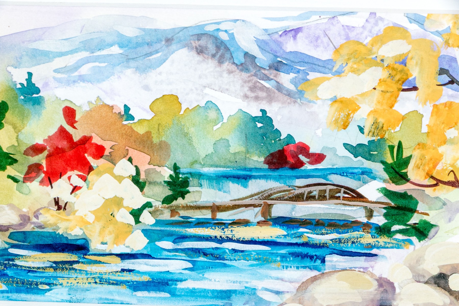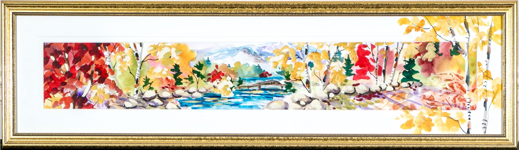 A gorgeous watercolor painting on paper depicting a sprawling Autumn landscape with a bridge crossing a dappled blue river flanked by vibrant red, yellow, and green trees and stony banks. The long horizontal composition features two birch trees with yellow foliage overlaying the scene and mat to the right. Signed appearing Emil Reese lower right.