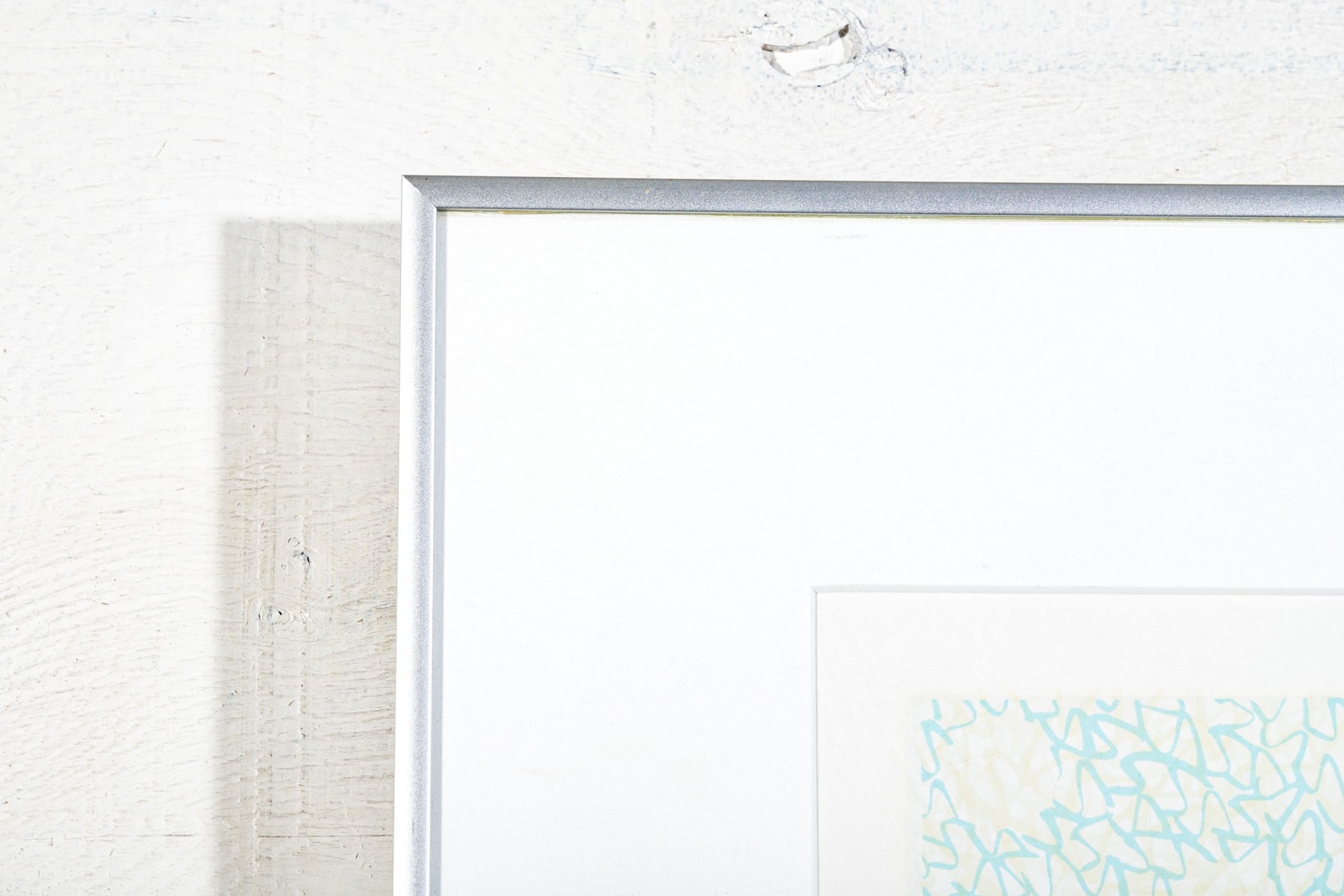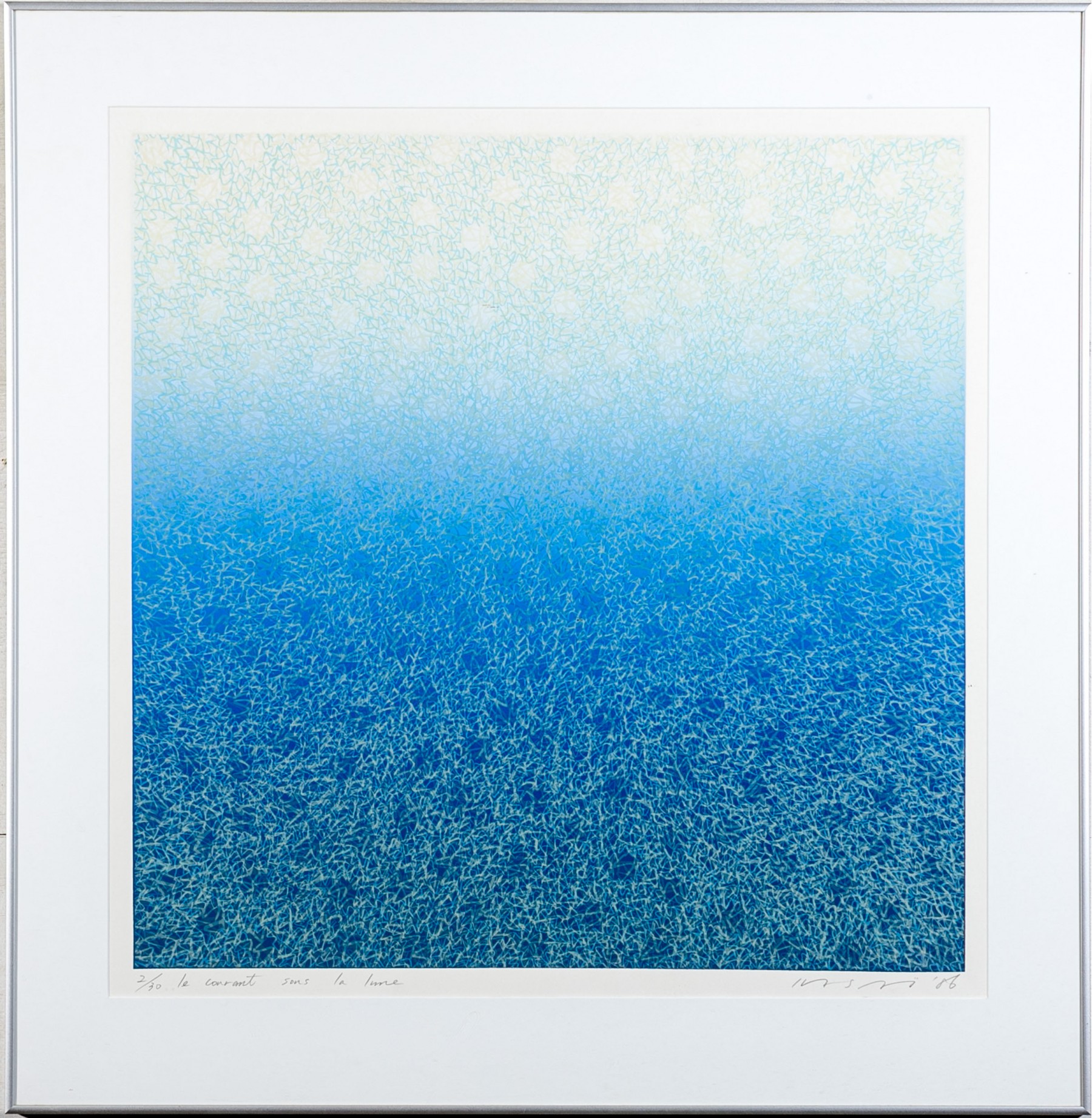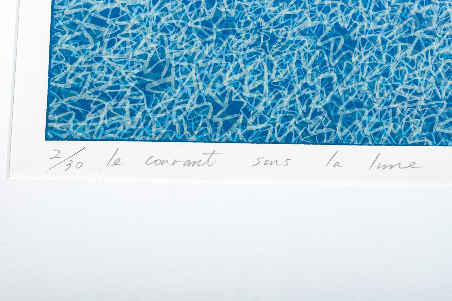 Pencil signed and dated '86 lower right. Numbered 2/30 and titled in French " Le courant sous la lune" lower left. An intricate interlaced design in green on luminous white above, moving down to white on gradients of blue. Finely matted in a museum quality silver tone frame with glass.