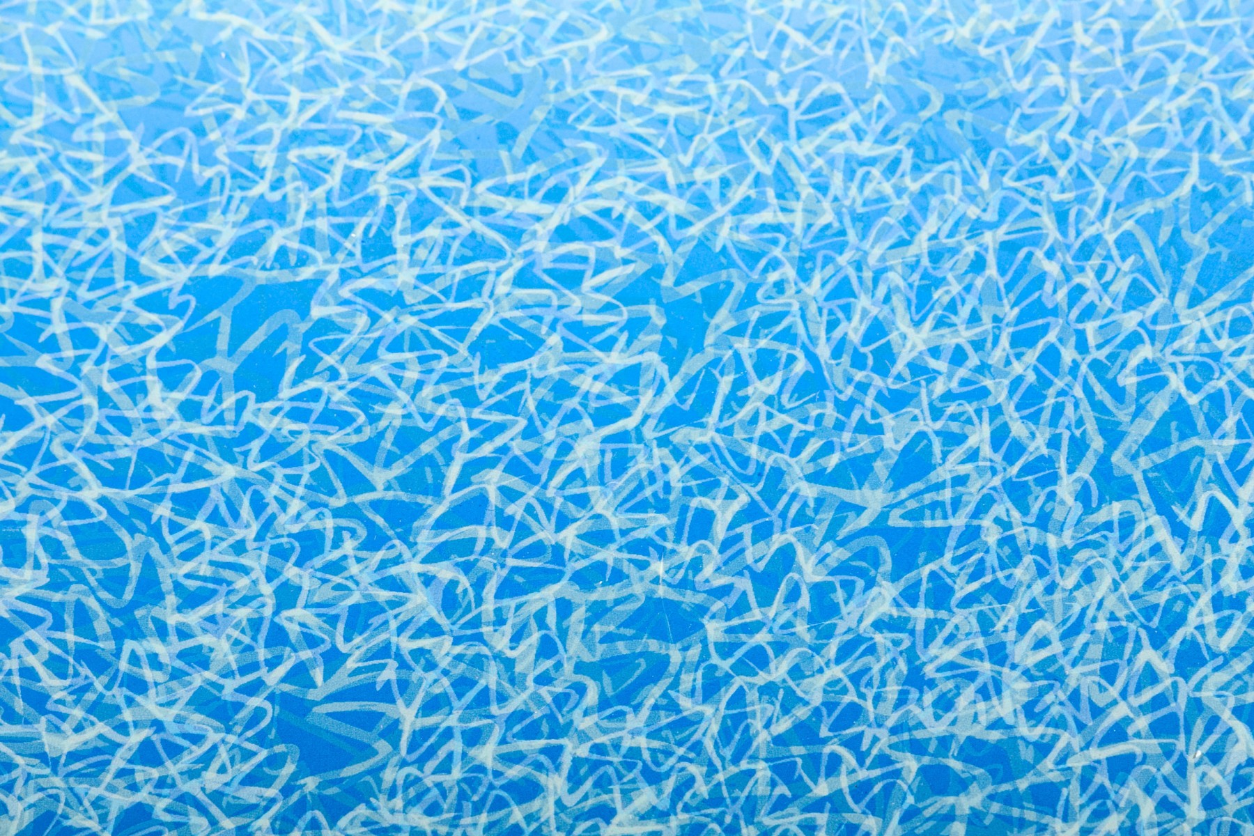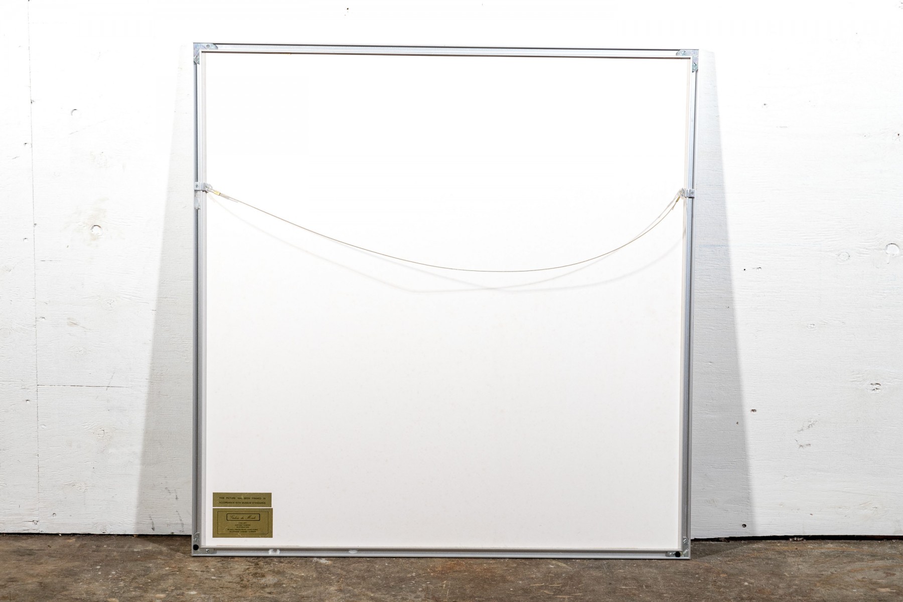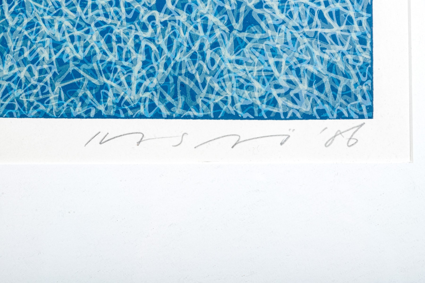 Pencil signed and dated '86 lower right. Numbered 2/30 and titled in French " Le courant sous la lune" lower left. An intricate interlaced design in green on luminous white above, moving down to white on gradients of blue. Finely matted in a museum quality silver tone frame with glass.