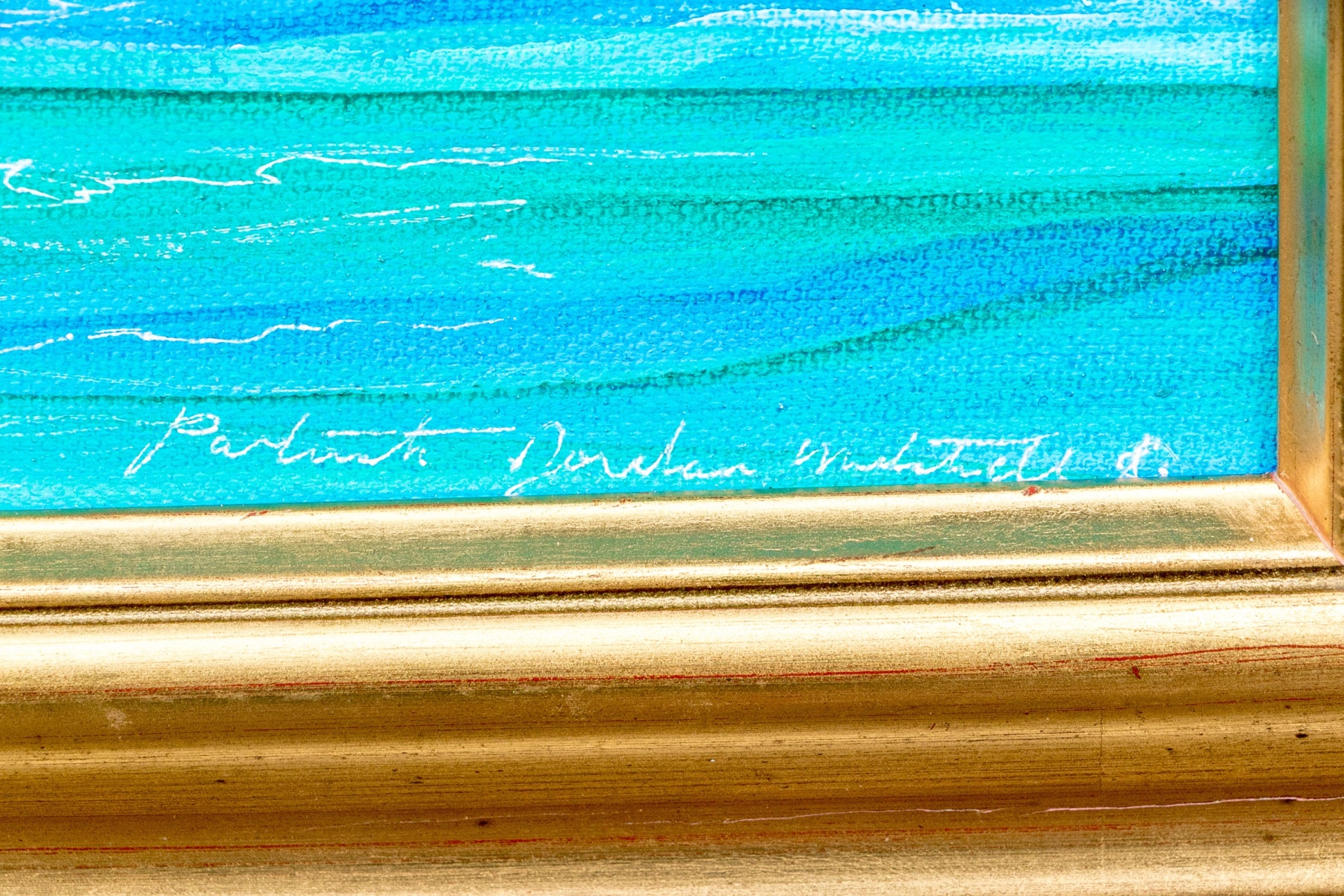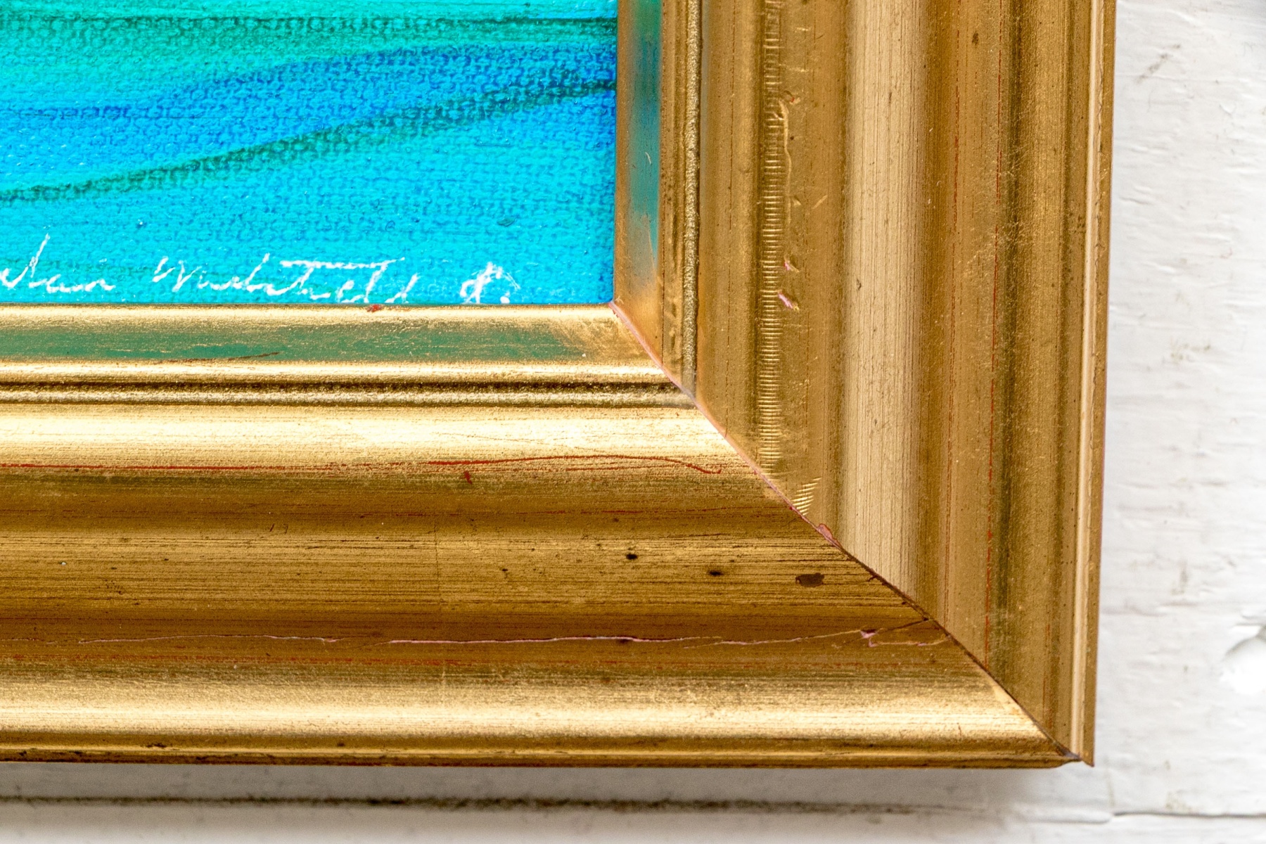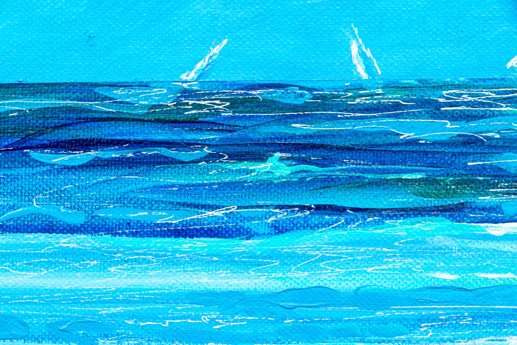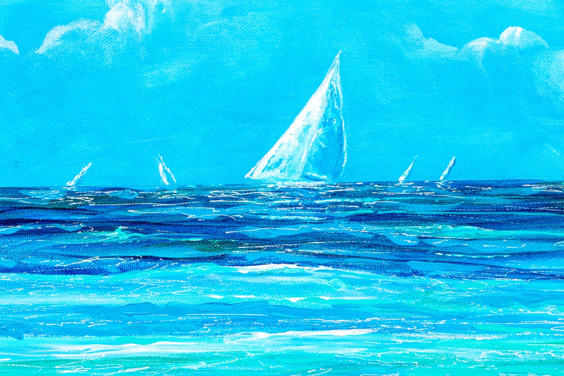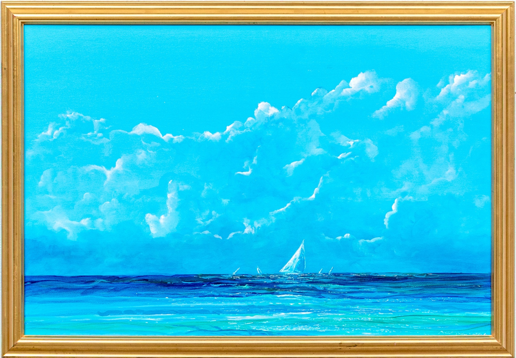 Signed indistinctly lower right. A purple blue-green sea with the white sailboats in a regatta under bright blue skies dotted with the clouds. Presented in a gilt frame.