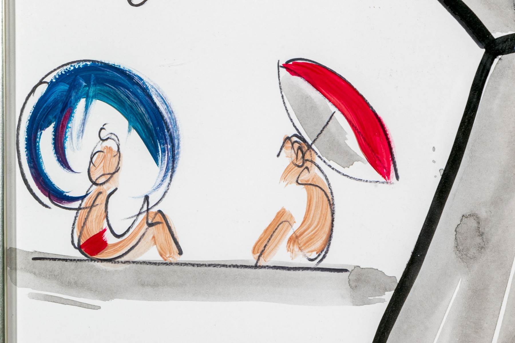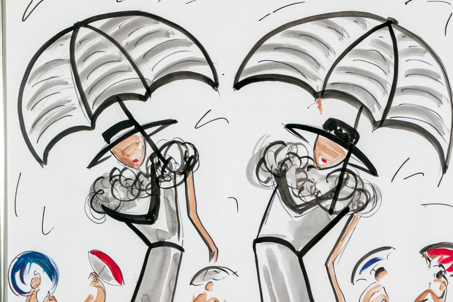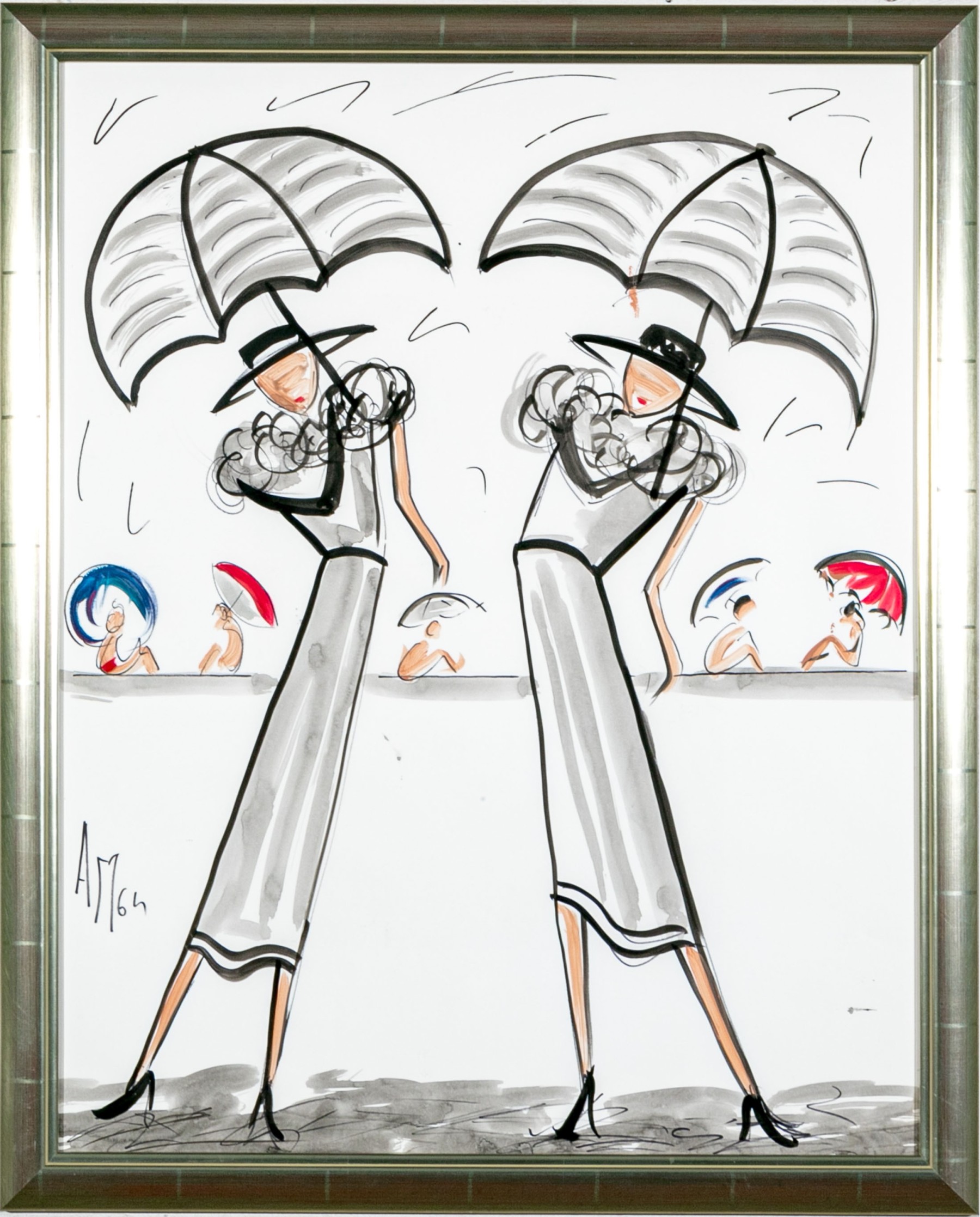 A fabulous illustration of two stylish beauties dressed in matching outfits with gray striped skirts, ruffled necks, black hats and long black gloves. Each holds an umbrella. They stand at the shore with sun bathers under umbrellas in the background. Initialed AM and dated lower left.
