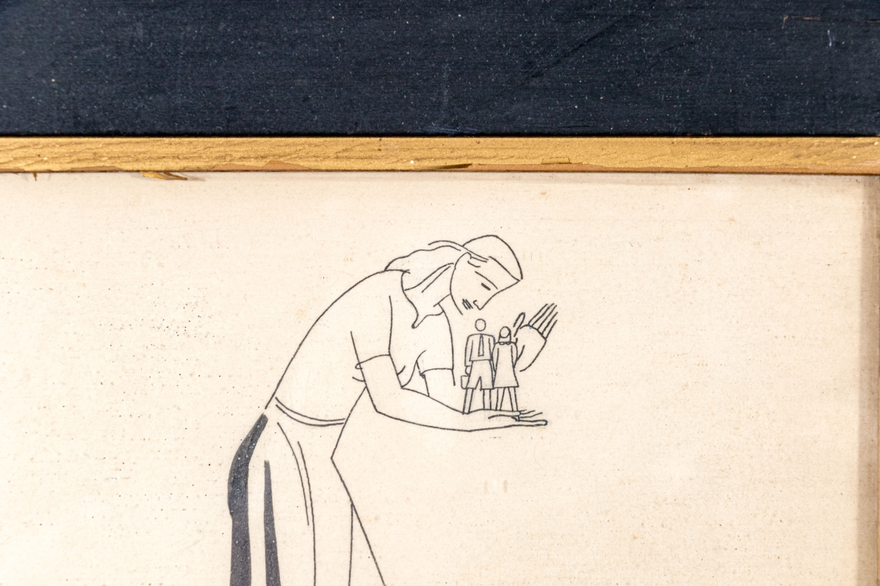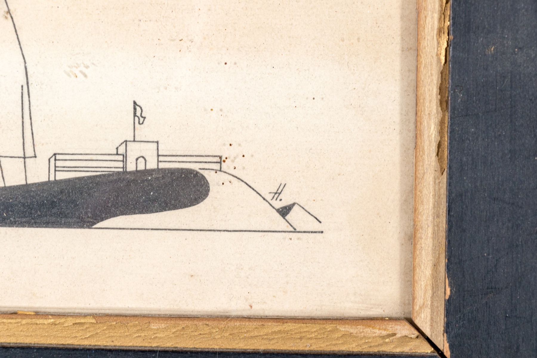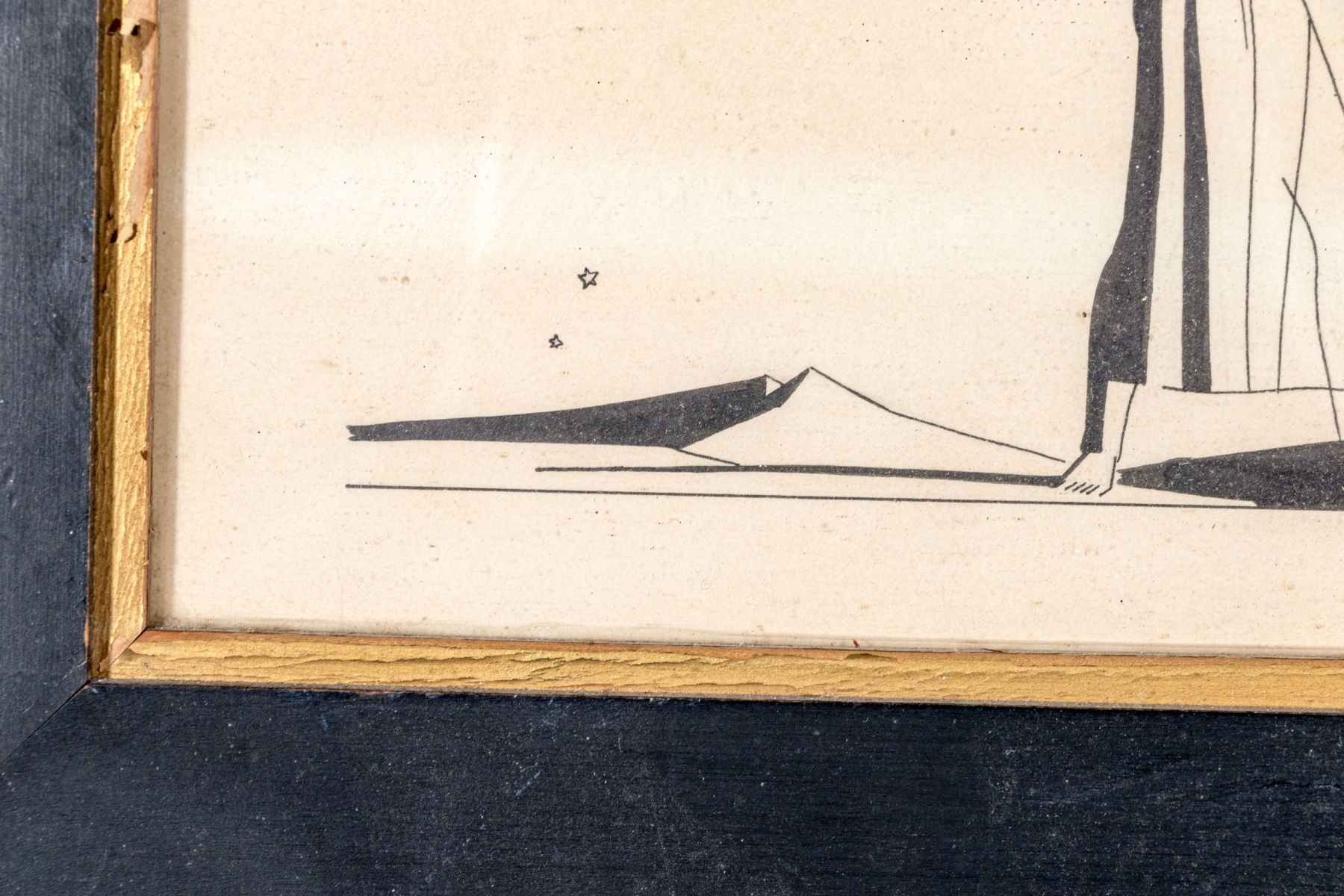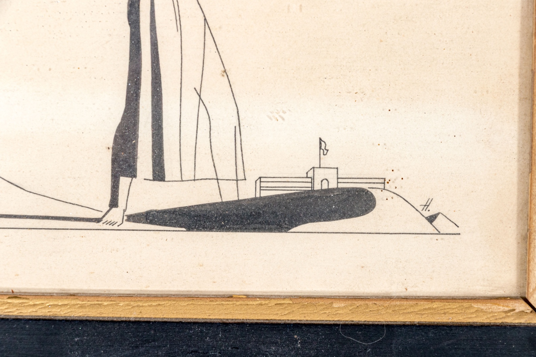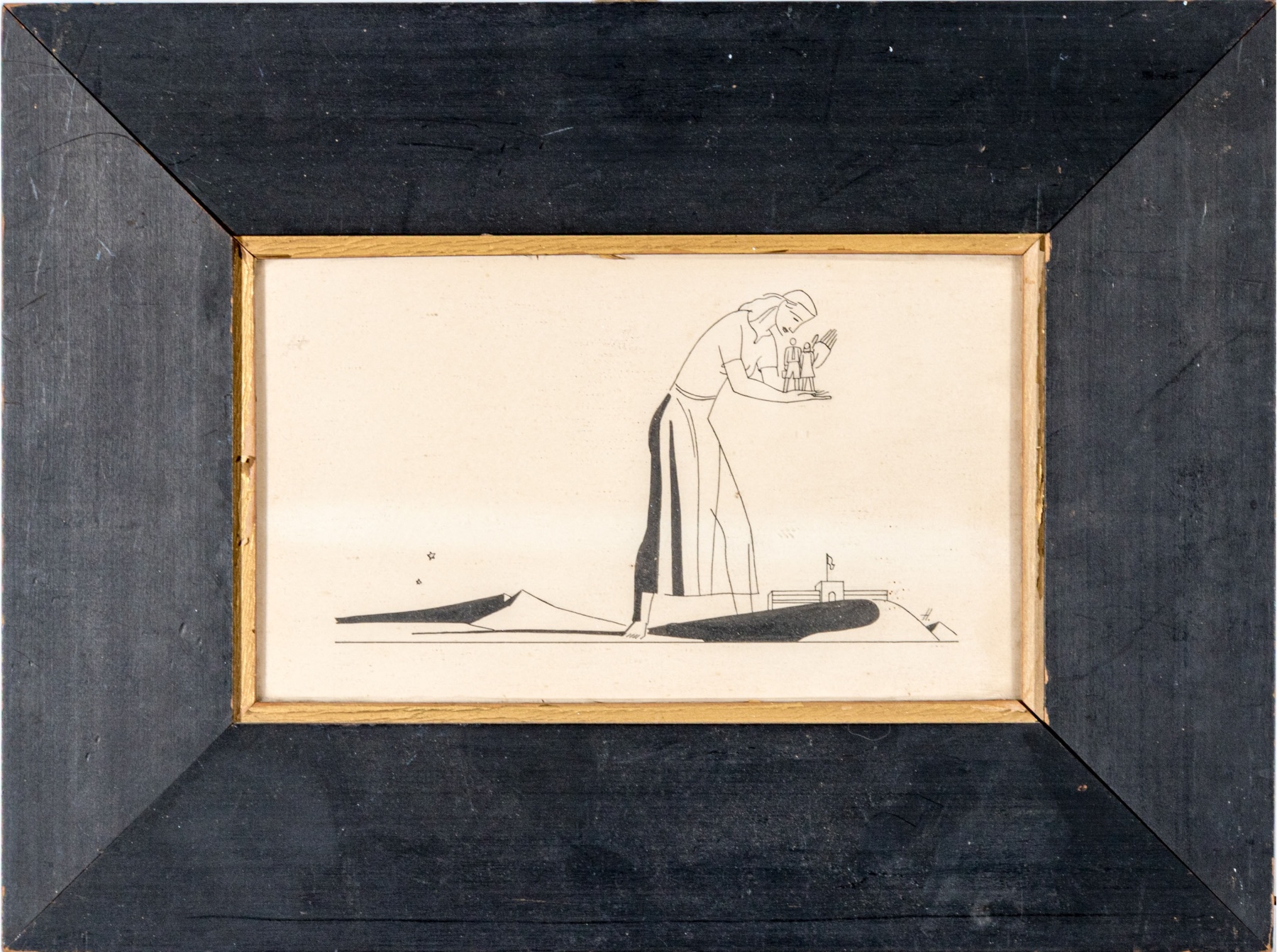 An intriguing ink on paper drawing of a large woman carrying a man and woman in her hands over a building along dunes. Signed H. lower right. Displayed in a black beveled frame with a gilt inner border.
