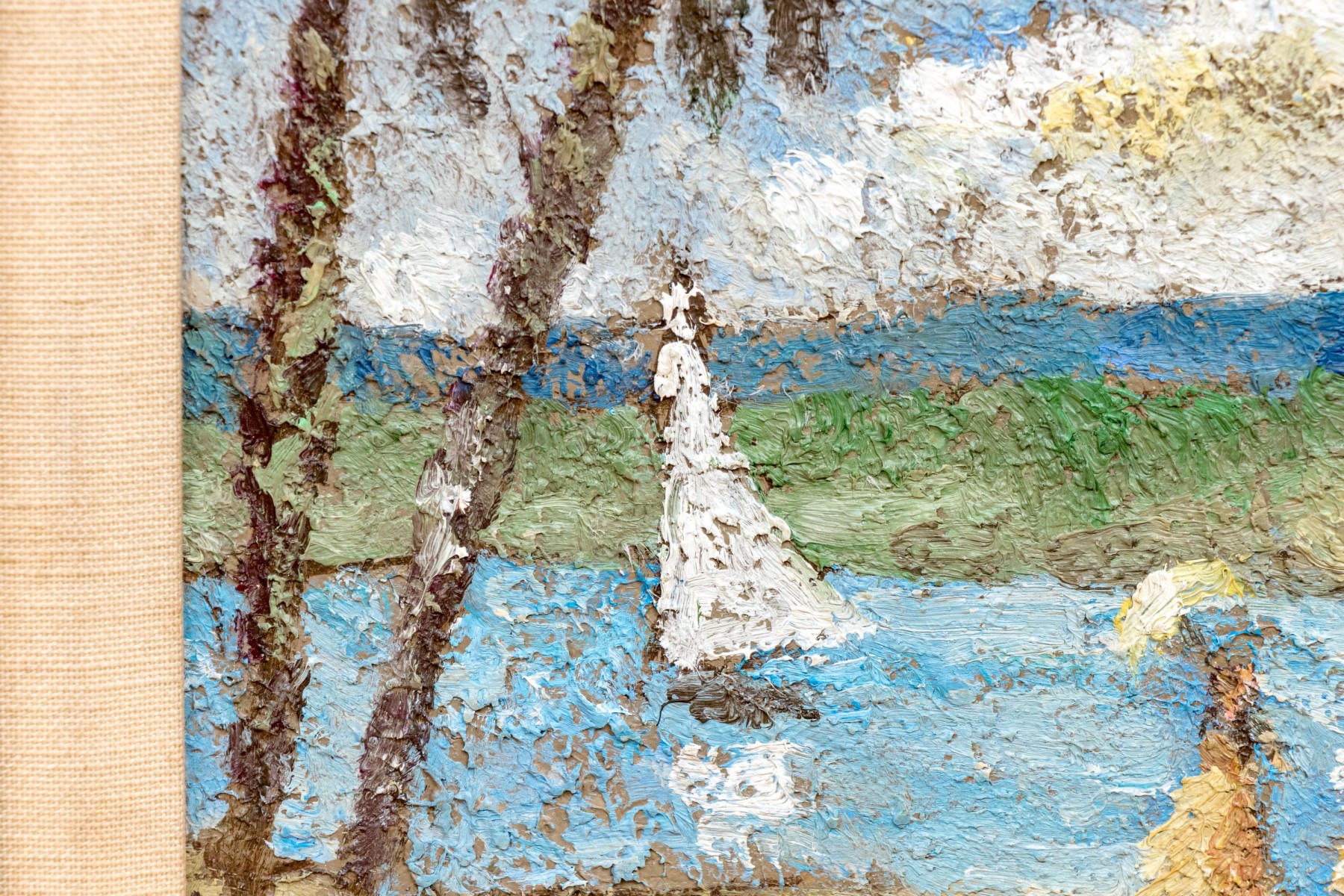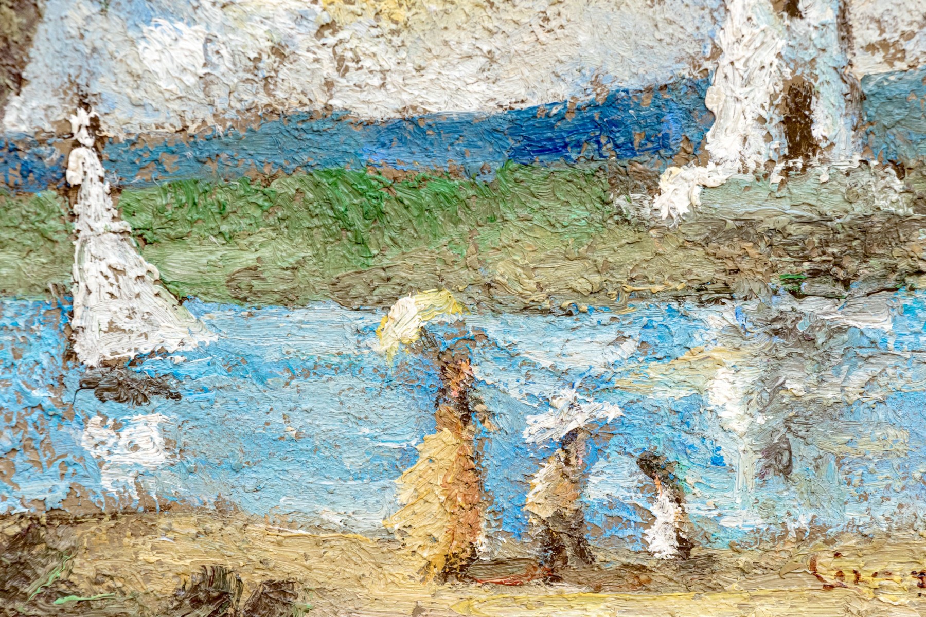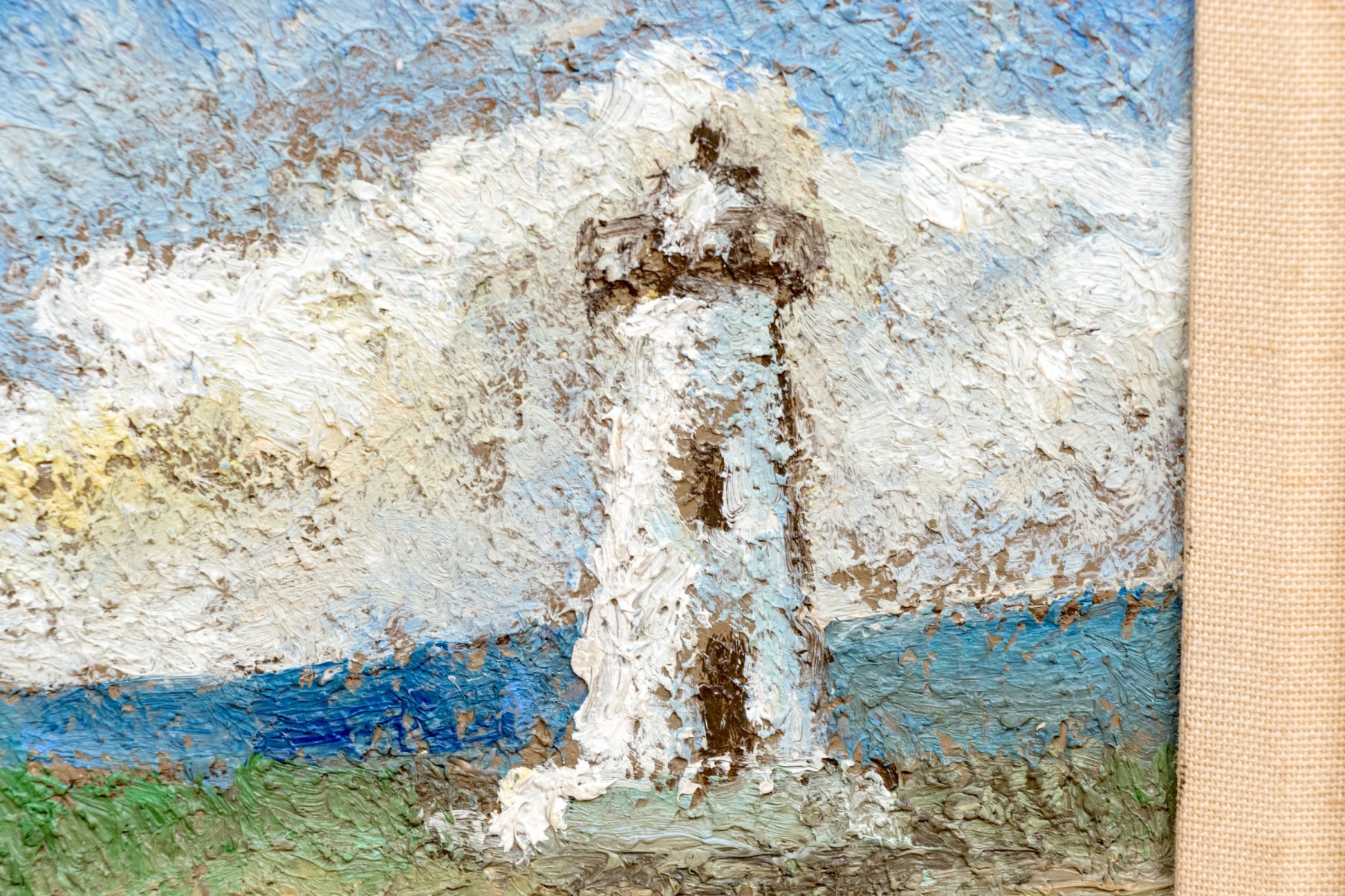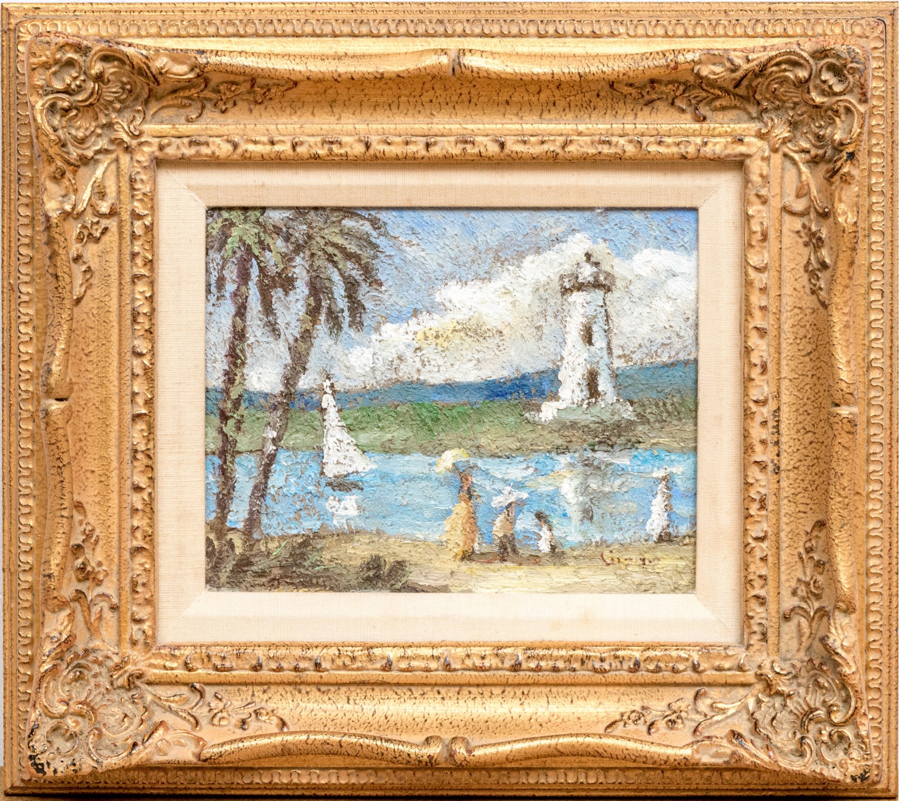 A highly textural painting on canvas painted in the plein air, Impressionist manner depicting a group of four figures, three with parasols, palm trees, water, a lighthouse and big sky behind. Signed indistinctly lower right.