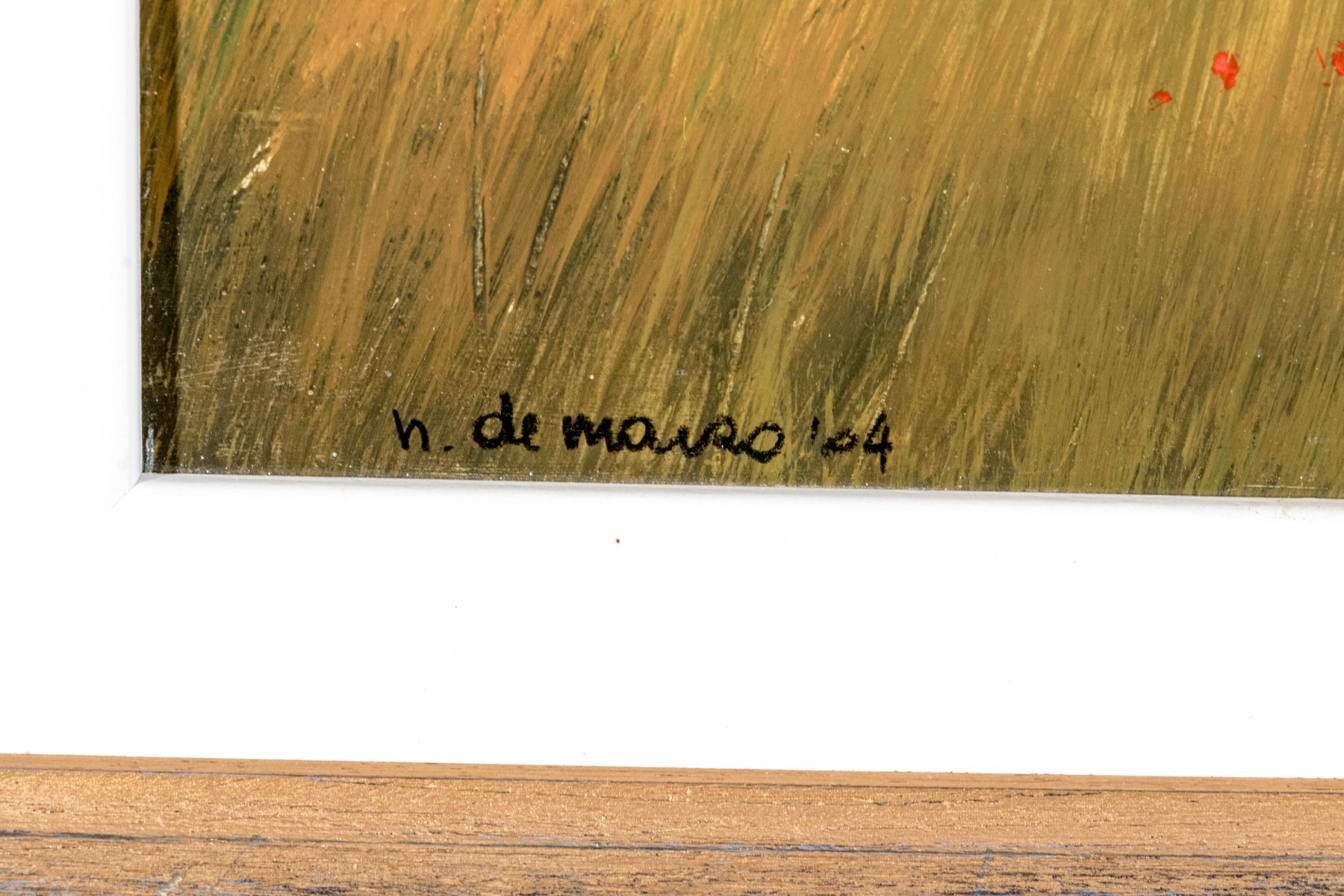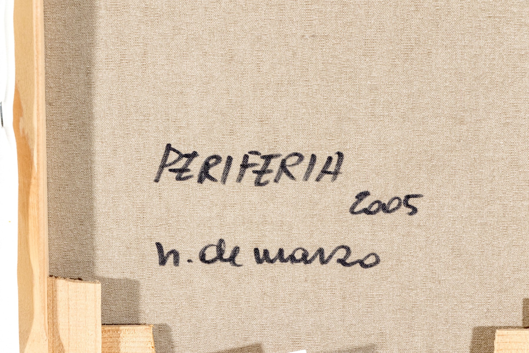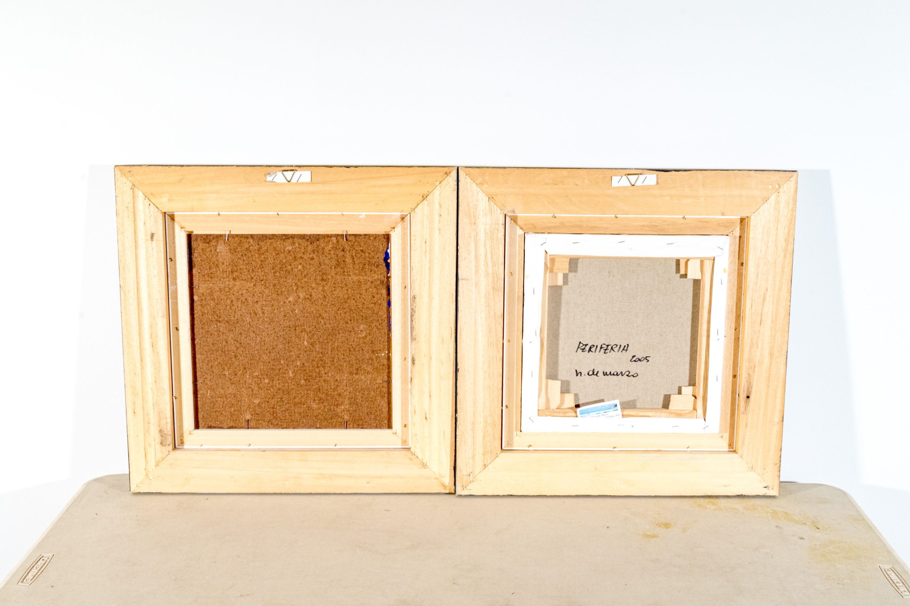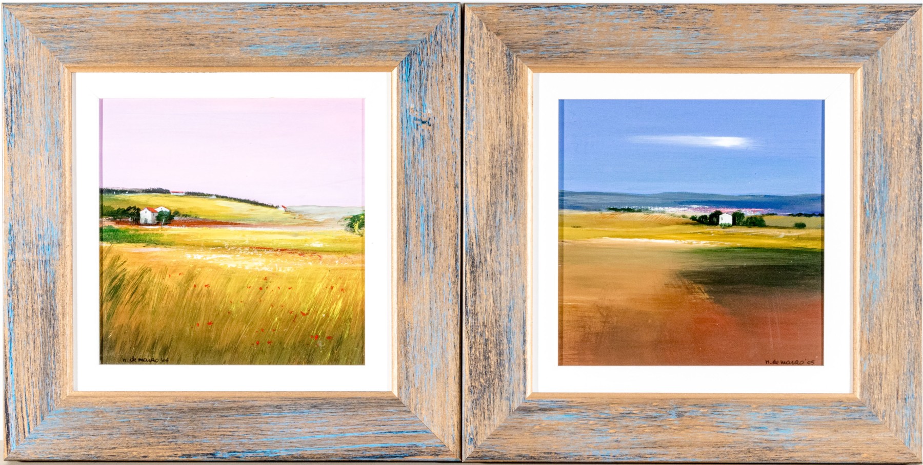 A duo of Italian oil paintings depicting calming pastoral landscapes with rural homesteads along golden fields, one titled "Periferia" on the verso. Both signed appearing "n. de marzo." and dated 2004 and 2005. Displayed matted without glass in matching wood frames with rustic teal blue stripped paint finishes.